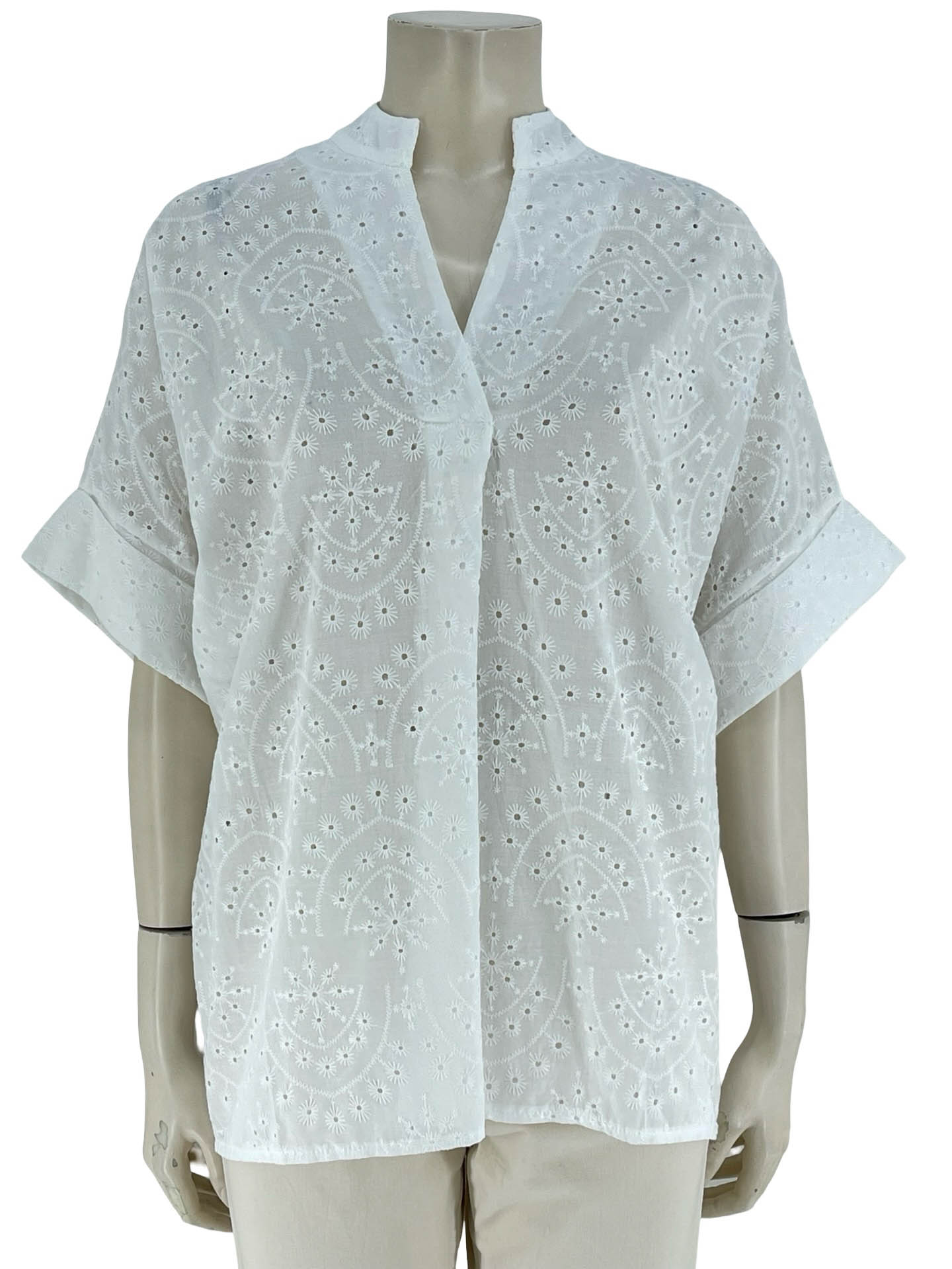 Γυναικεία μπλούζα μπροντερί V με μάο γιακά. Κουφοπιέτα στο εμπρός μέρος και στην πλάτη. Κοντό μανίκι με ασύμμετρο τελείωμα.