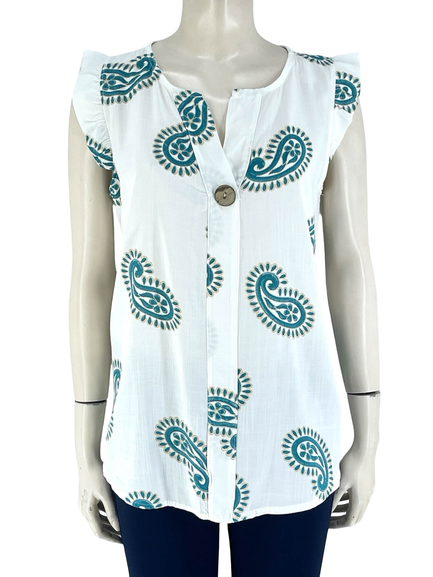 Γυναικεία μπλούζα εμπριμέ βισκόζ, λαιμόκοψη V με διακοσμητικό κουμπάκι. Αμάνικο με βολάν τελείωμα. Ίσιο τελείωμα. Καλύπτει από NoL έως No2XL.