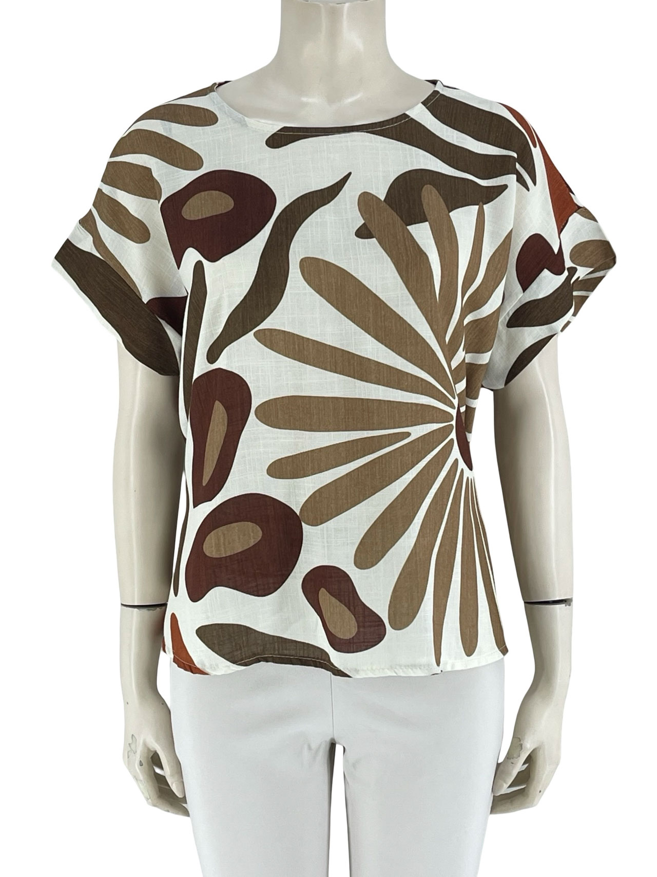 Γυναικεία μπλούζα βισκόζ, εμπριμέ, λαιμόκοψη. Κουμπάκια στην πλάτη και κουφοπιέτα σε άλφα γραμμή. Καλύπτει από NoM έως NoXL.