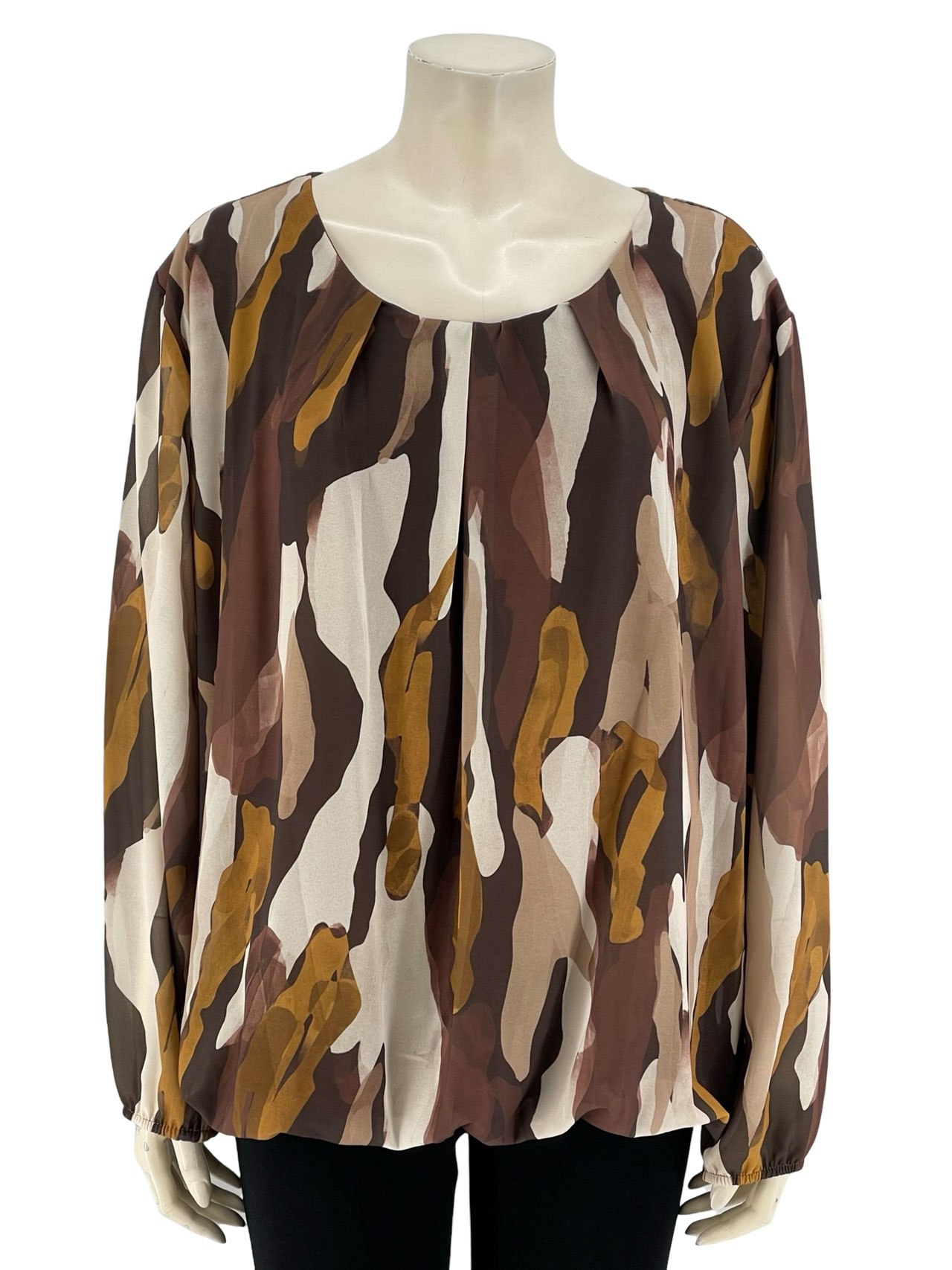 Μπλούζα εμπριμέ ζορζέτα φοδραρισμένη στο εσωτερικό της. Λαιμόκοψη με πιέτες στο εμπρός μέρος και μακρύ μανίκι διαφάνεια με λάστιχο στο τελείωμα. Καλύπτει από ΝοL έως Νο3XL.