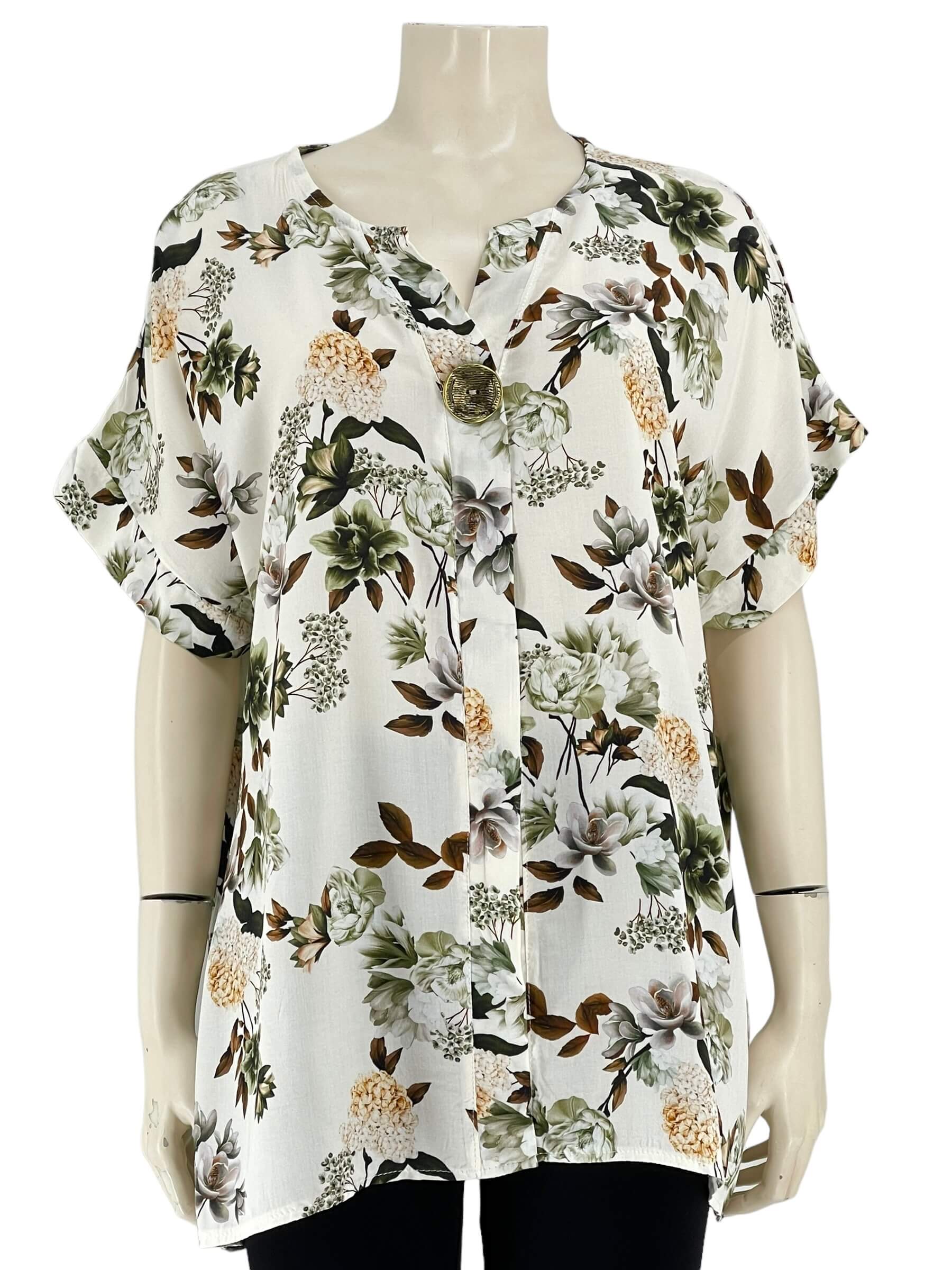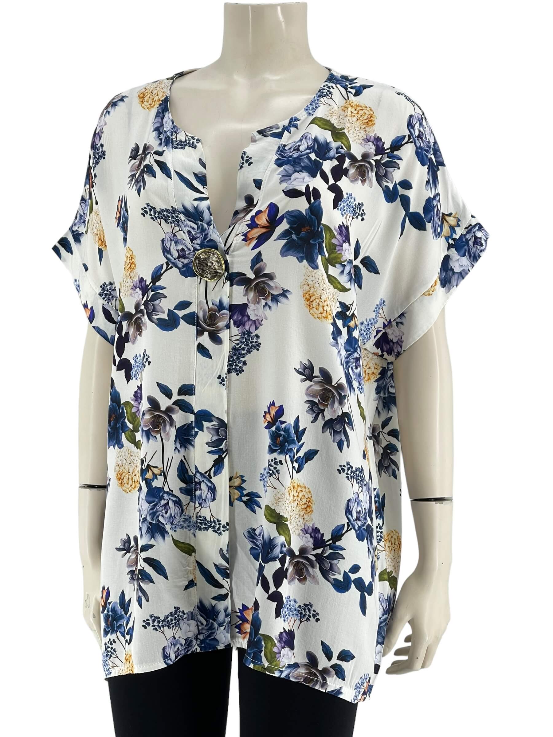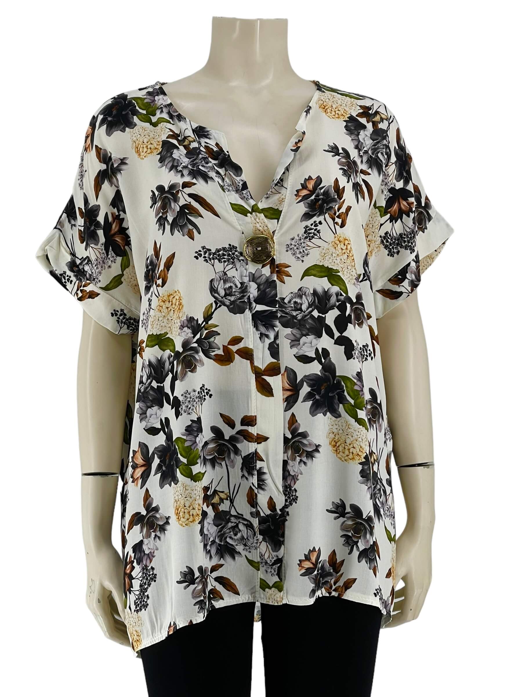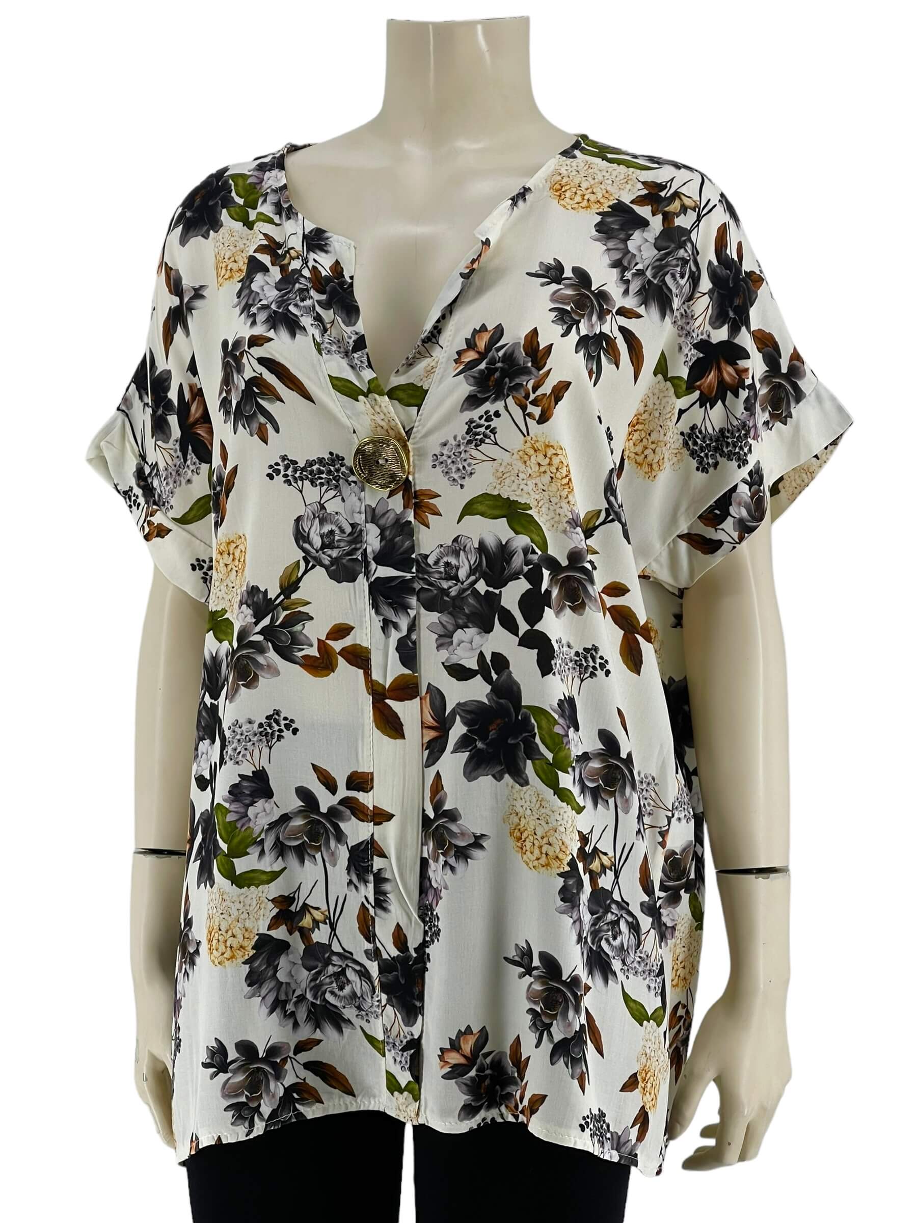 Μπλούζα γυναικεία βισκόζ ελαστική φλοράλ με διακοσμητικό κουμπί στο V.Ίσιο τελείωμα.Κοντό μανίκι.Καλύπτει από νούμερα:L εώς 3XL.