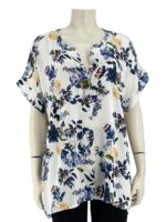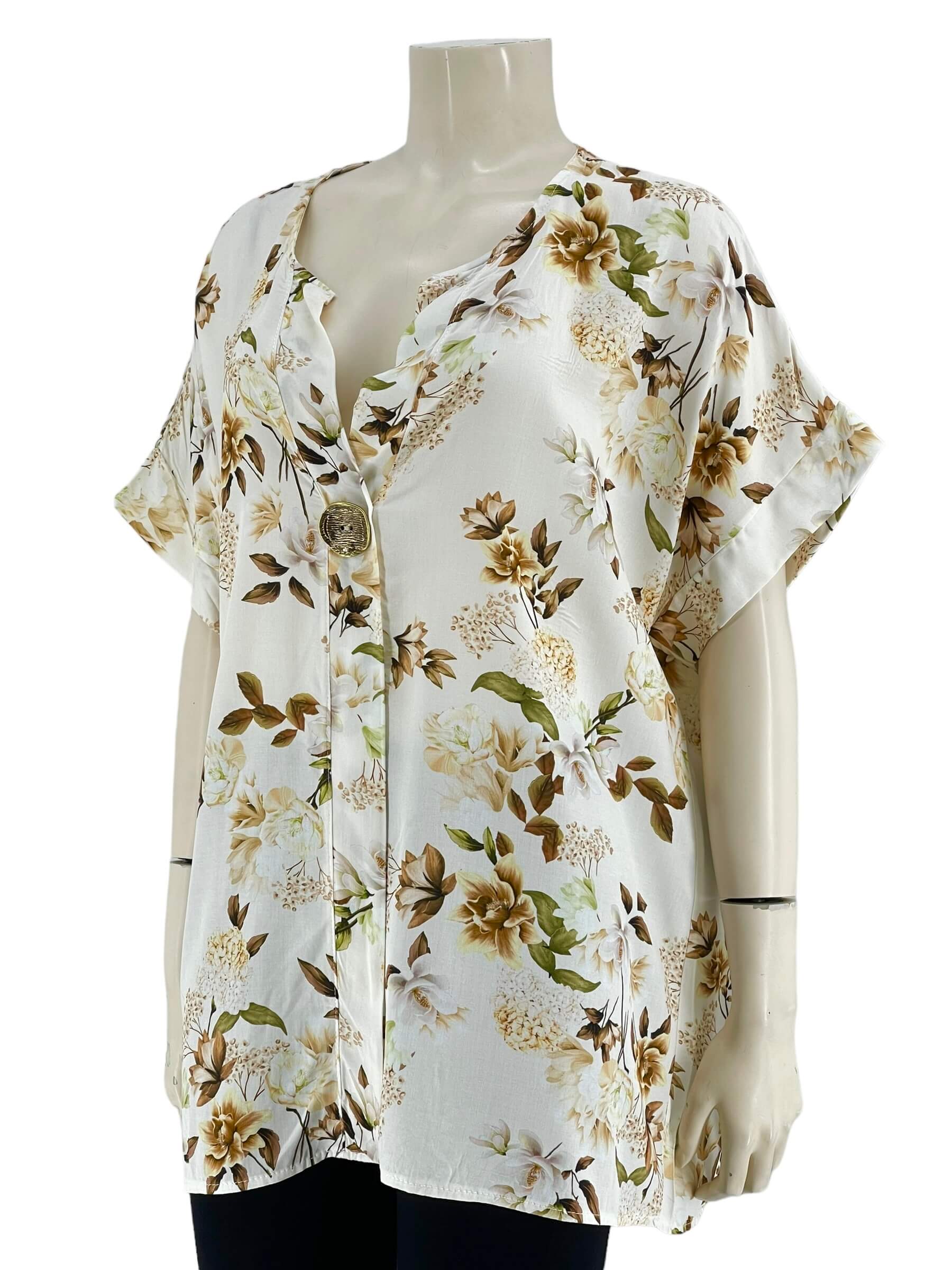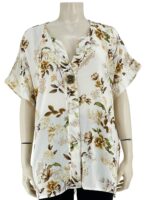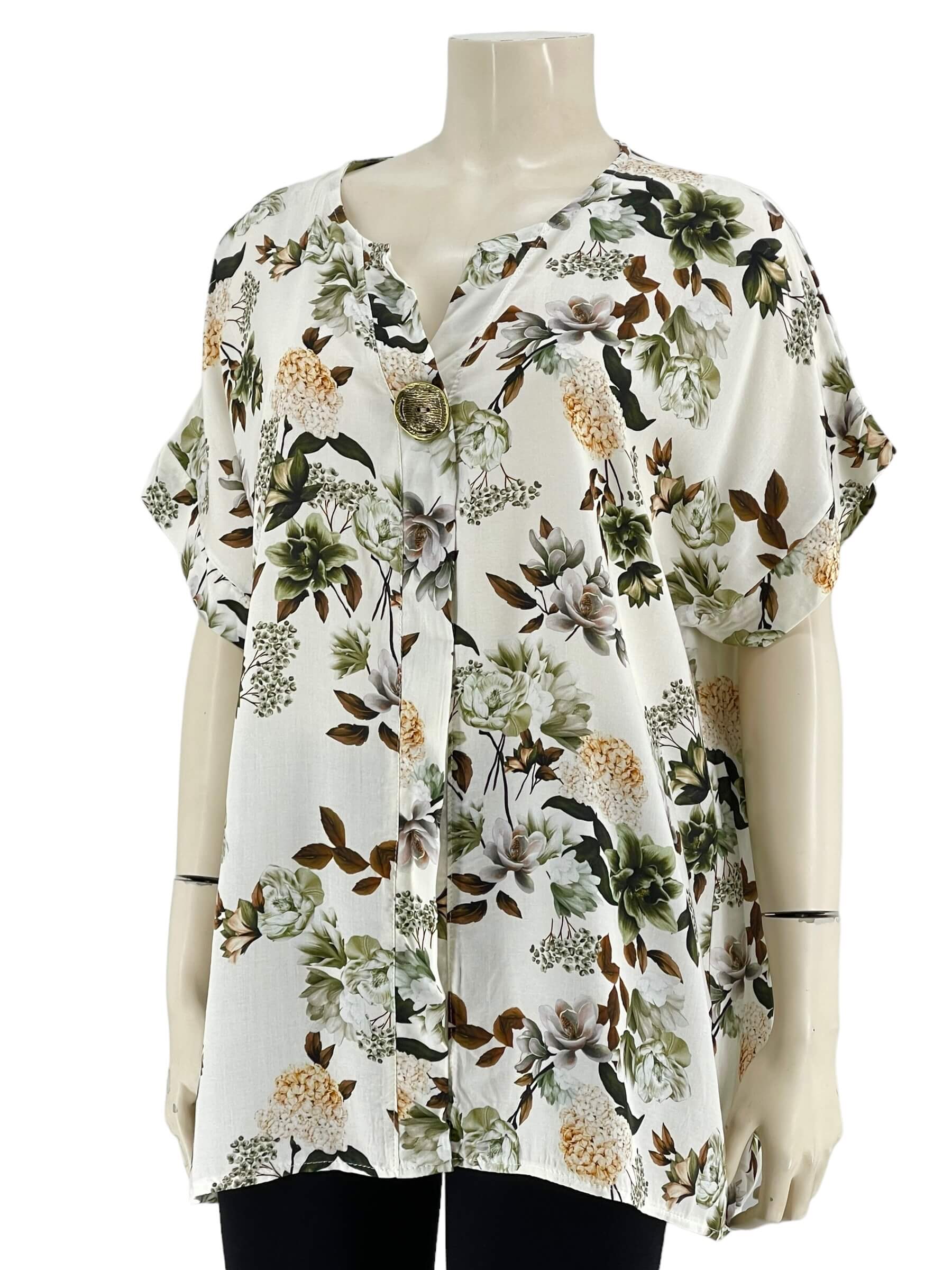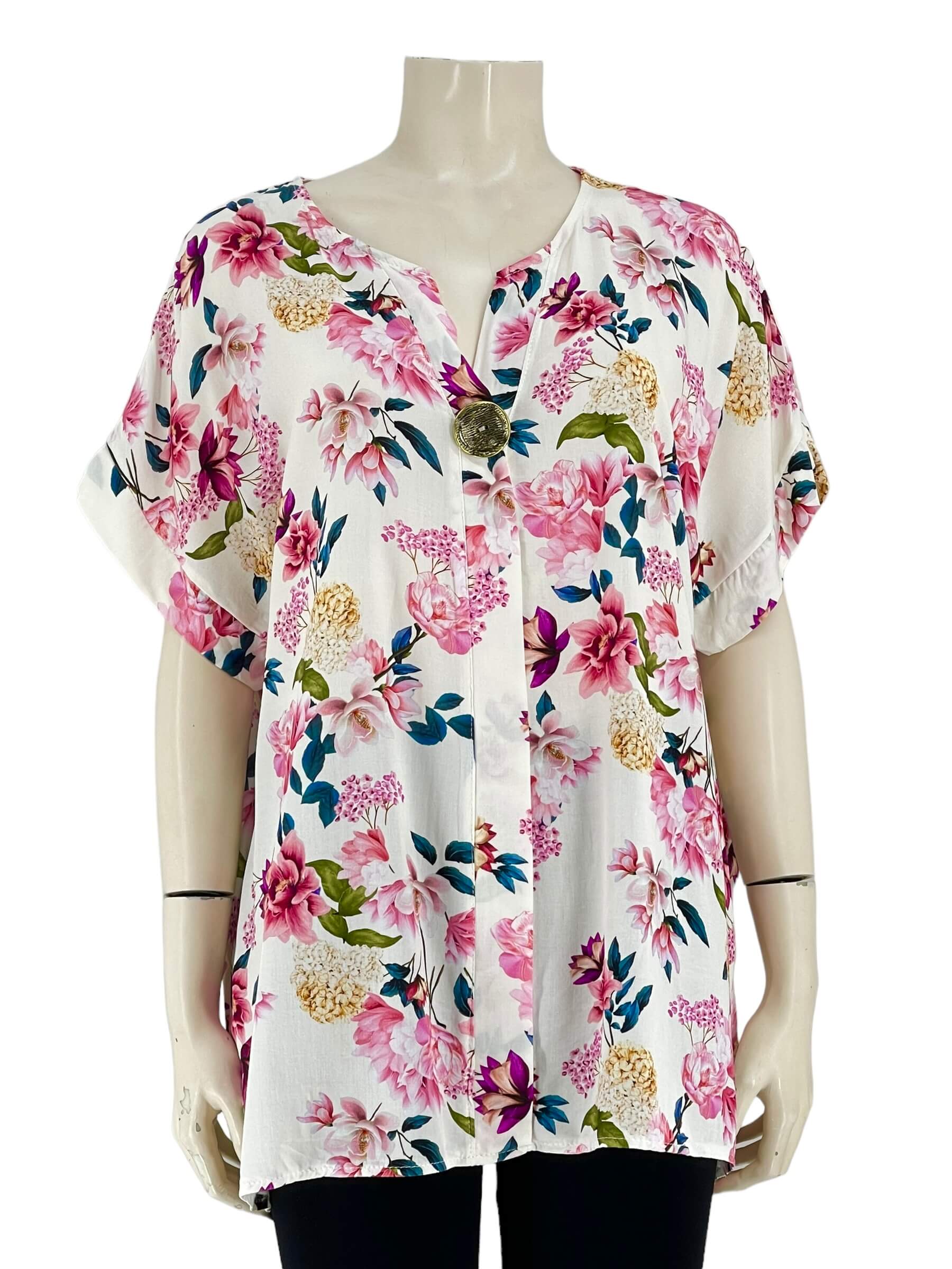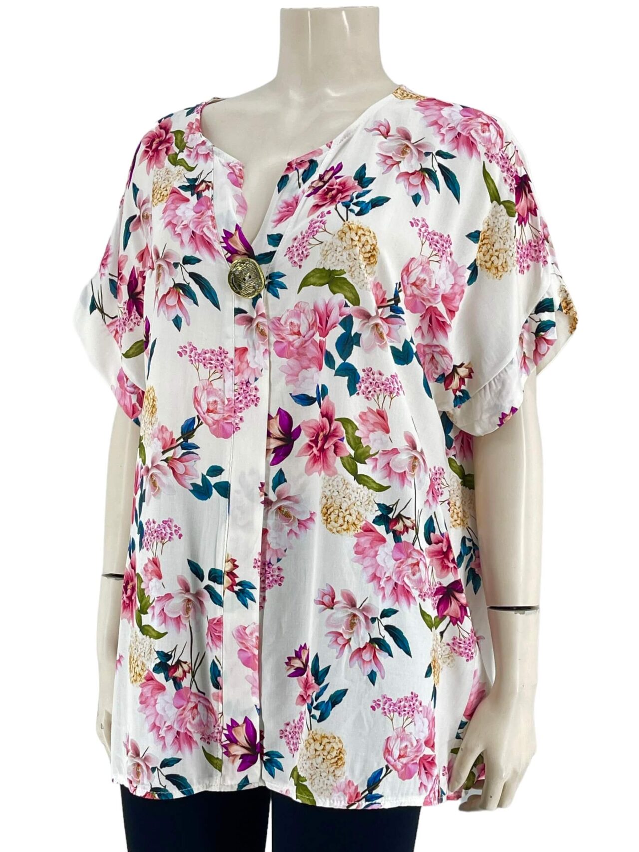 Μπλούζα γυναικεία βισκόζ ελαστική φλοράλ με διακοσμητικό κουμπί στο V.Ίσιο τελείωμα.Κοντό μανίκι.Καλύπτει από νούμερα:L εώς 3XL.