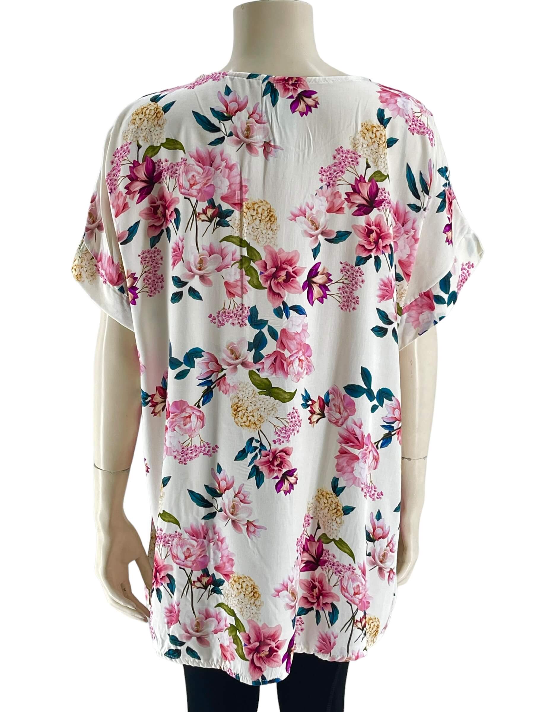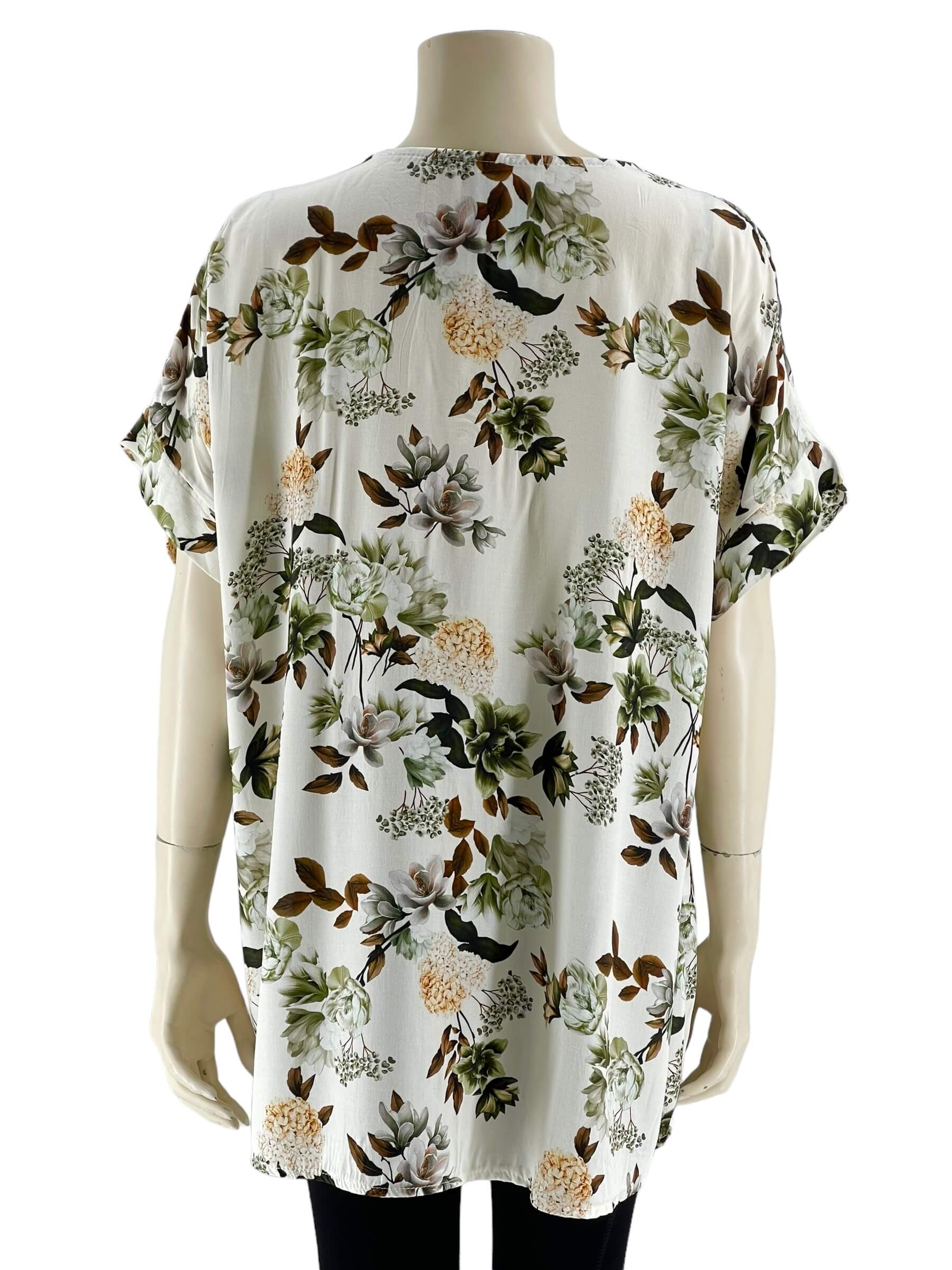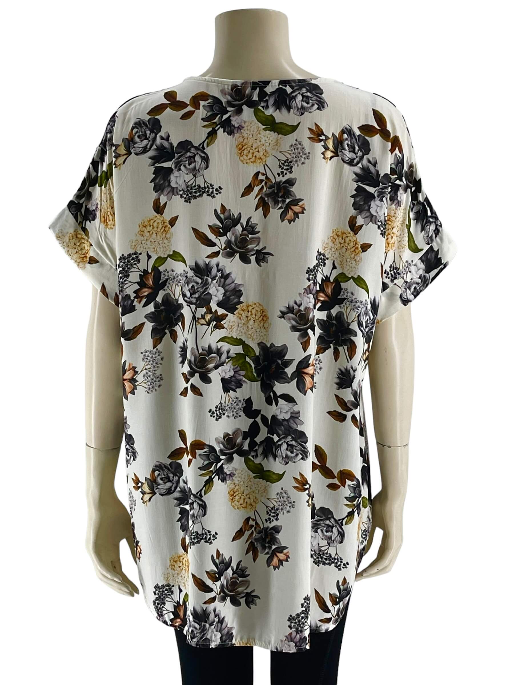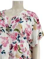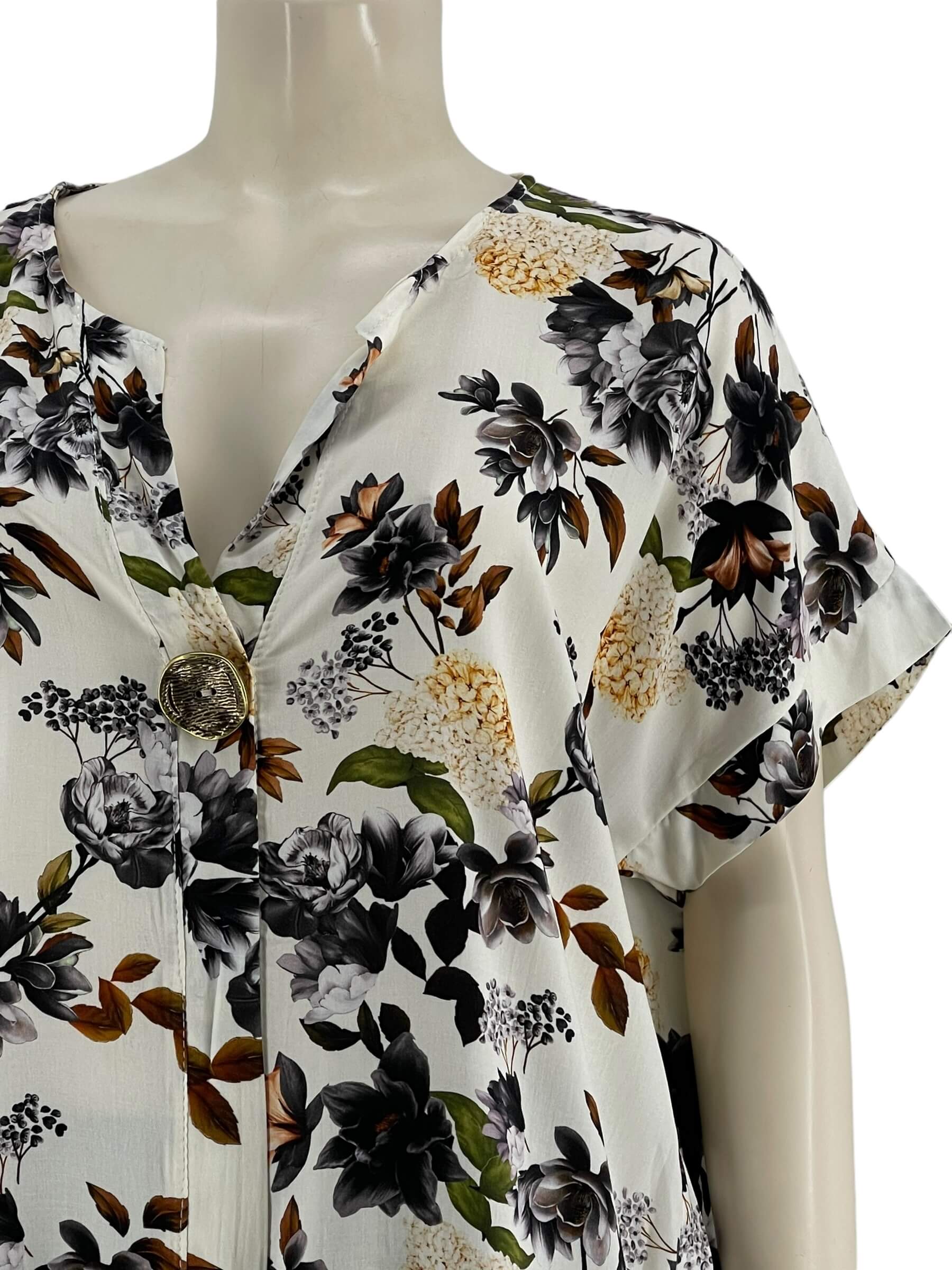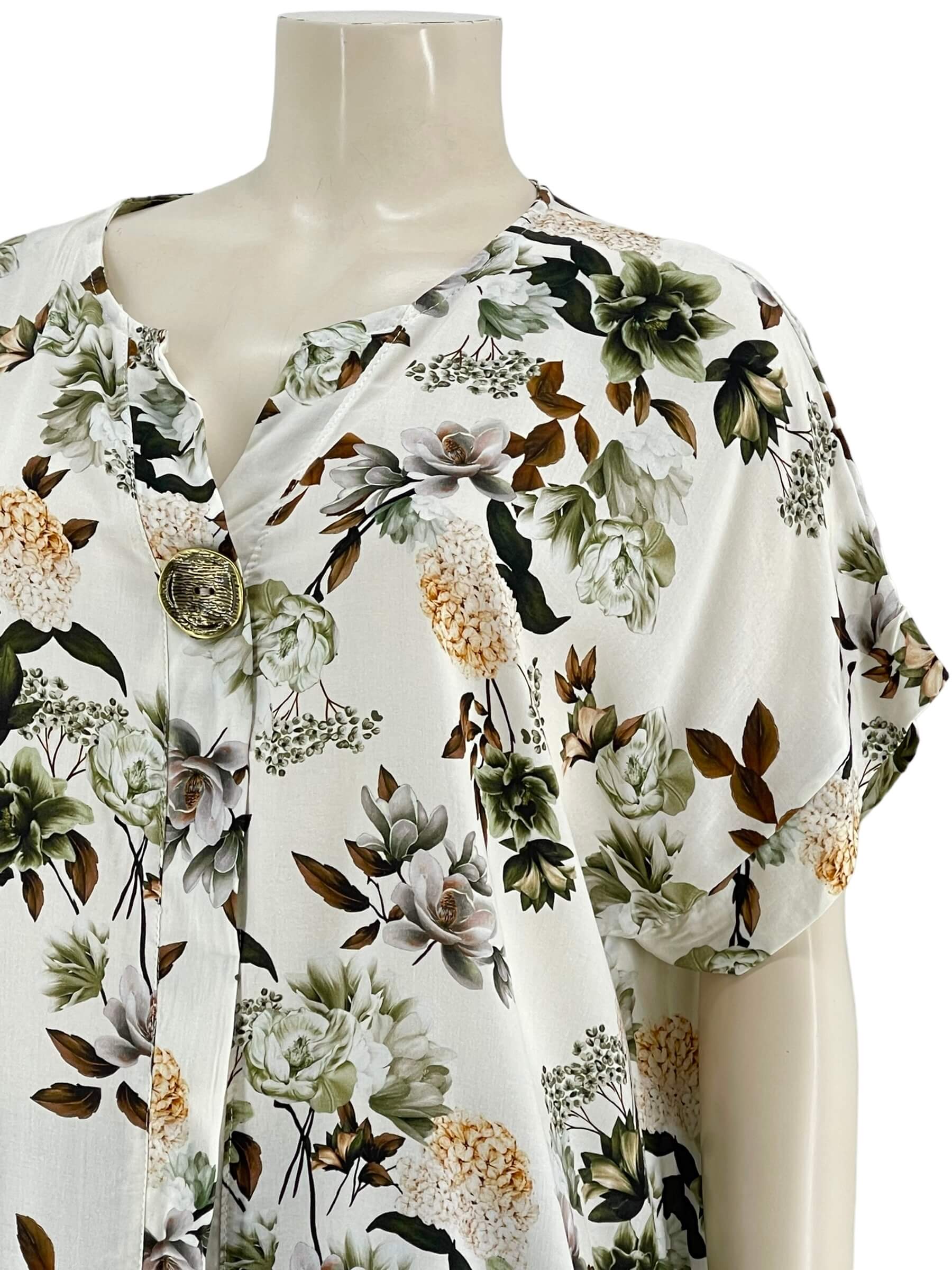 Μπλούζα γυναικεία βισκόζ ελαστική φλοράλ με διακοσμητικό κουμπί στο V.Ίσιο τελείωμα.Κοντό μανίκι.Καλύπτει από νούμερα:L εώς 3XL.