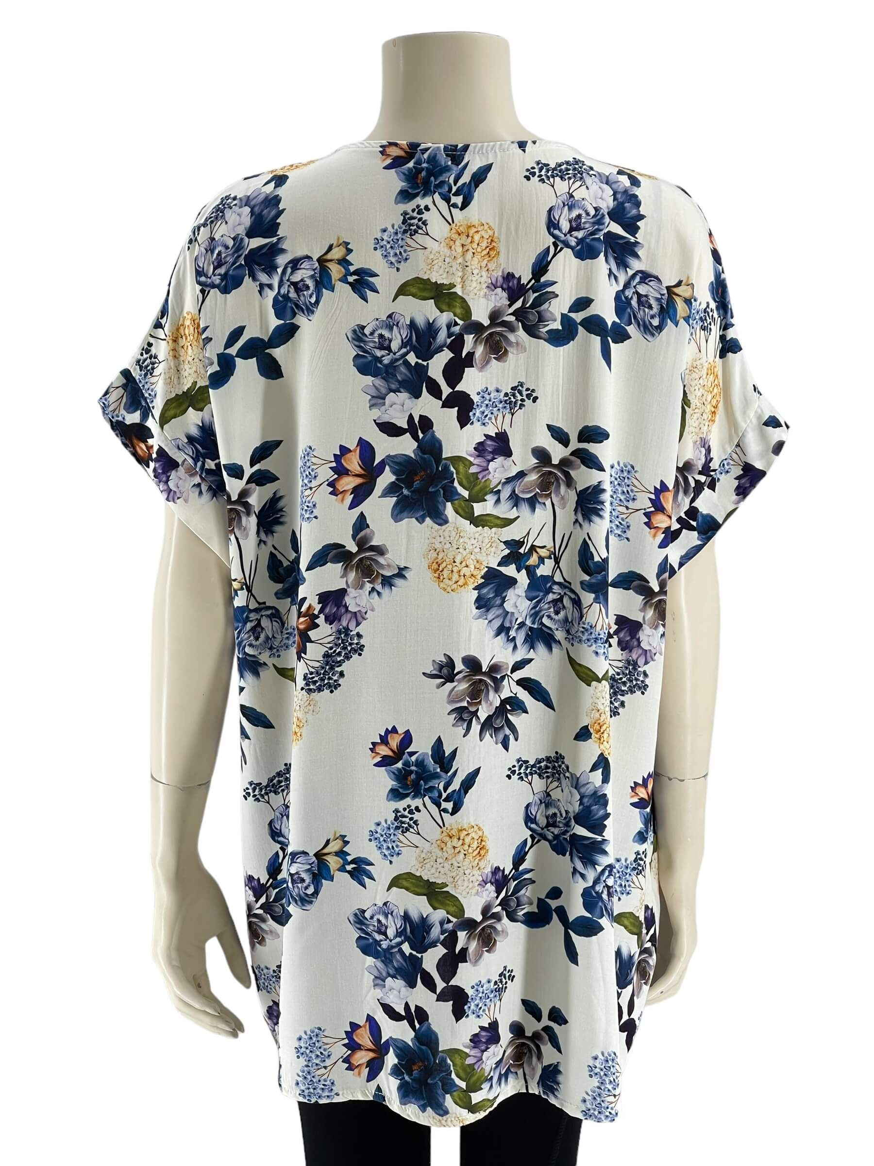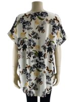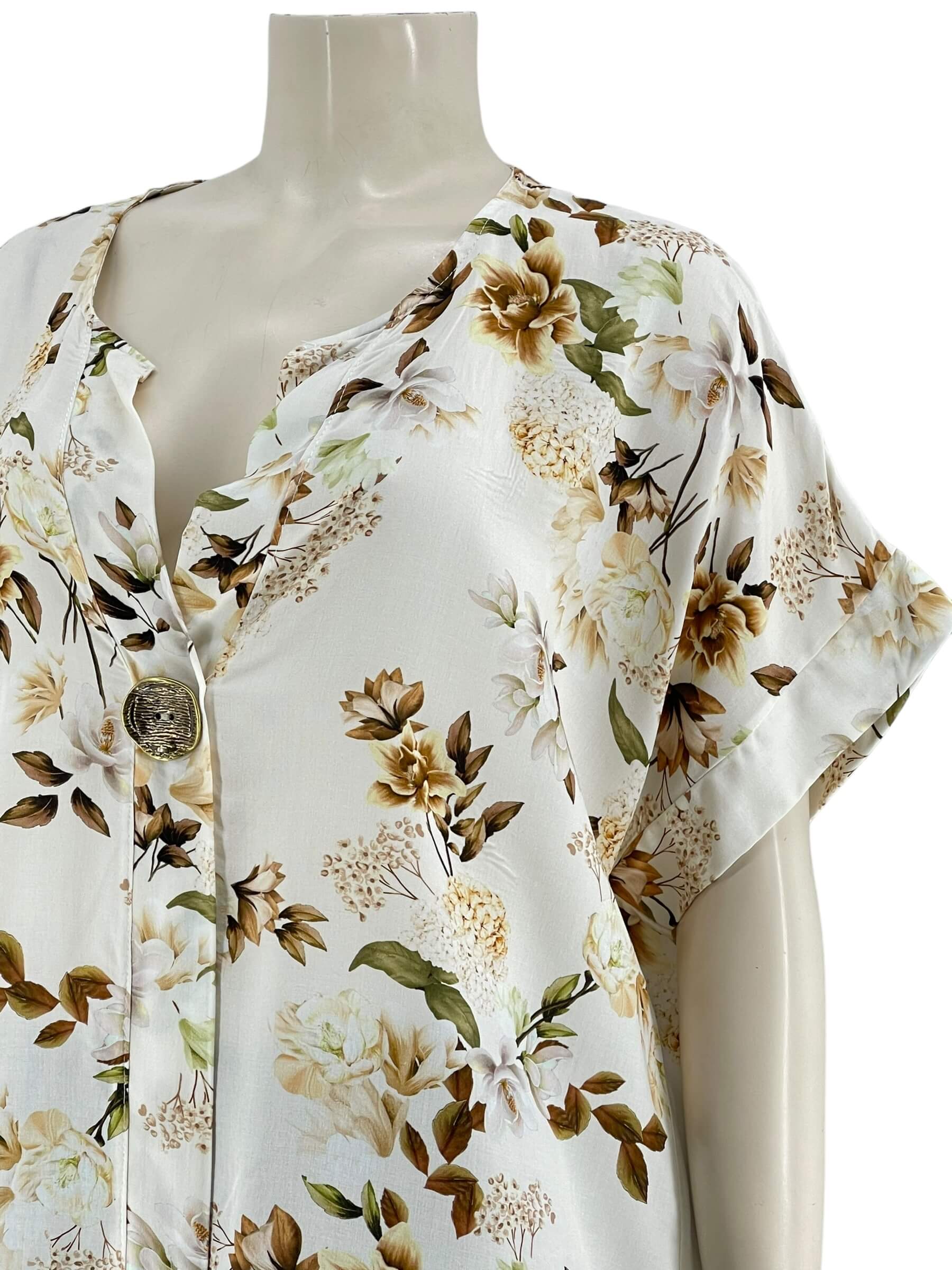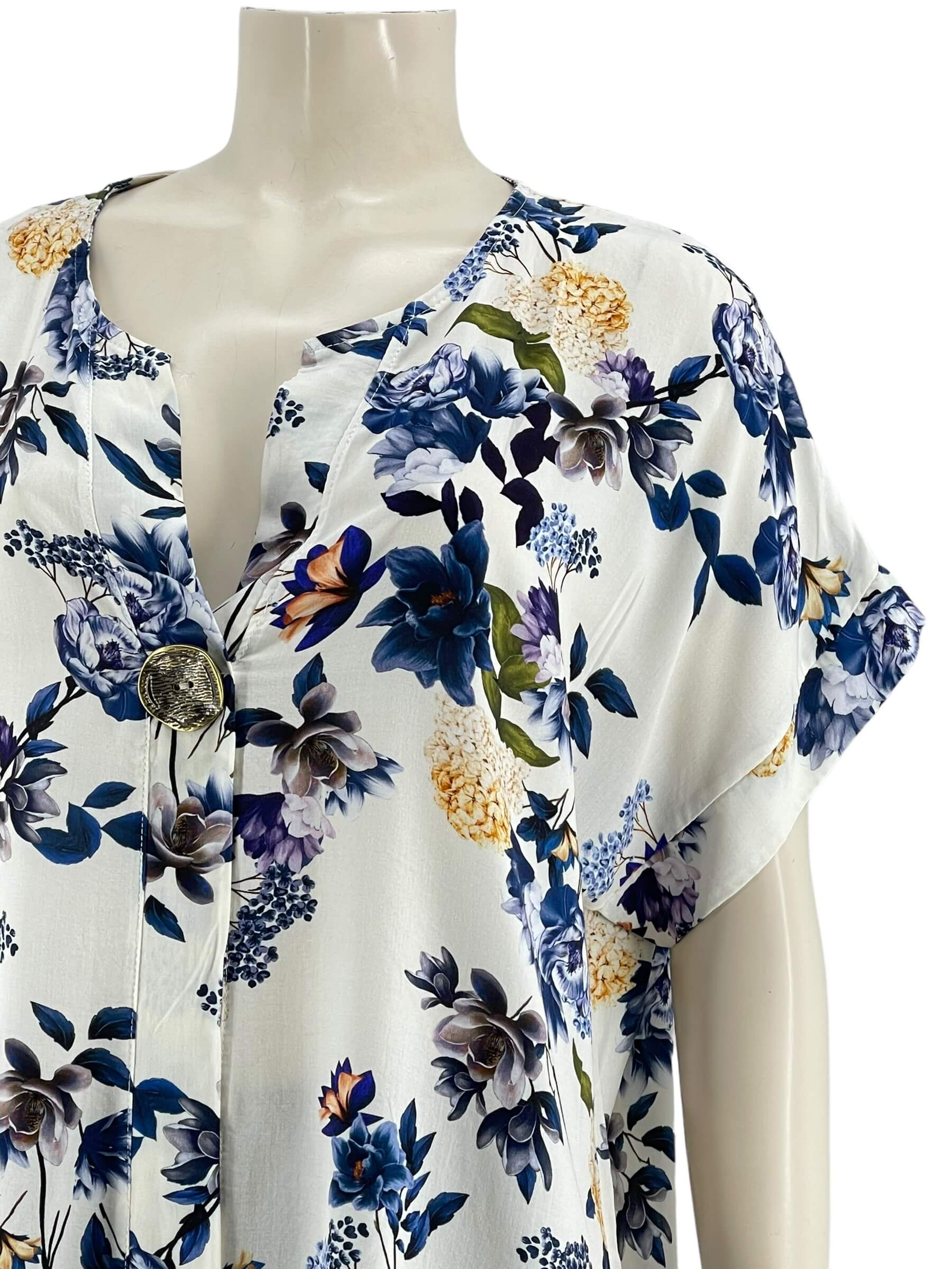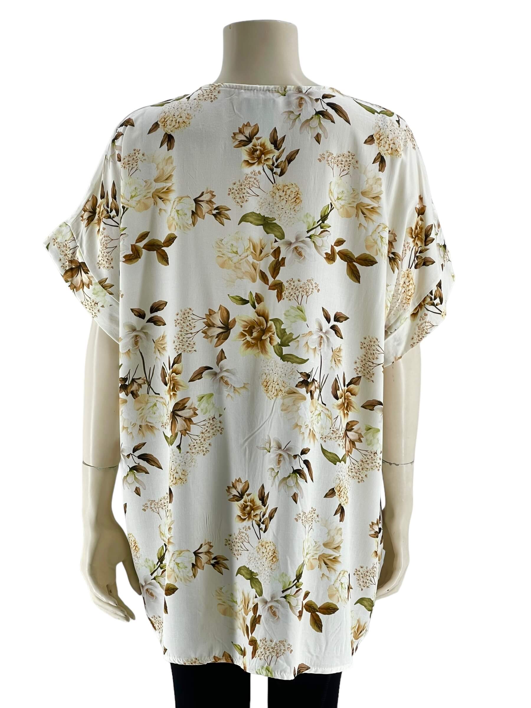 Μπλούζα γυναικεία βισκόζ ελαστική φλοράλ με διακοσμητικό κουμπί στο V.Ίσιο τελείωμα.Κοντό μανίκι.Καλύπτει από νούμερα:L εώς 3XL.