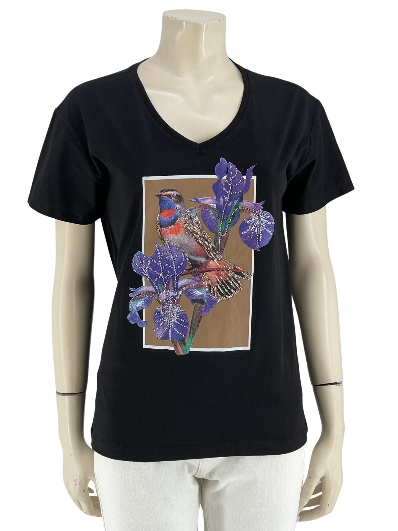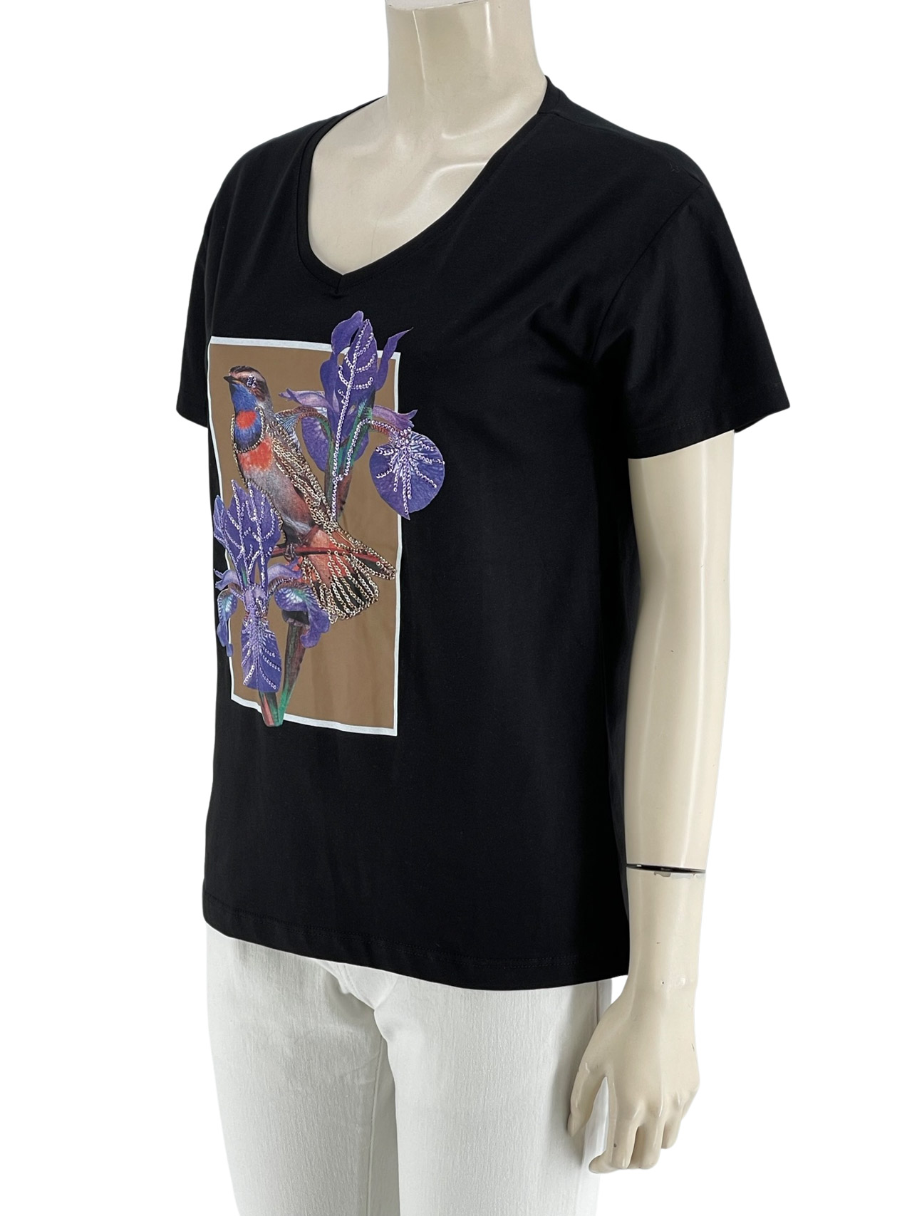 Μπλούζα γυναικεία βαμβακερή, V με τύπωμα και παγιέτες. Κοντό μανίκι, ίσια γραμμή.