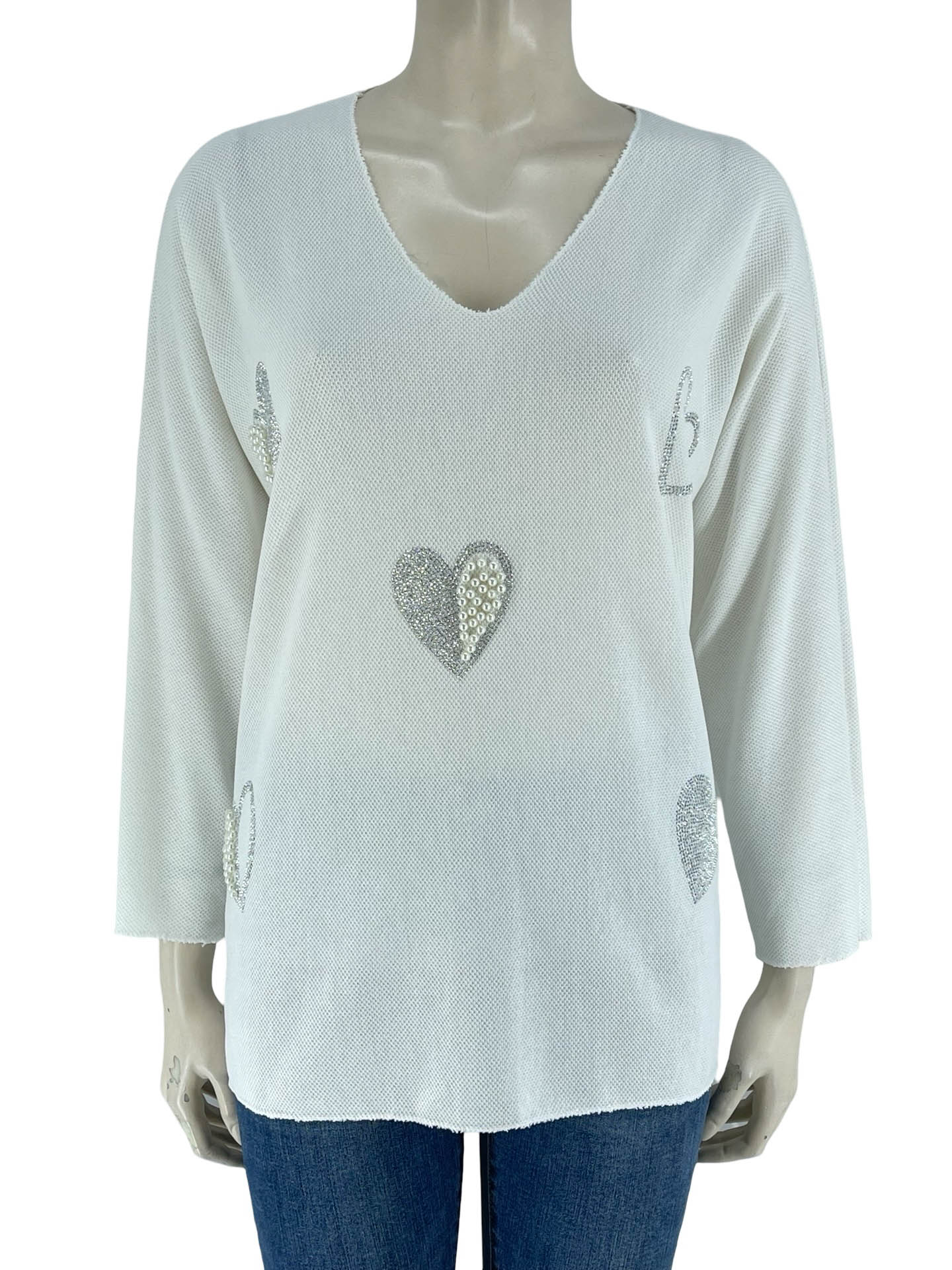 Μπλούζα γυναικεία V τύπου πλεκτό με τυπώματα στρας και πέρλες στο εμπρός μέρος. Νυχτερίδα μανίκι ημίκοντο. Ίσιο τελείωμα. Καλύπτει από ΝοΜ έως Νο2XL.