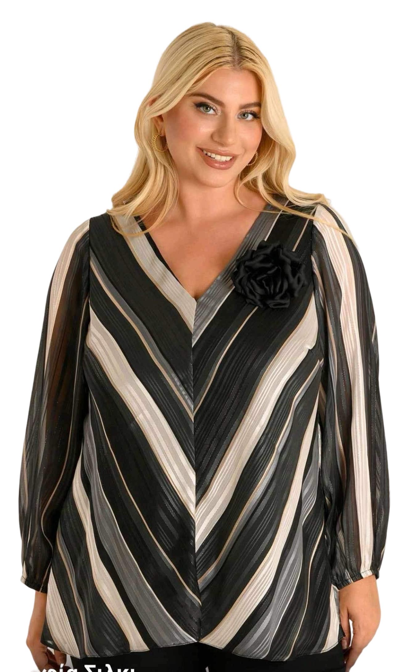 Μπλούζα γυναικεία V ζορζέτα, λούρεξ, φοδραρισμένη στο εσωτερικό της. Μακρύ μανίκι διαφάνεια με τελείωμα λάστιχο. Ίσιο τελείωμα. Μεγάλο μέγεθος.