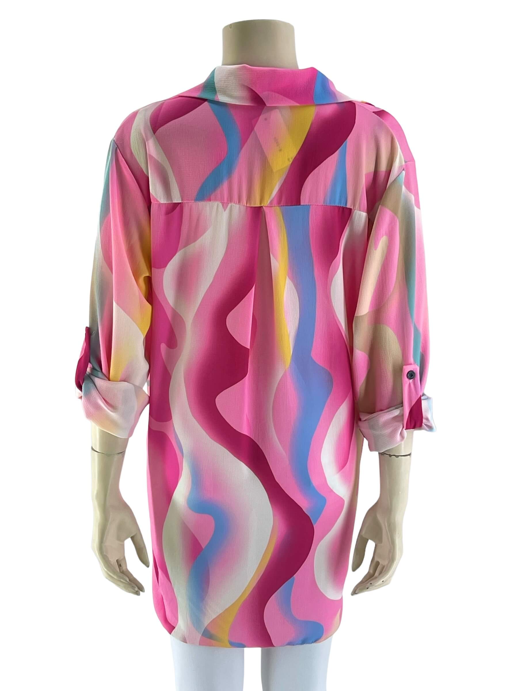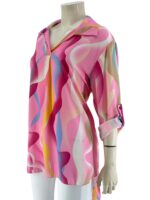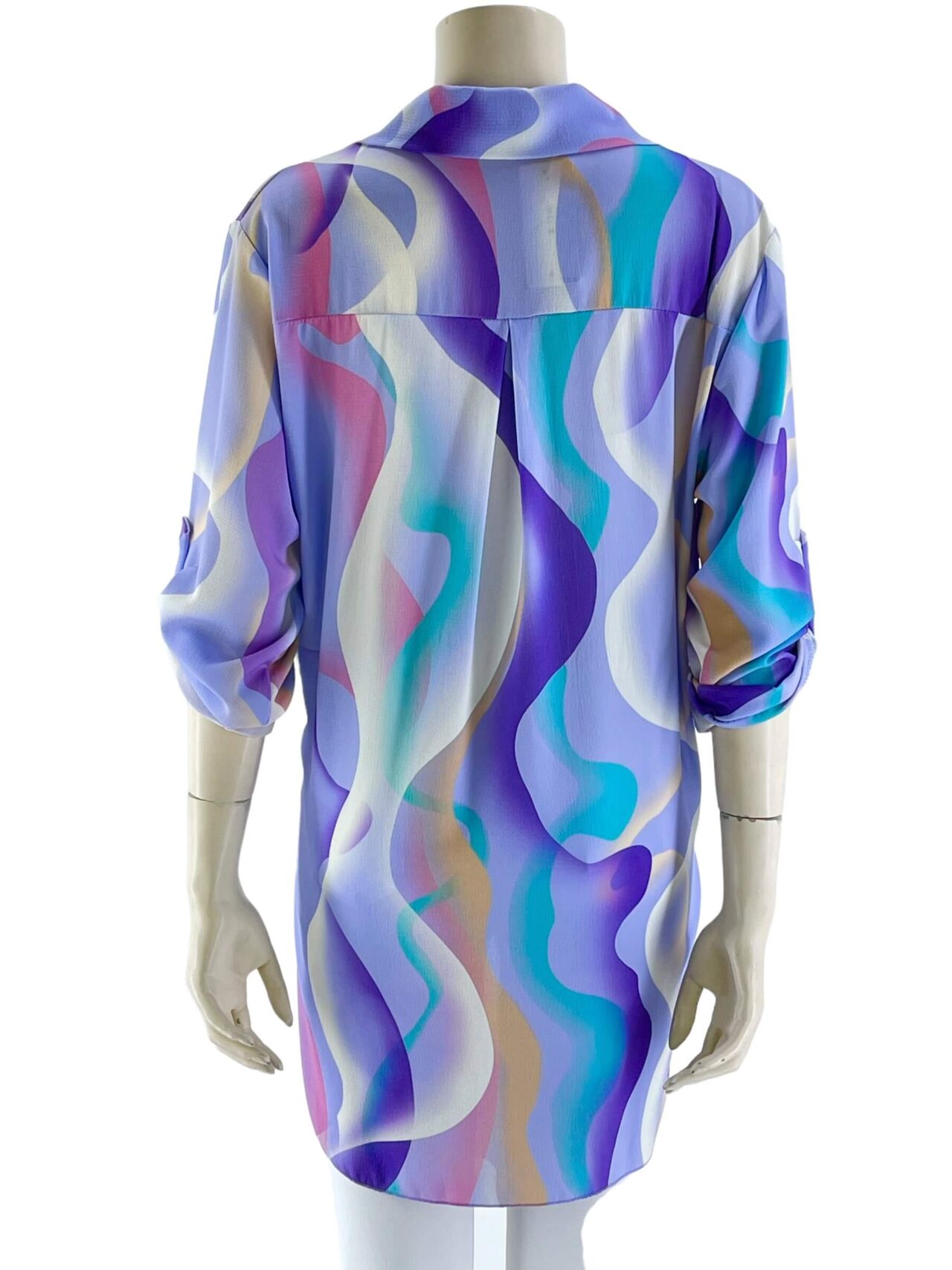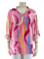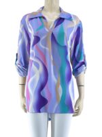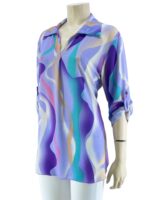 Μπλούζα γυναικεία εμπριμέ με V και γιακά.Μακρύ μανίκι γυριστό με κουμπί.Ασύμμετρο τελείωμα.Καλύπτει από νούμερα: M εως XL.