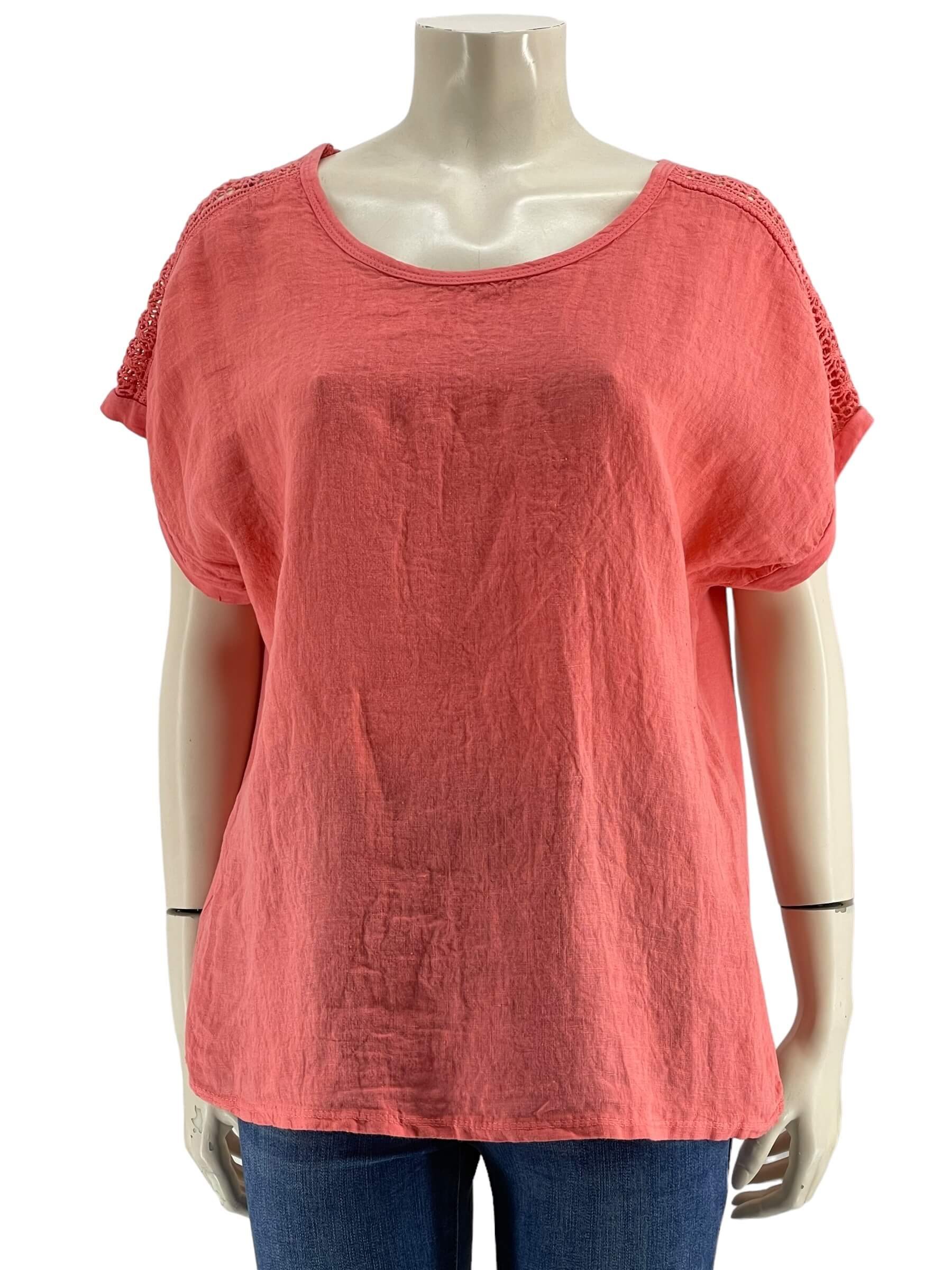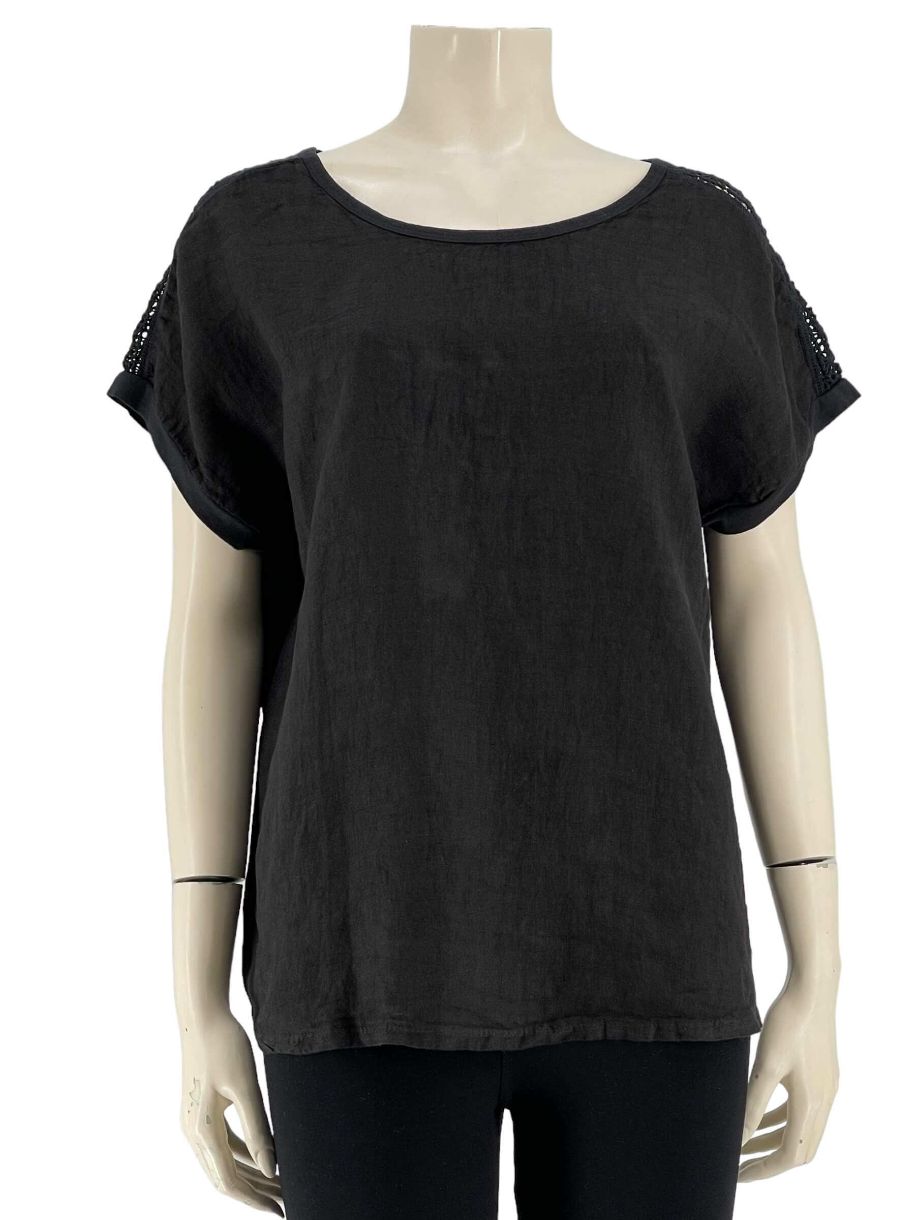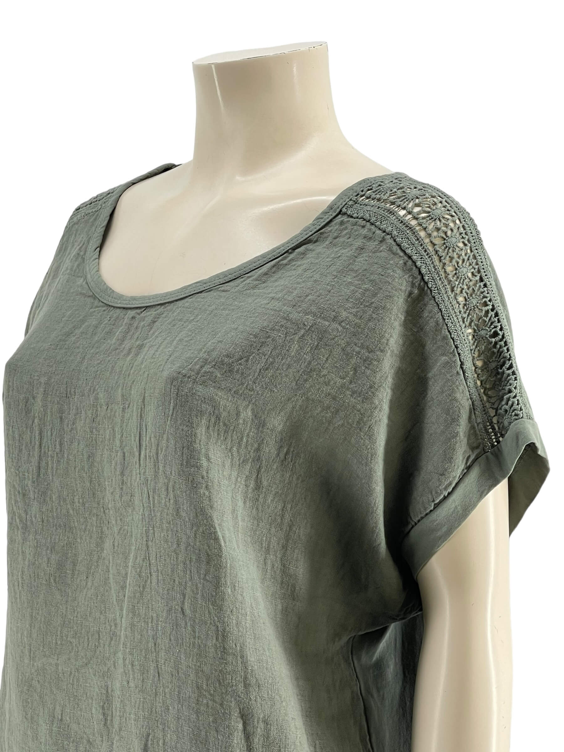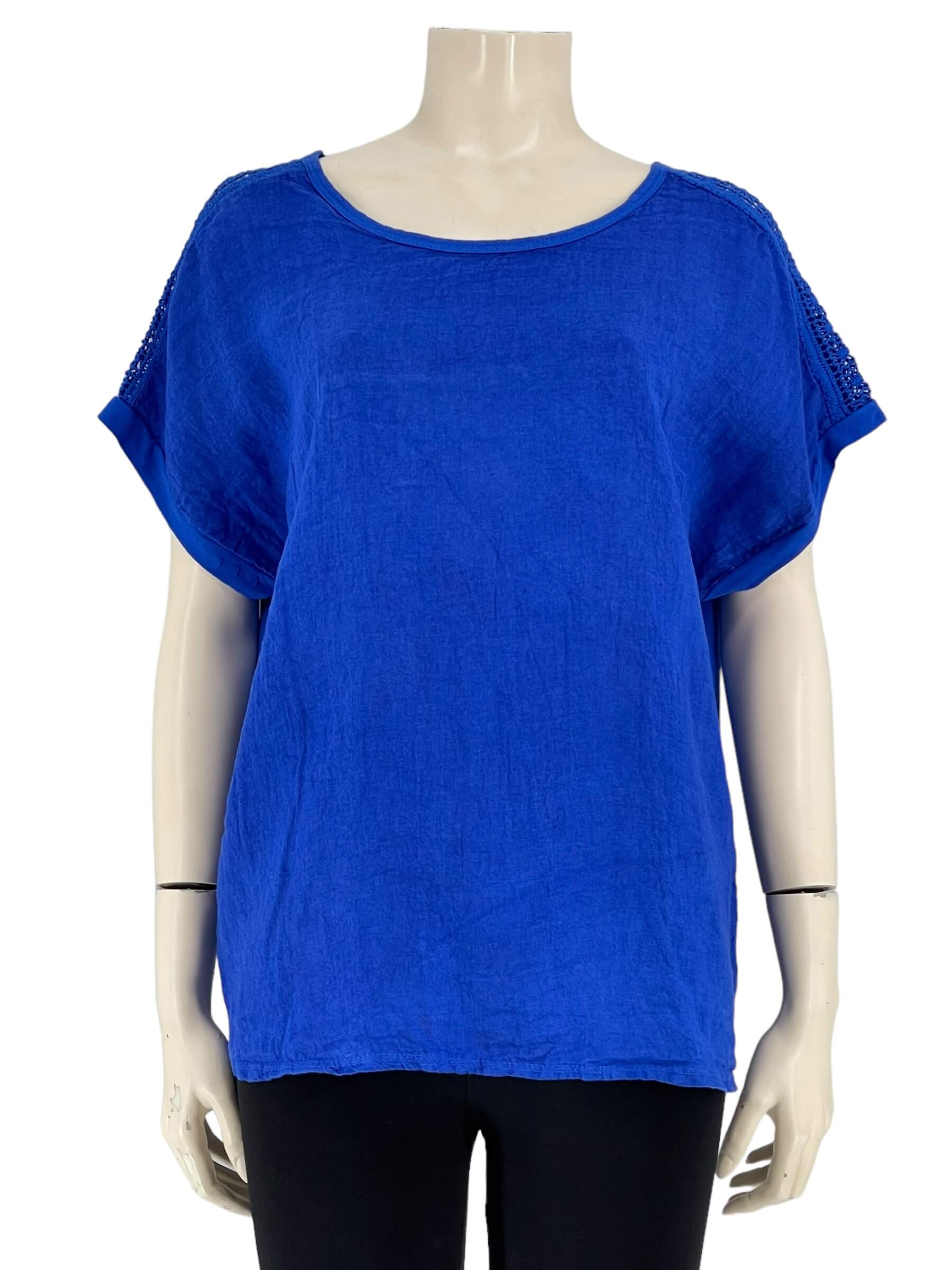 Μπλούζα γυναικεία μονόχρωμη,λαιμόκοψη με δαντέλα στους ώμους.Το εμπρός μέρος είναι ύφασμα λινό και το πίσω μέρος βισκόζ.Στρογγυλό τελείωμα και ζαπονέ μανίκι.Καλύπτει από νούμερα:M εώς 2XL.