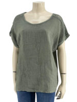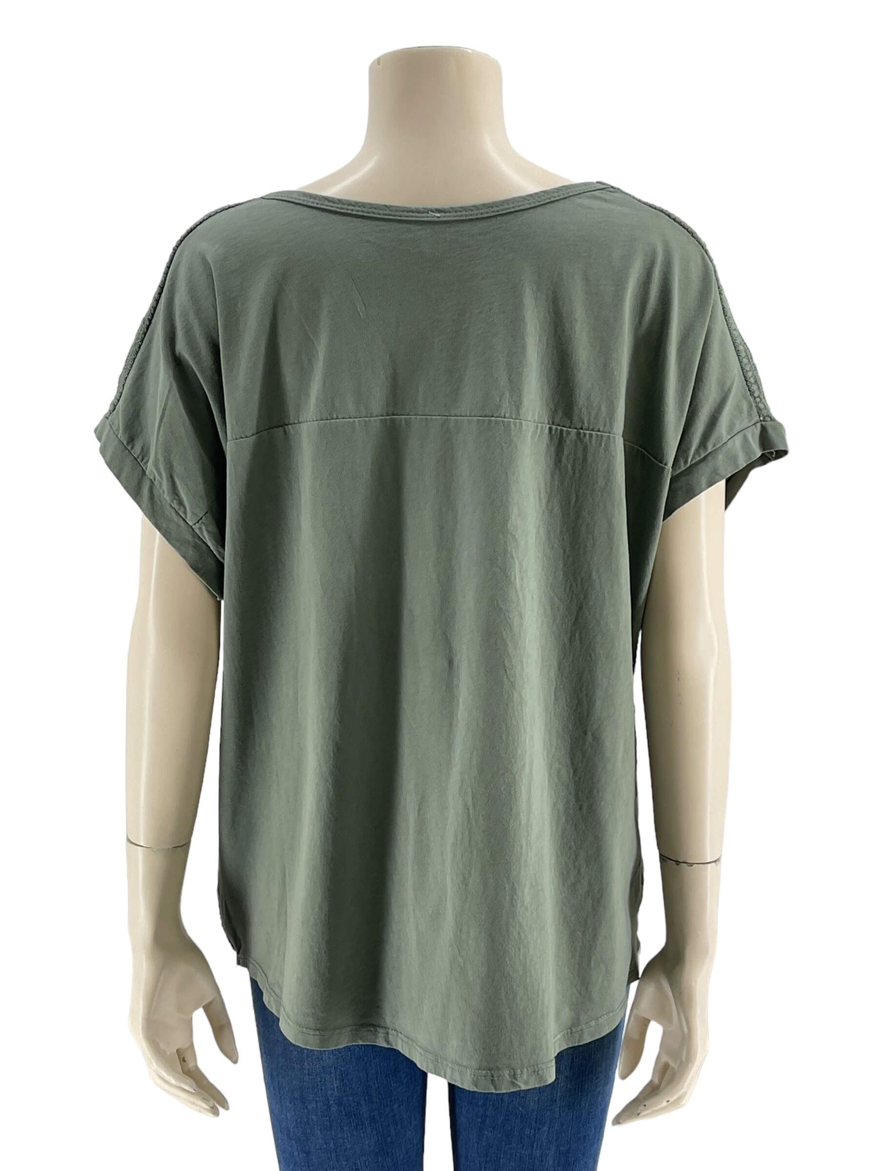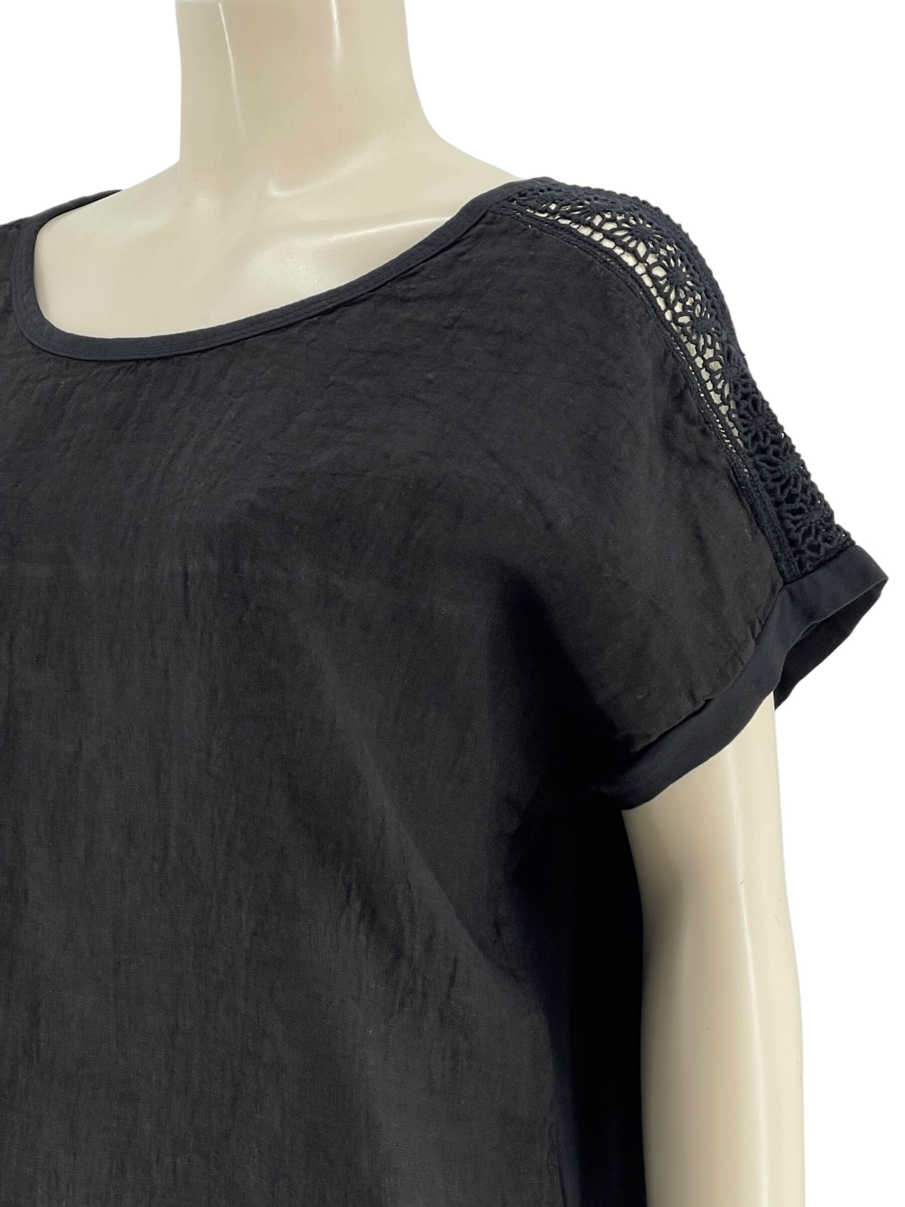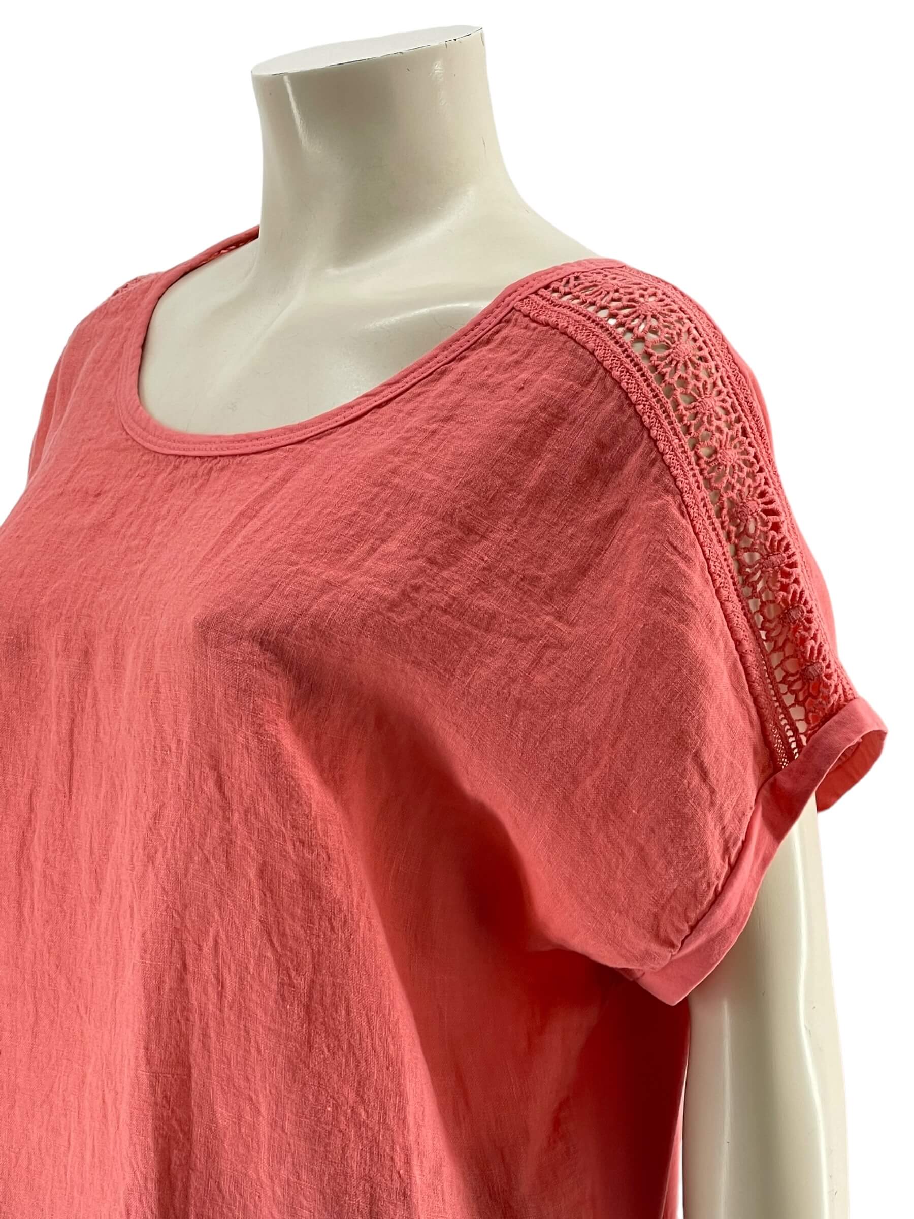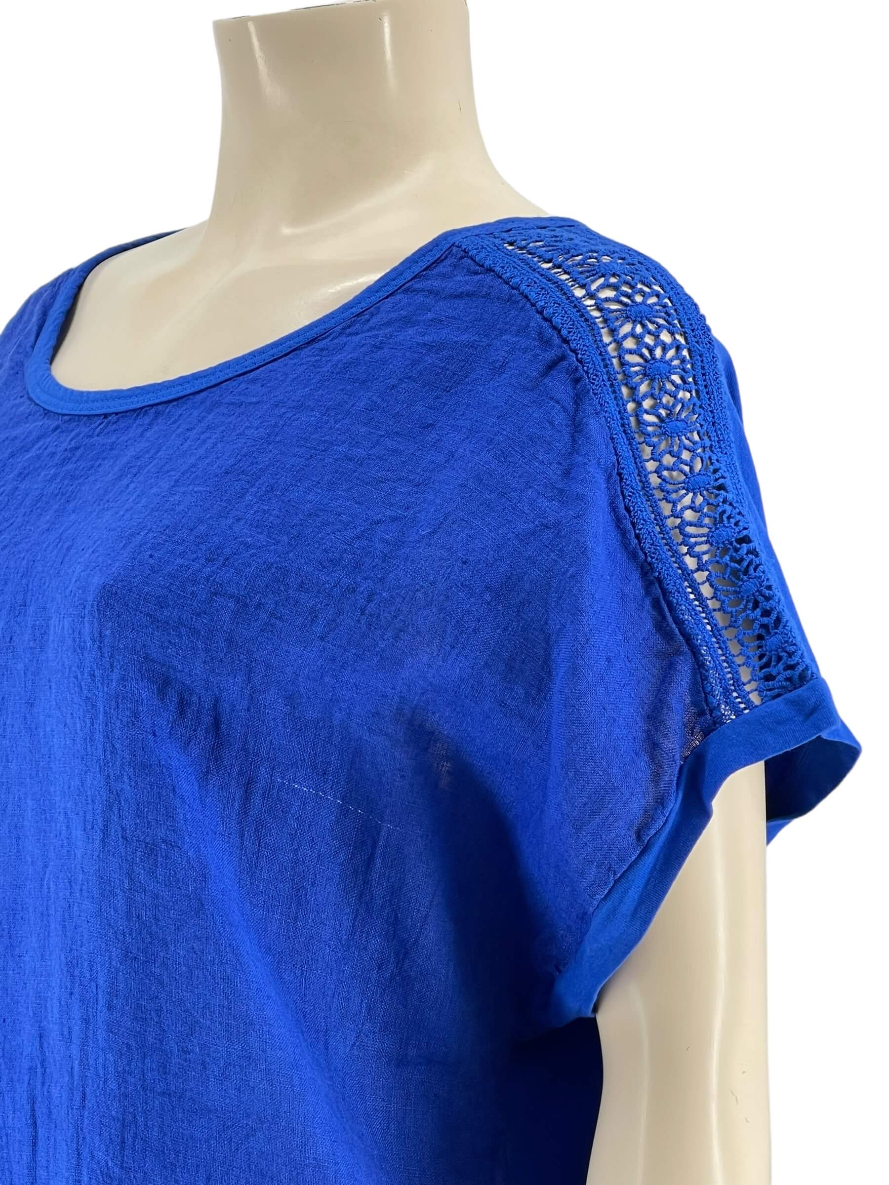 Μπλούζα γυναικεία μονόχρωμη,λαιμόκοψη με δαντέλα στους ώμους.Το εμπρός μέρος είναι ύφασμα λινό και το πίσω μέρος βισκόζ.Στρογγυλό τελείωμα και ζαπονέ μανίκι.Καλύπτει από νούμερα:M εώς 2XL.