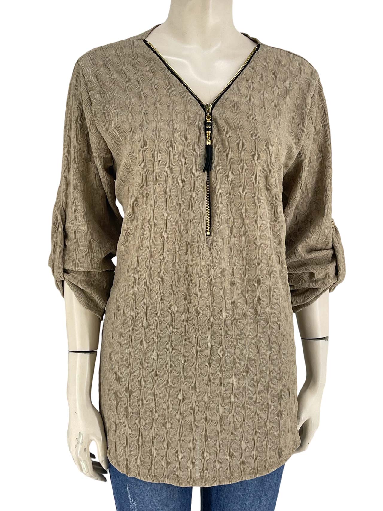 Μπλούζα γυναικεία μονόχρωμη με ανάγλυφο σχέδιο. Φερμουάρ στο V. Μακρύ μανίκι γυριστό με κουμπί. Στρογγυλό τελείωμα. Καλύπτει από ΝοL έως Νο2XL.