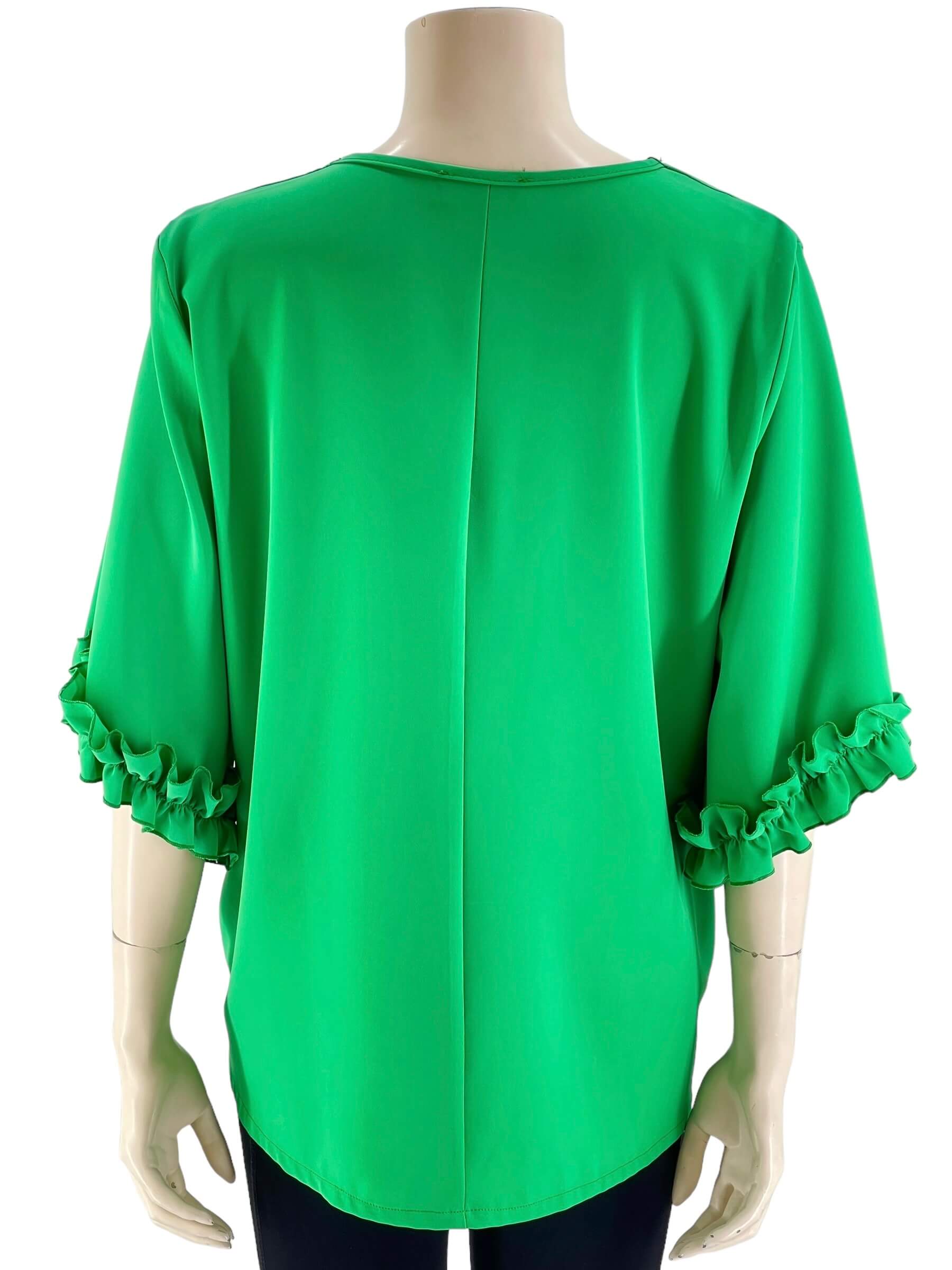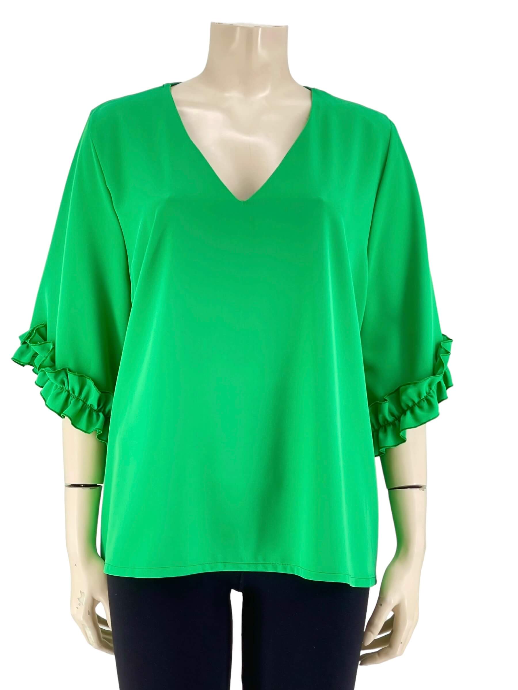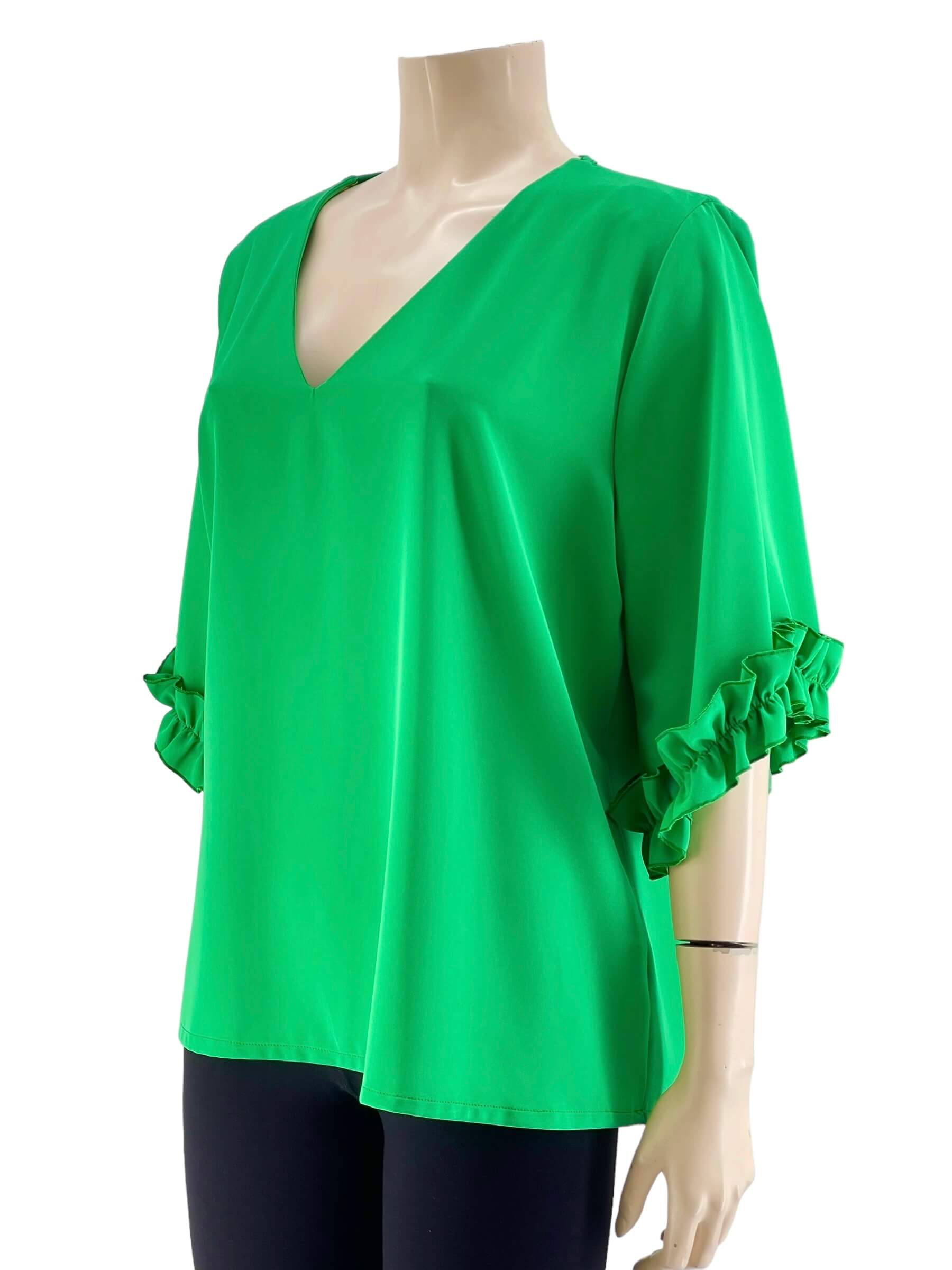 Μπλούζα μονόχρωμη V σε ίσια γραμμή.Ημίκοντο μανίκι με τελείωμα βολάν.Μεγάλο μέγεθος.