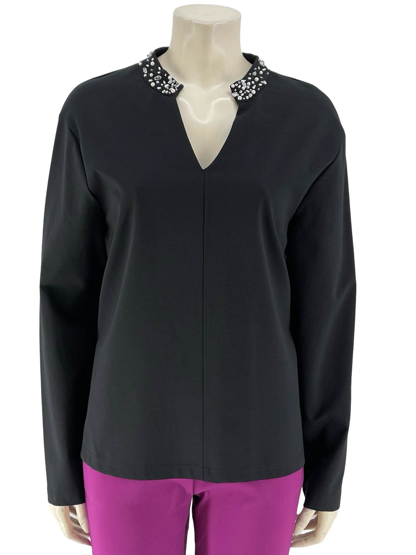Μπλούζα γυναικεία βισκόζ, ελαστικό V με μάο γιακά διακοσμημένο με πέρλες και παγιέτες. Ασύμμετρο τελείωμα με ανοίγματα στα πλαϊνά. Μακρύ μανίκι. Κανονική γραμμή.