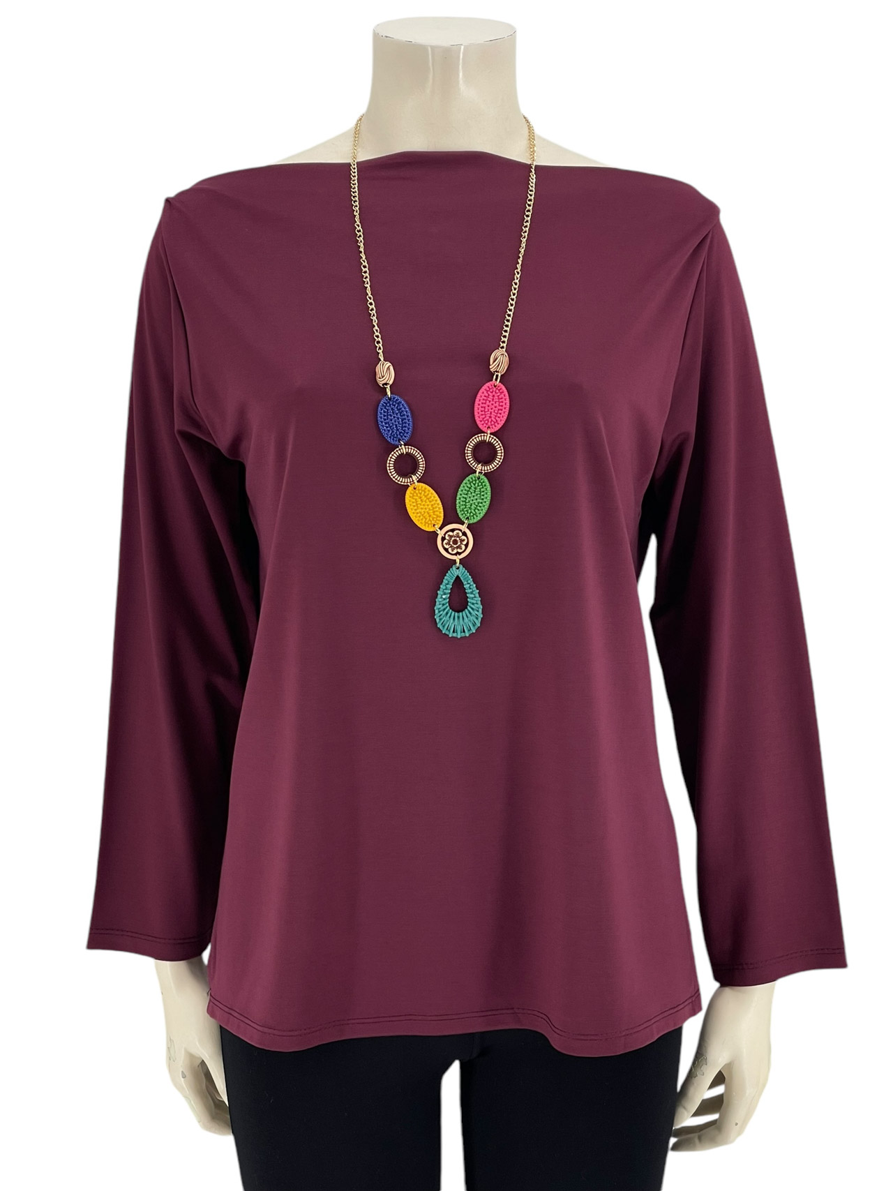 Μπλούζα γυναικεία, βισκόζ, ελαστική, μονόχρωμη με μεγάλο άνοιγμα στο λαιμό και μακρύ μανίκι, ίσιο τελείωμα με δώρο κολιέ. Καλύπτει από ΝοΜ έως ΝοXL.
