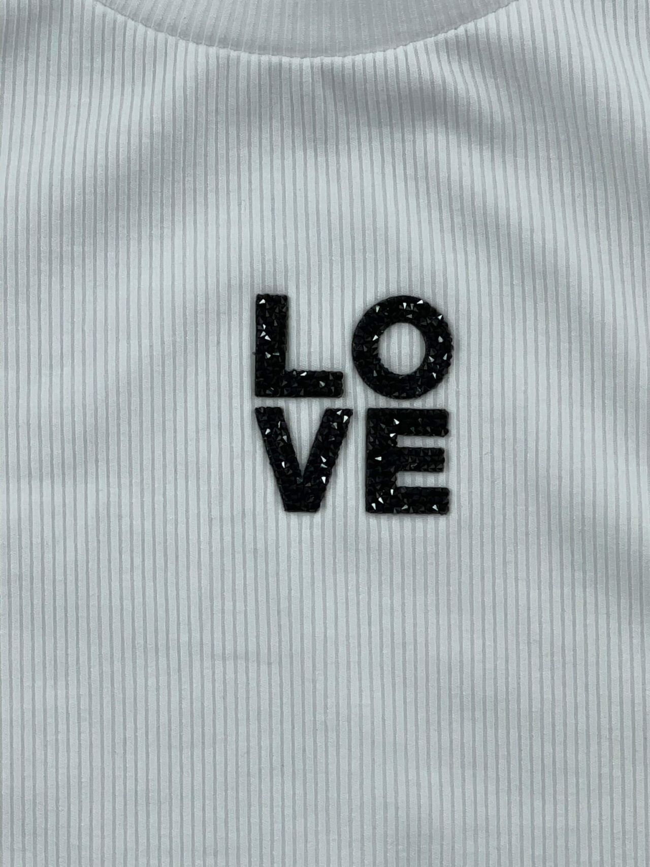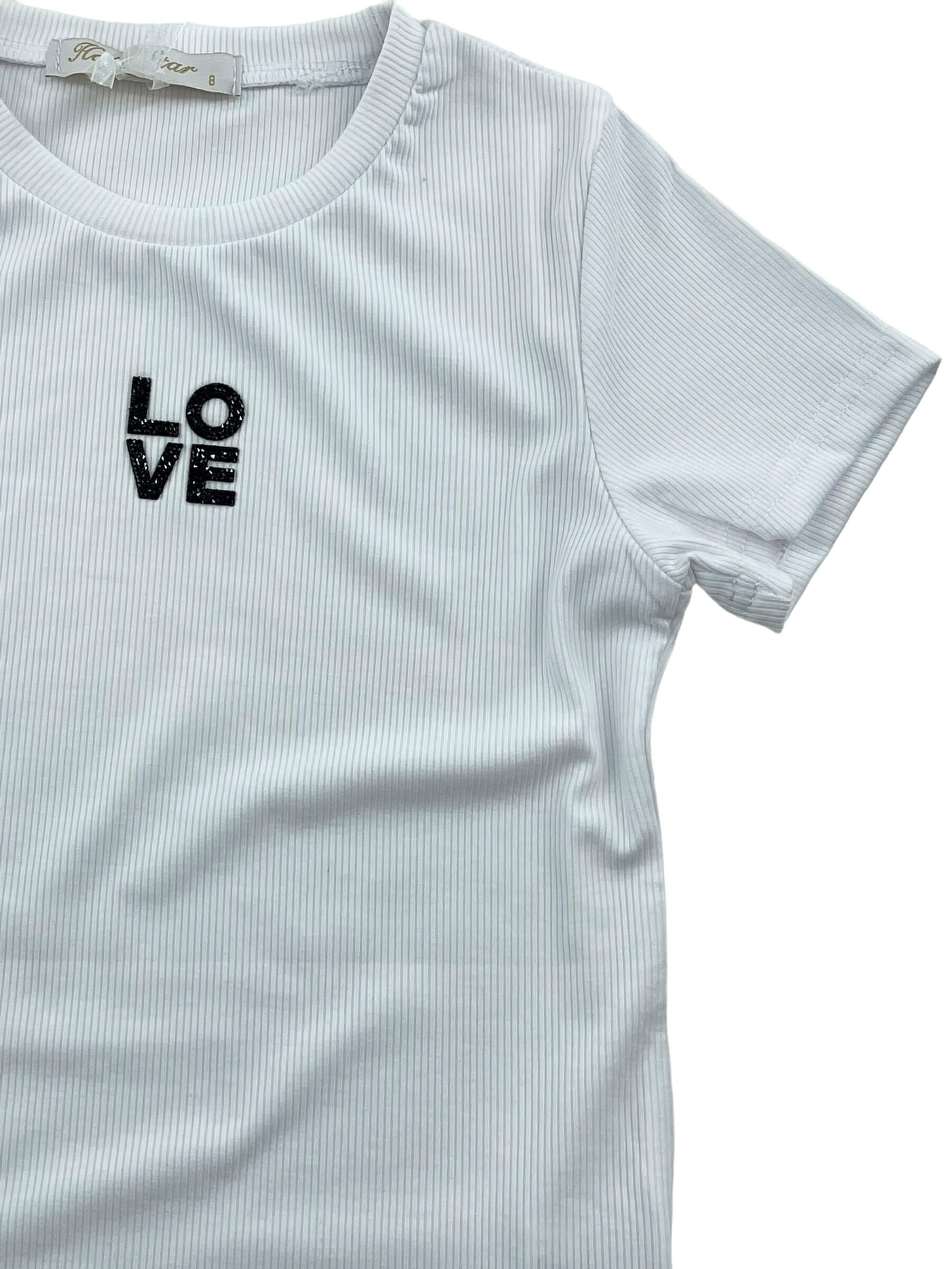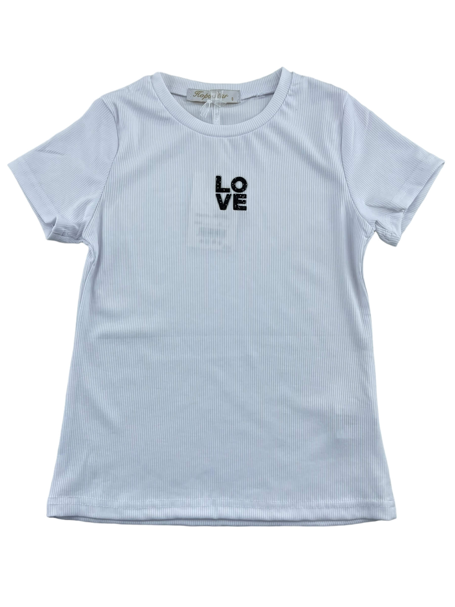 Μπλουζάκι κορίτσι μονόχρωμο ριπ ελαστικό,λαιμόκοψη με στρασάκια love στο εμπρός μέρος ίσια γραμμή.Κοντό μανίκι.