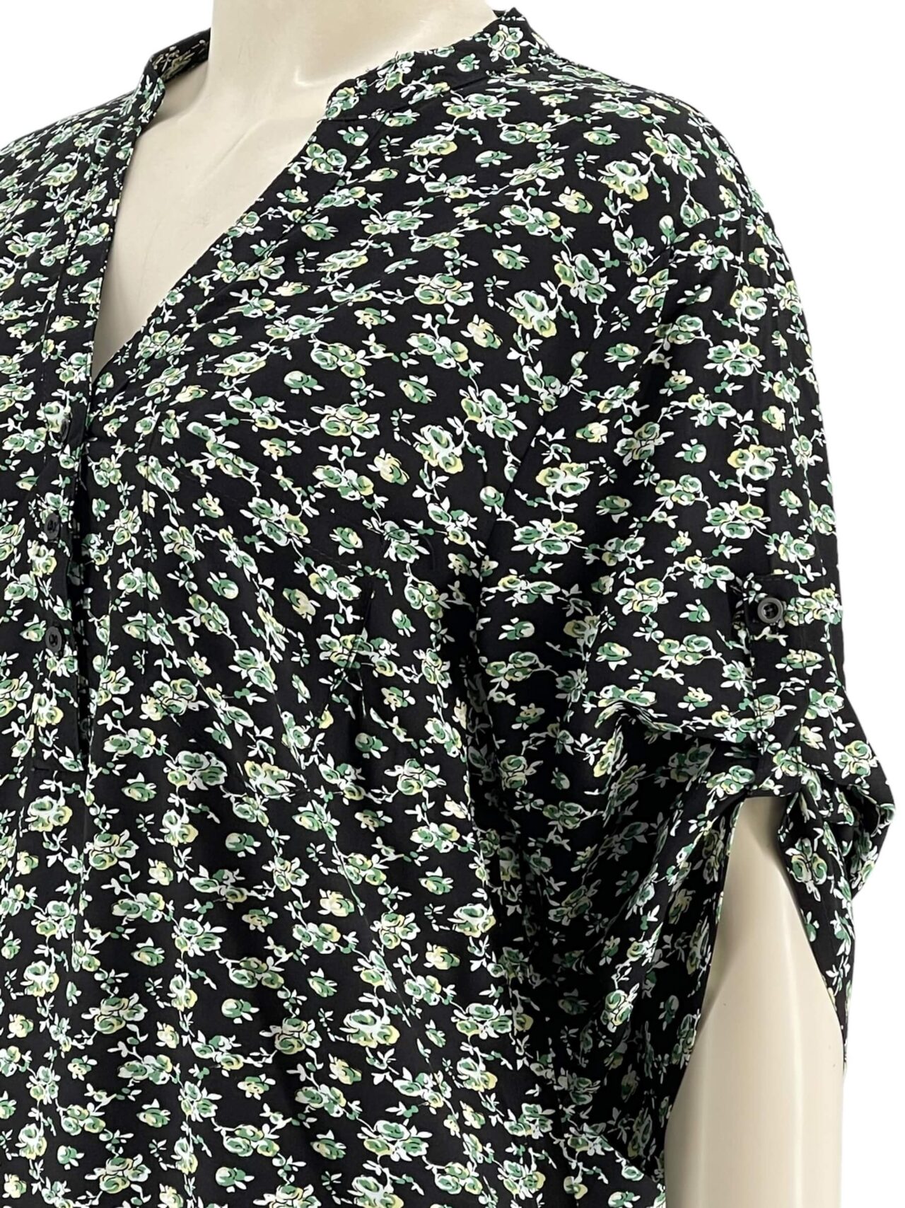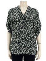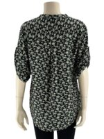Μπλουζοπουκάμισο  βαμβακερό εμπριμέ με κουμπάκια στο V και mao γιακά.Στρογγυλό τελείωμα.Ημίκοντο μανίκι,γυριστό με κουμπί.Κανονικό μέγεθος.