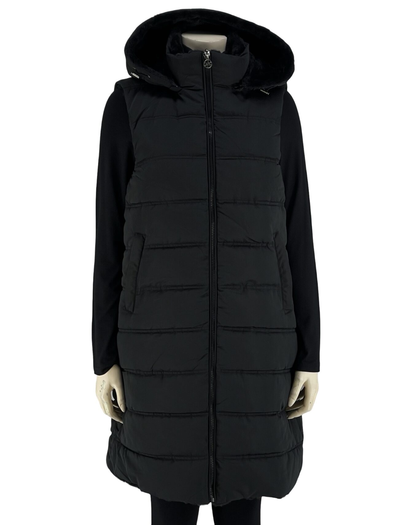 Μπουφάν γυναικείο αμάνικο double face. Στην μία όψη μπουφάν και στην άλλη όψη οικολογική γούνα.Αποσπώμενη κουκούλα. Τσέπες κοφτές και στις δύο όψεις. Κλείσιμο με φερμουάρ στο εμπρός μέρος. Μεγάλο μέγεθος.