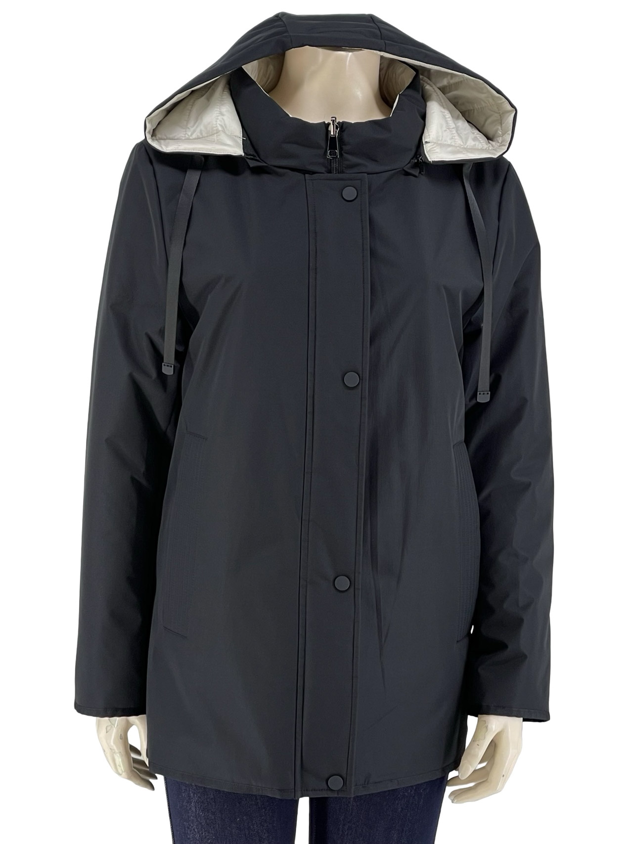 Διπλής όψης. Αποσπώμενη κουκούλα, κλείσιμο με φερμουάρ και τρουκς.