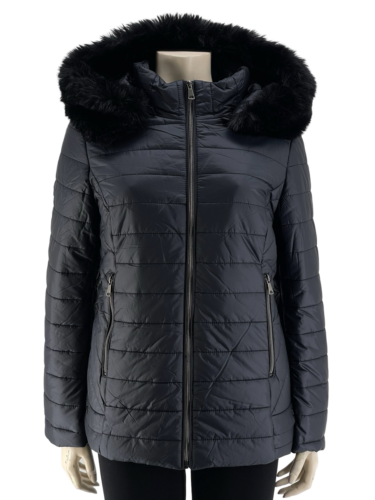 Μπουφάν γυναικείο με επένδυση υαλοβάμβακα στο εσωτερικό του. Αποσπώμενη κουκούλα με σταθερή γούνα. Κλείσιμο με φερμουάρ και στις τσέπες. Ίσιο τελείωμα. Κανονική γραμμή.