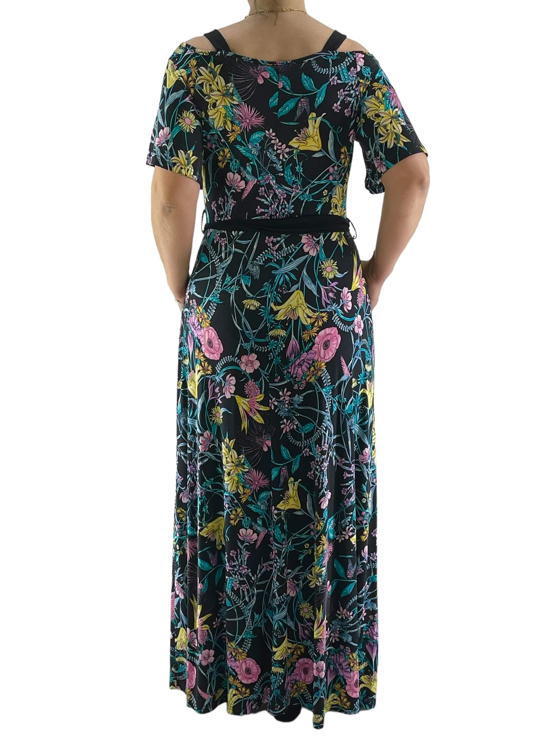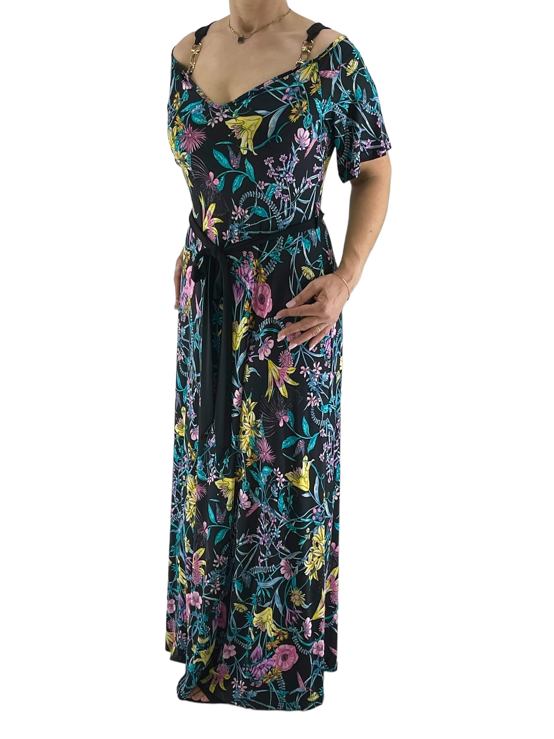 Φόρεμα εμπριμέ ελαστικό maxi V με έξω ώμους και ράντα μονόχρωμη με αλυσίδα.Κοντό μανίκι.Ζωνάκι μονόχρωμο υφασμάτινο στην μέση.Μεγάλο μέγεθος.