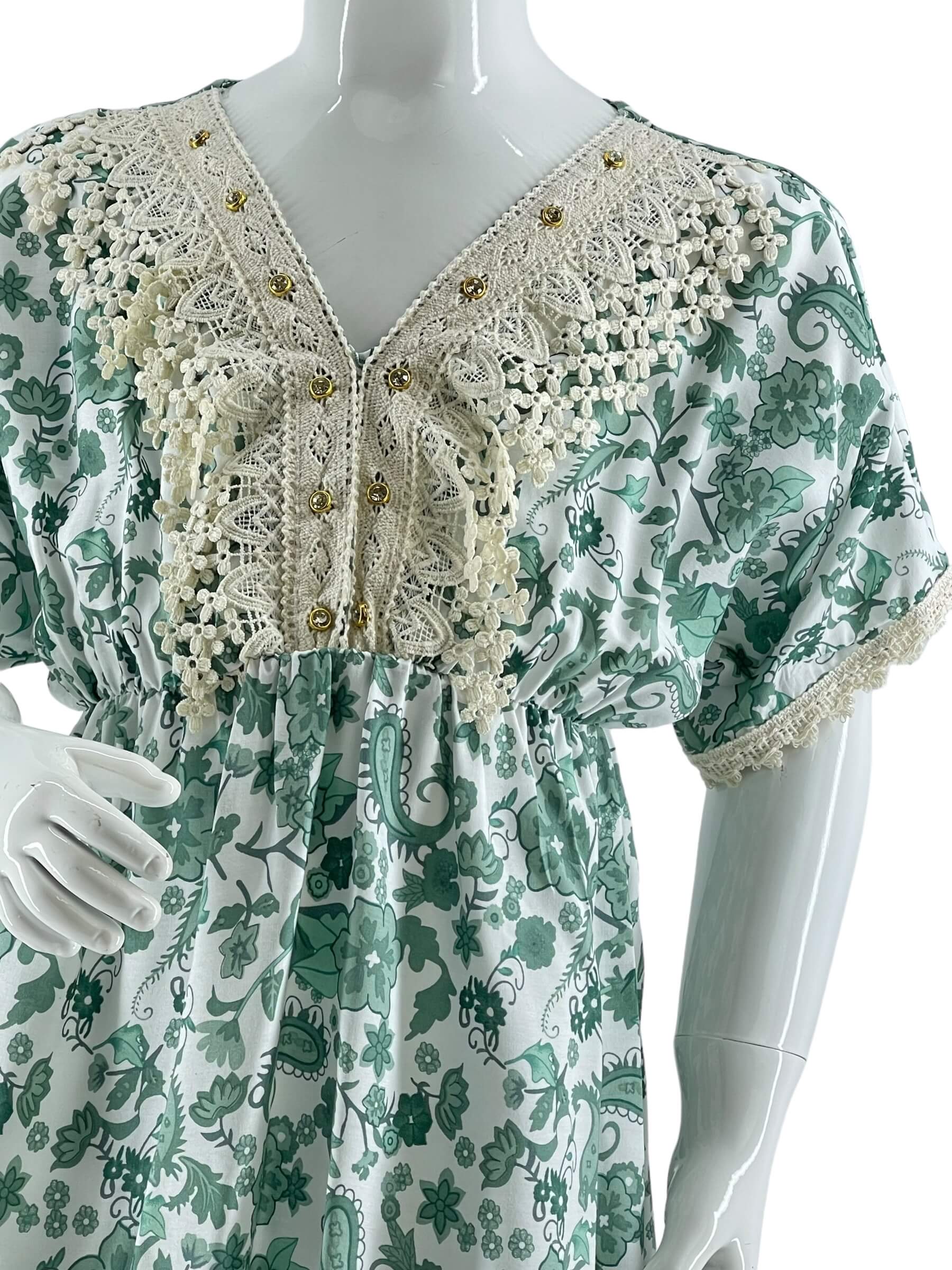 Φόρεμα κορίτσι εμπριμέ με δαντέλα και στρασάκια στο V. Λάστιχο στην μέση. Κοντό μανίκι με τελείωμα τρέσα. Βολάν στο τελείωμα.