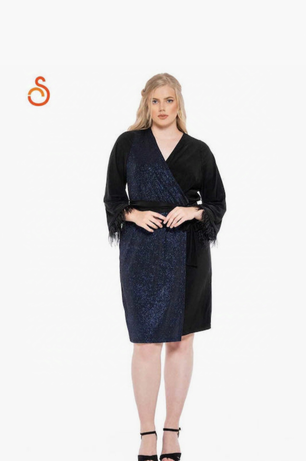 Φόρεμα γυναικείο κρουαζέ με λούρεξ στη μία πλευρά. Λάστιχο στη μέση και υφασμάτινο ζωνάκι. Τρουακάρ μανίκι με τελείωμα πούπουλα. Μεγάλο μέγεθος.