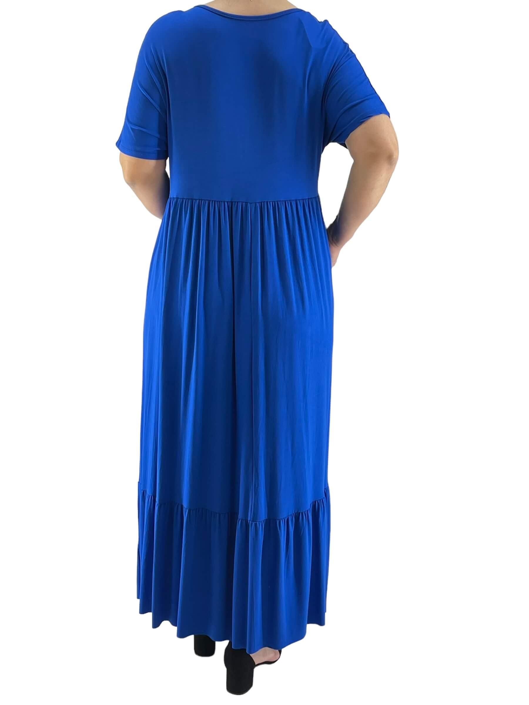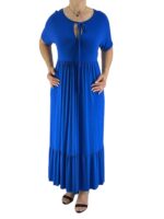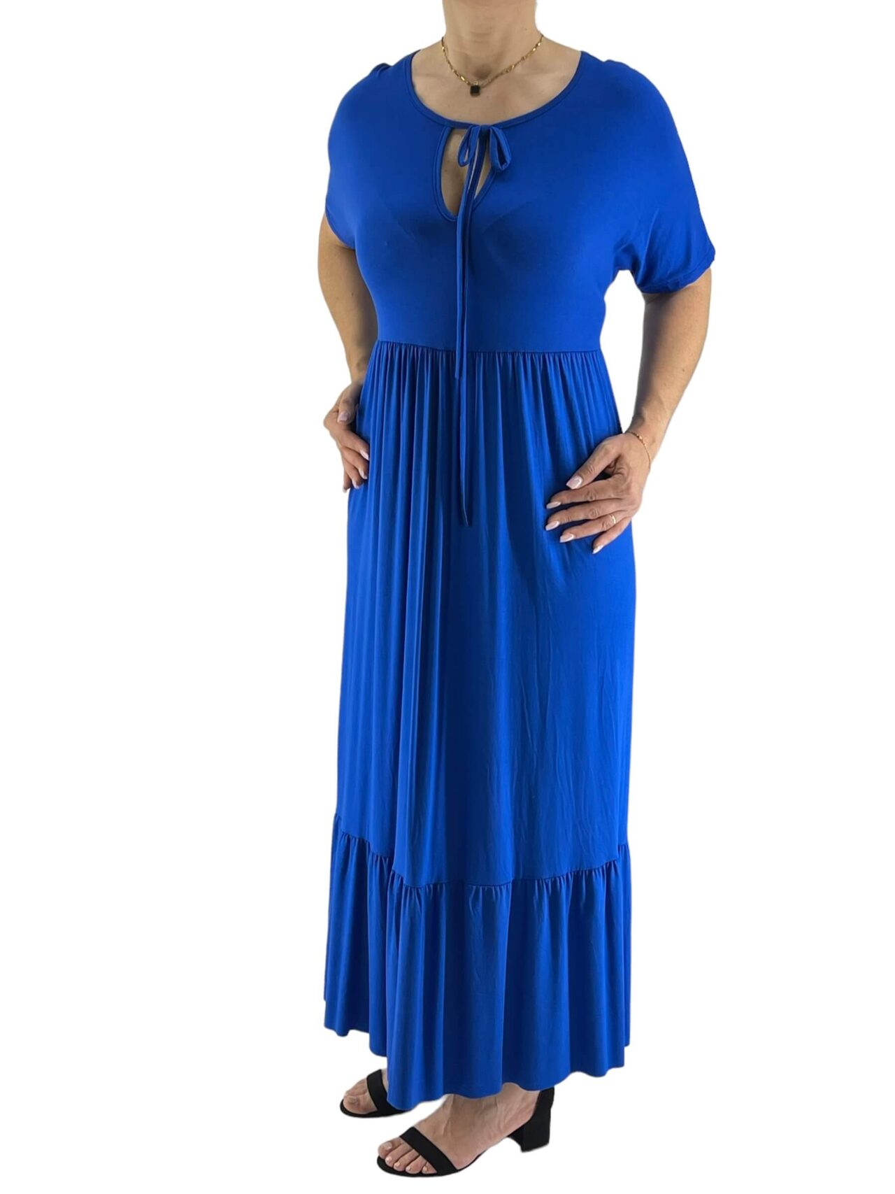 Φόρεμα μακρύ μονόχρωμο,ελαστικό βισκόζ.Λαιμόκοψη με δέσιμο.Σούρες στο κάτω μέρος.Κοντό μανίκι.Καλύπτει από νούμερα:L εώς 3XL.
