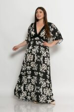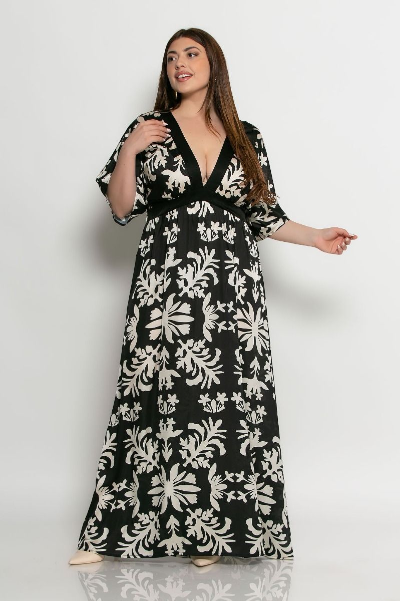 Φόρεμα maxi σατέν V και χιαστή φάσα κάτω από το στήθος.Στο πίσω μέρος της μέσης έχει λάστιχο.Τρουακάρ μανίκια καμπάνα.Μεγάλο μέγεθος.