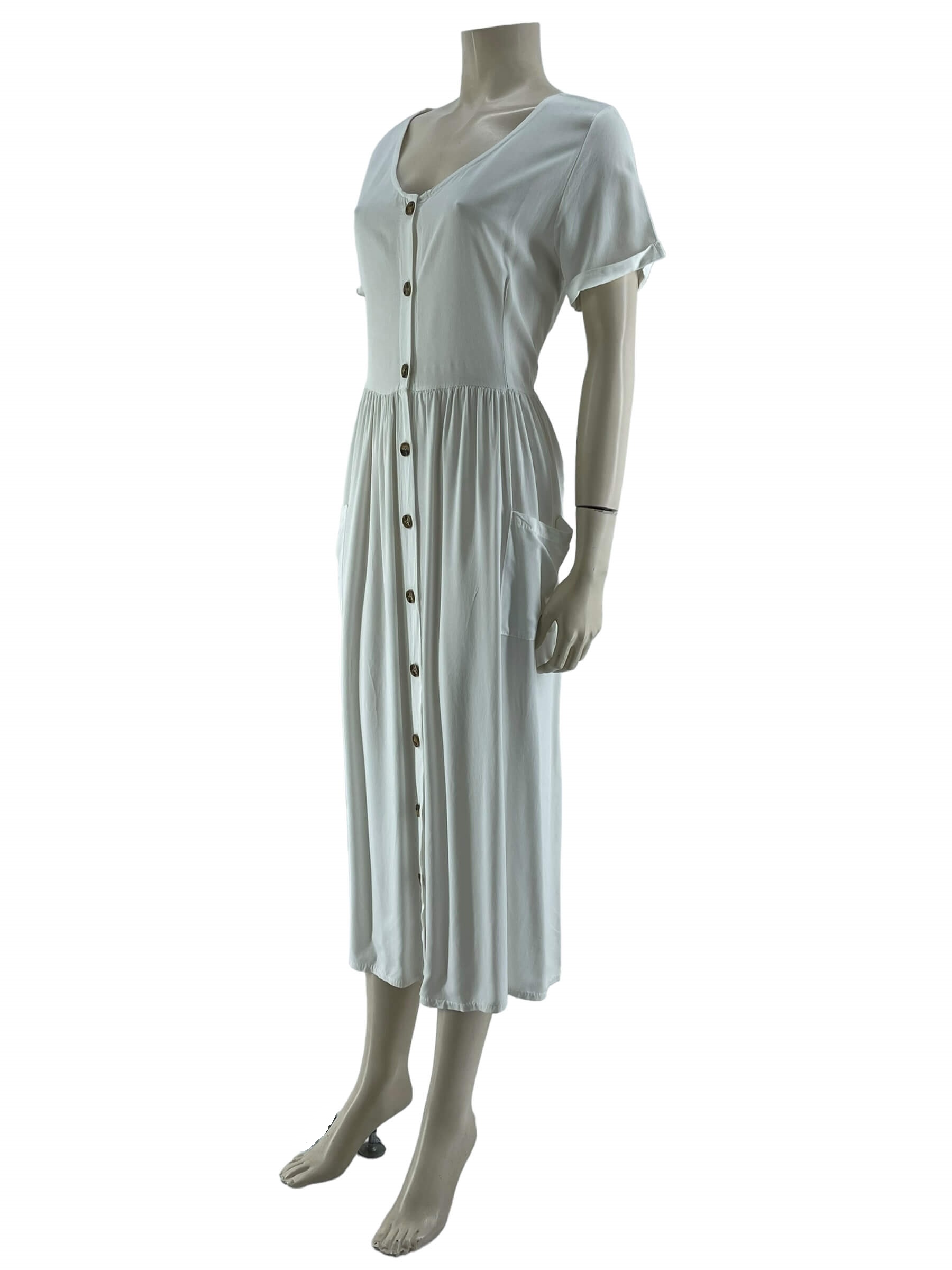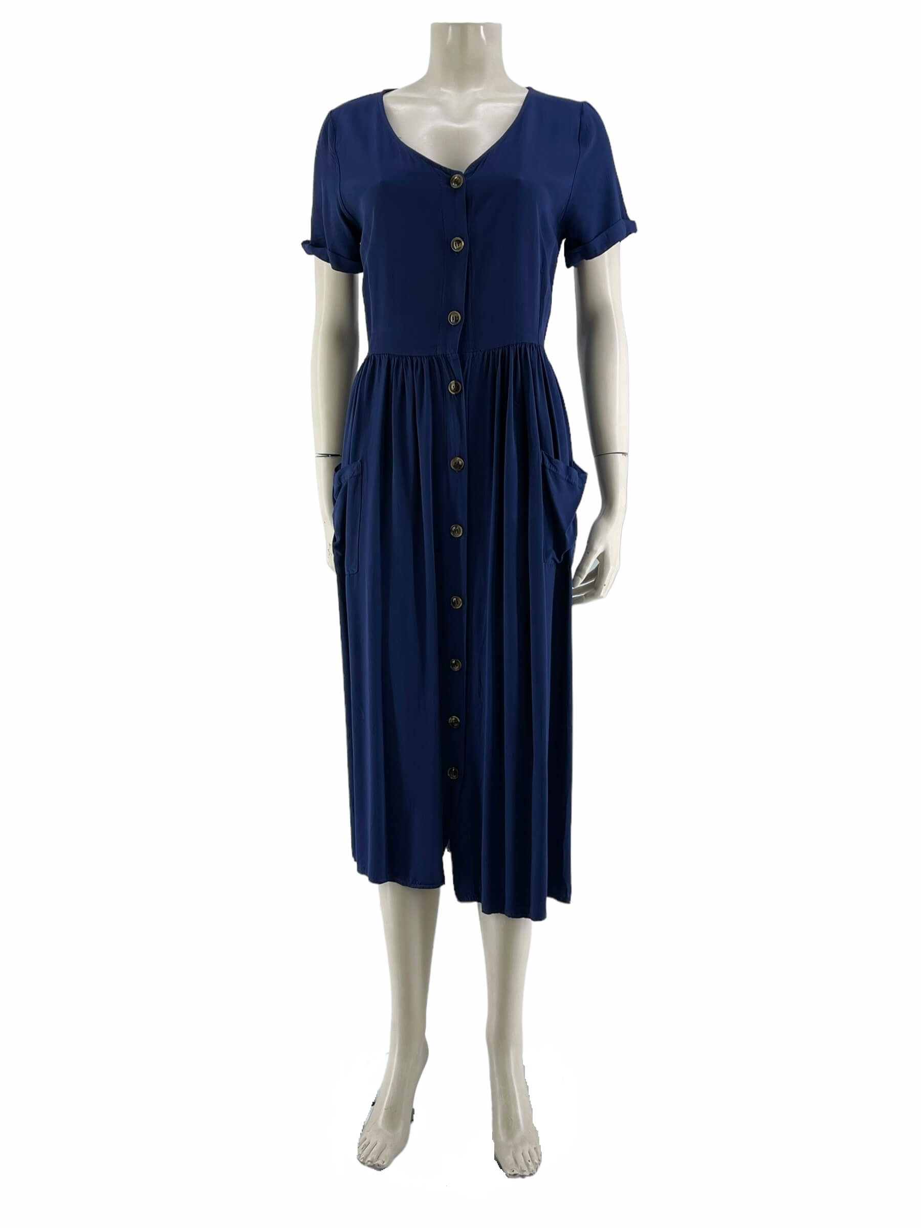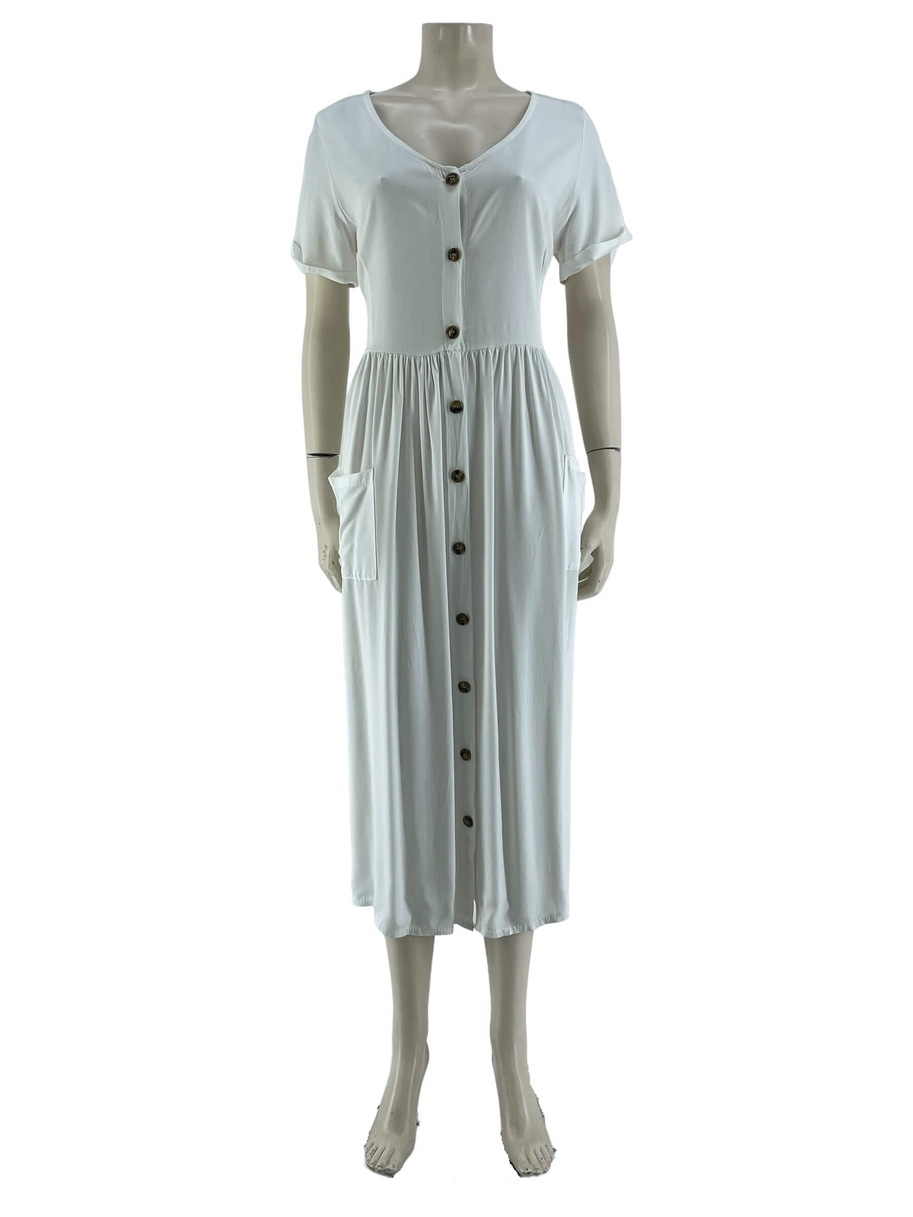 Φόρεμα μονόχρωμο βισκόζ,σταθερό ύφασμα με κουμπάκια στο εμπρός μέρος και τσέπες.Κοντό μανίκι.Ίσιο τελείωμα.Καλύπτει από νούμερα: M εώς XL.