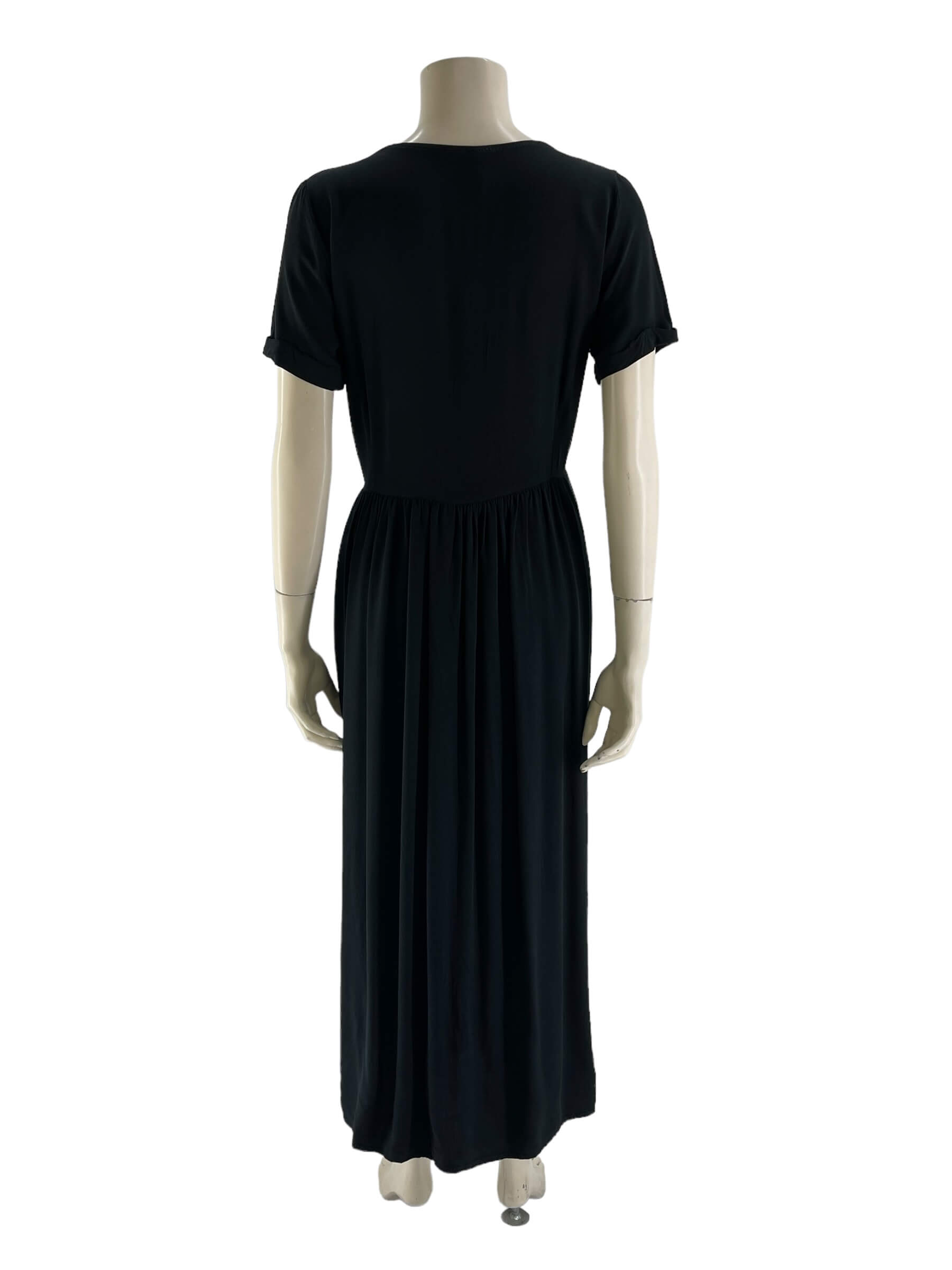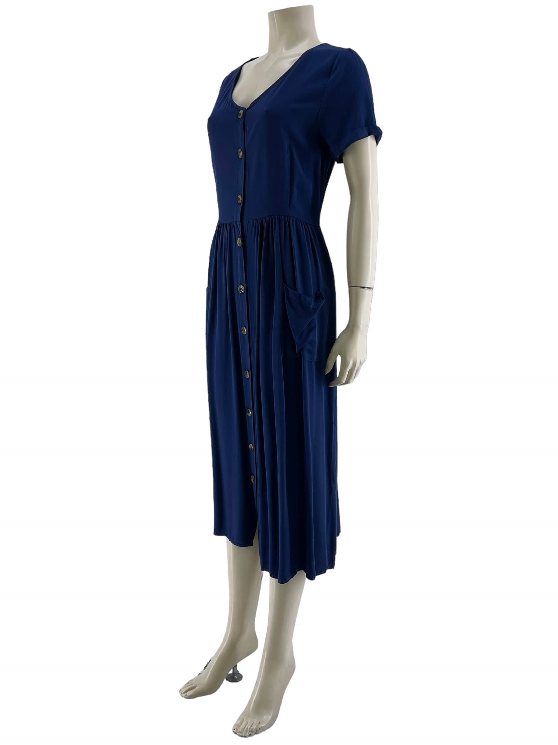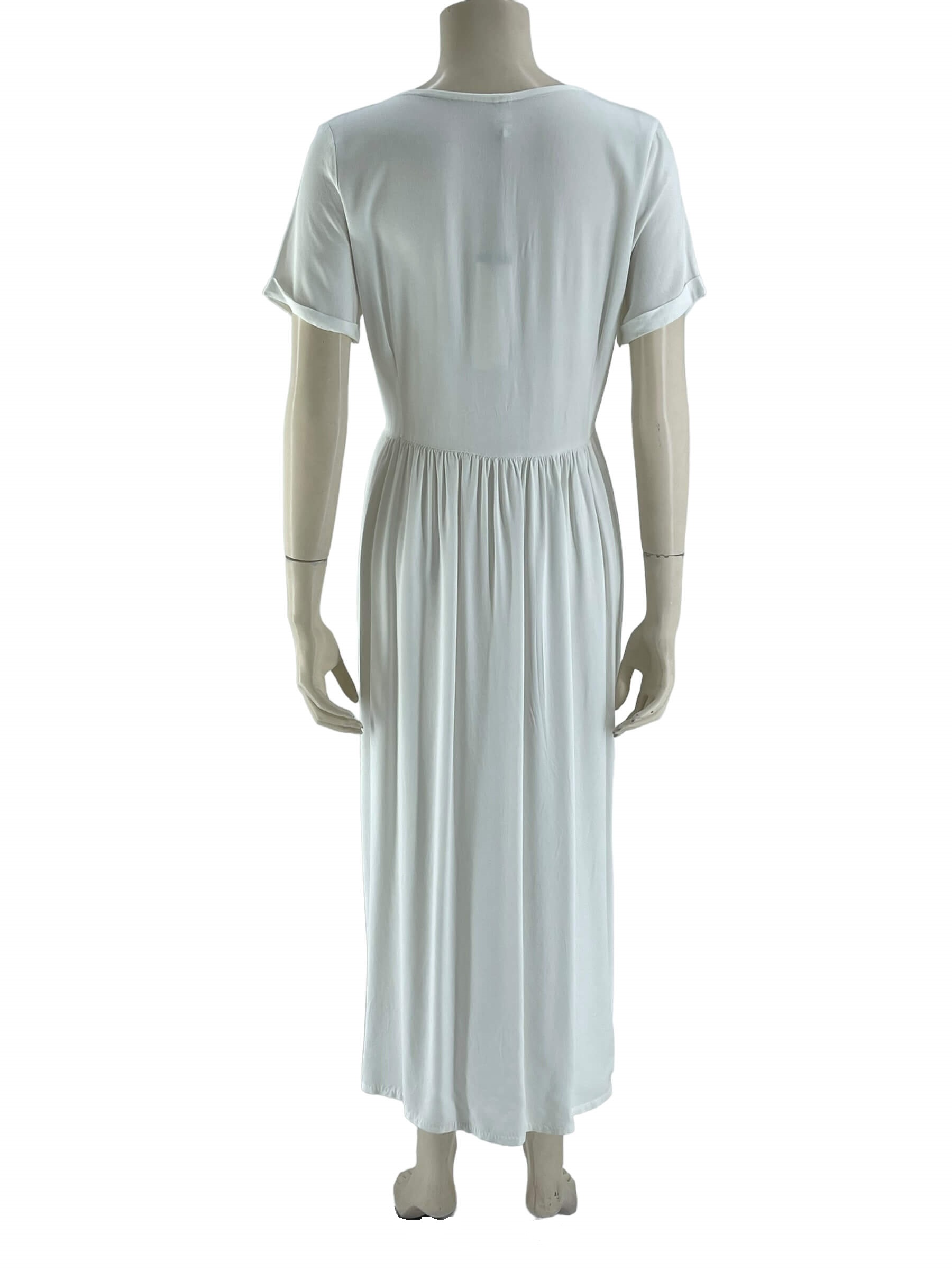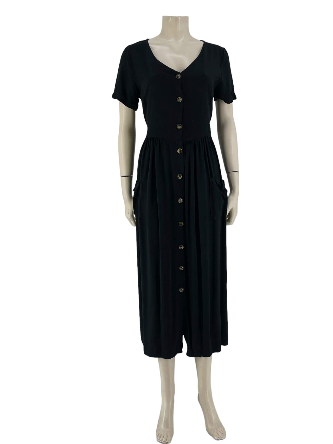 Φόρεμα μονόχρωμο βισκόζ,σταθερό ύφασμα με κουμπάκια στο εμπρός μέρος και τσέπες.Κοντό μανίκι.Ίσιο τελείωμα.Καλύπτει από νούμερα: M εώς XL.