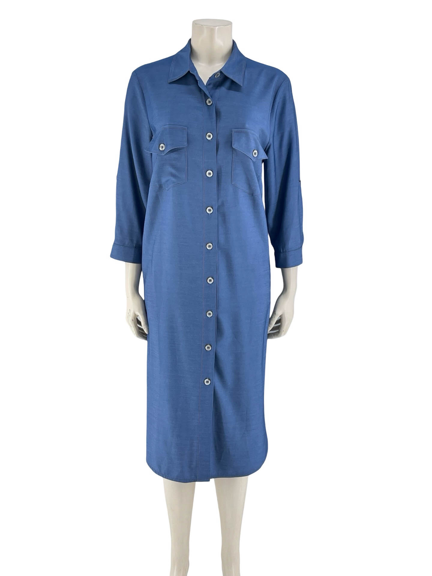 Φόρεμα γυναικείο τζιν σεμιζιέ με πέτο γιακά. Τσέπες στο εμπρός μέρος. Ημίκοντο μανίκι με μανσέτα γυριστό με κουμπί. Στρογγυλό τελείωμα. Κανονική γραμμή. Στην τιμή δεν συμπεριλαμβάνεται η ζώνη.