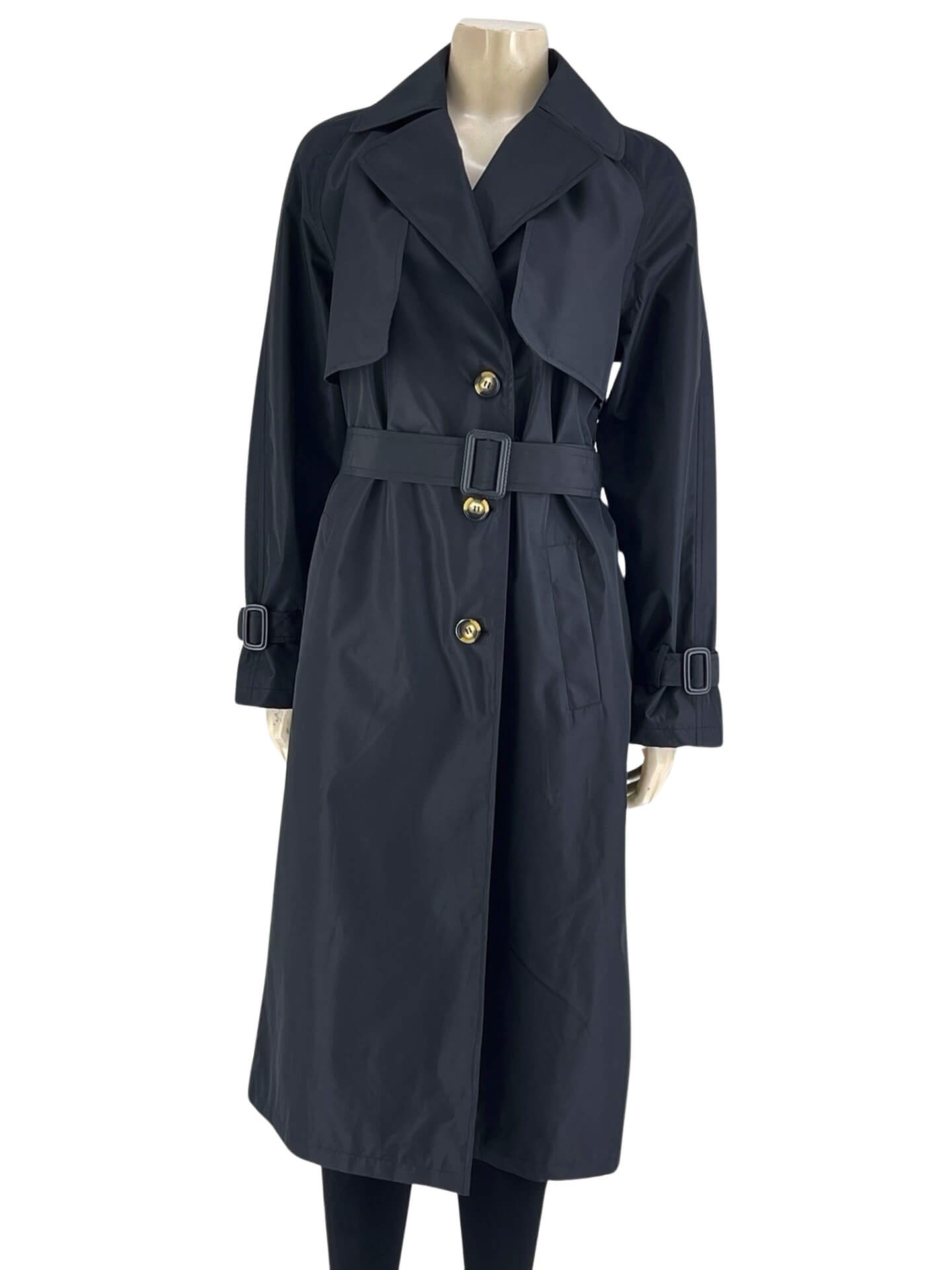 Καπαρντίνα γυναικεία εποχική, φοδραρισμένη στο εσωτερικό της. Πέτο γιακά. Κλείσιμο σταυρωτά με κουμπιά. Ζώνη στην μέση. Κανονική γραμμή.