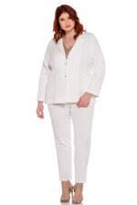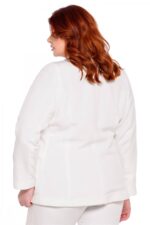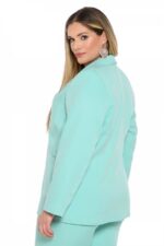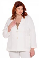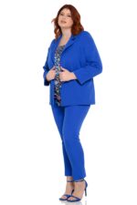 Κουστούμι γυναικείο μονόχρωμο, ελαστικό σακάκι με πέτο γιακά, φοδραρισμένο στο εσωτερικό του, τσέπες στο εμπρός μέρος και κλείσιμο με δύο κουμπιά. Παντελόνι ελαστικό σε ίσια γραμμή, κλείσιμο με κουμπί και φερμουάρ. Μεγάλο μέγεθος.