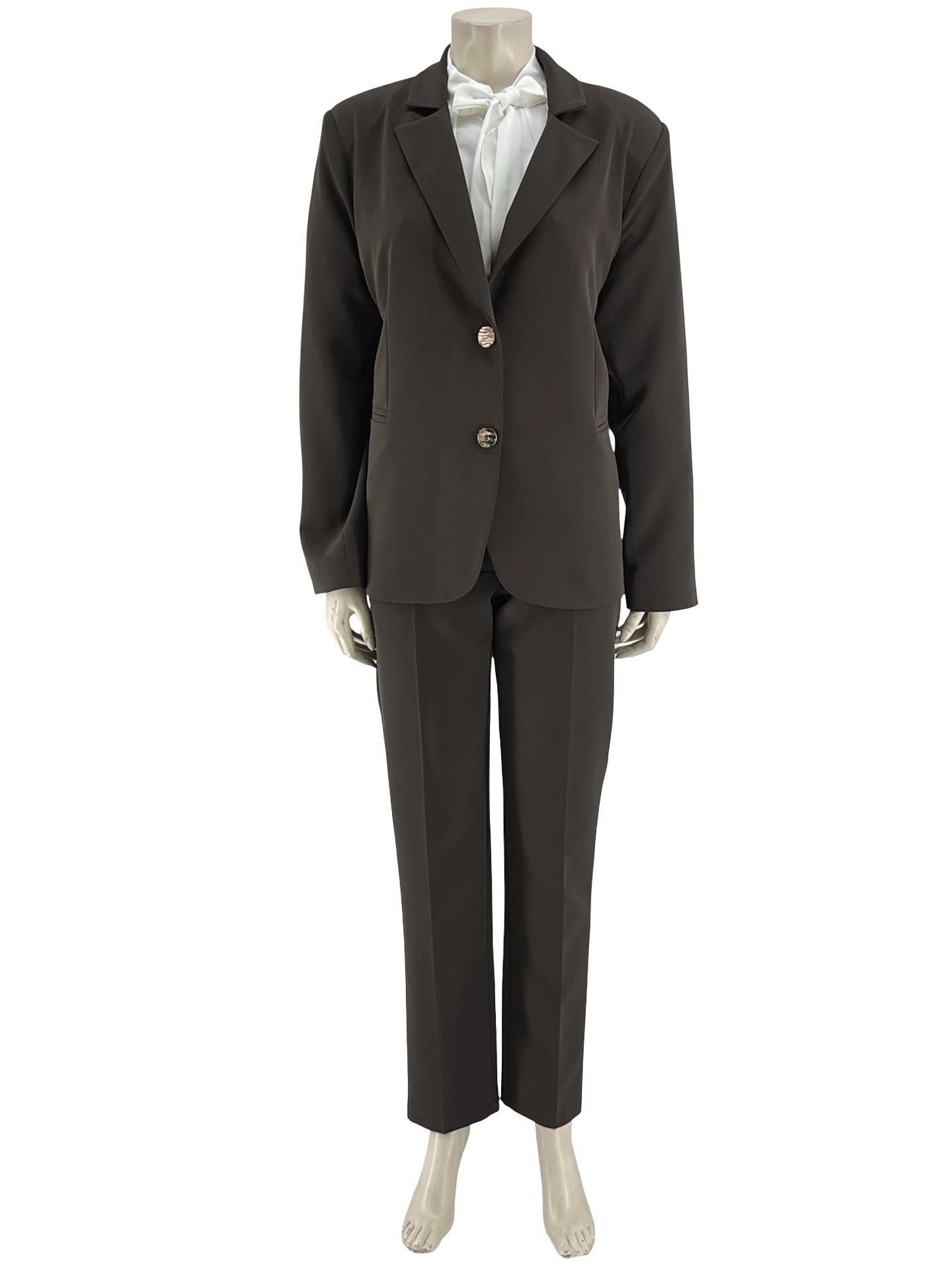 Κουστούμι γυναικείο μονόχρωμο, ελαστικό. Σακάκι με πέτο γιακά, φοδραρισμένο στο εσωτερικό του, δίκουμπο. Παντελόνι ελαστικό με τσέπες κοφτές στα πλαϊνά. Κλείσιμο με κουμπί και φερμουάρ. Κανονική γραμμή.