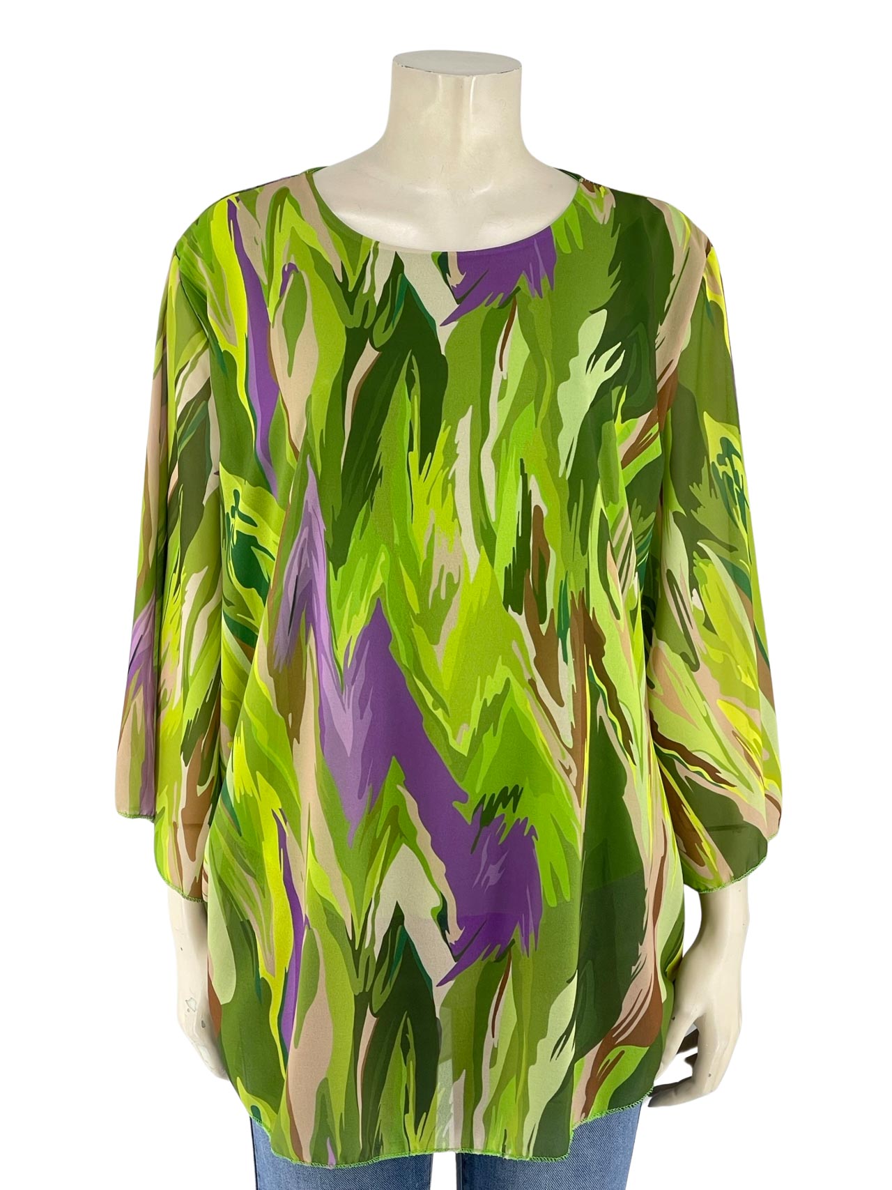 Μπλούζα γυναικεία ζορζέτα, λαιμόκοψη, φοδραρισμένη στο εσωτερικό της. Μανίκι καμπάνα διαφανές. Στρογγυλό τελείωμα. Καλύπτει από ΝοL έως Νο3XL.