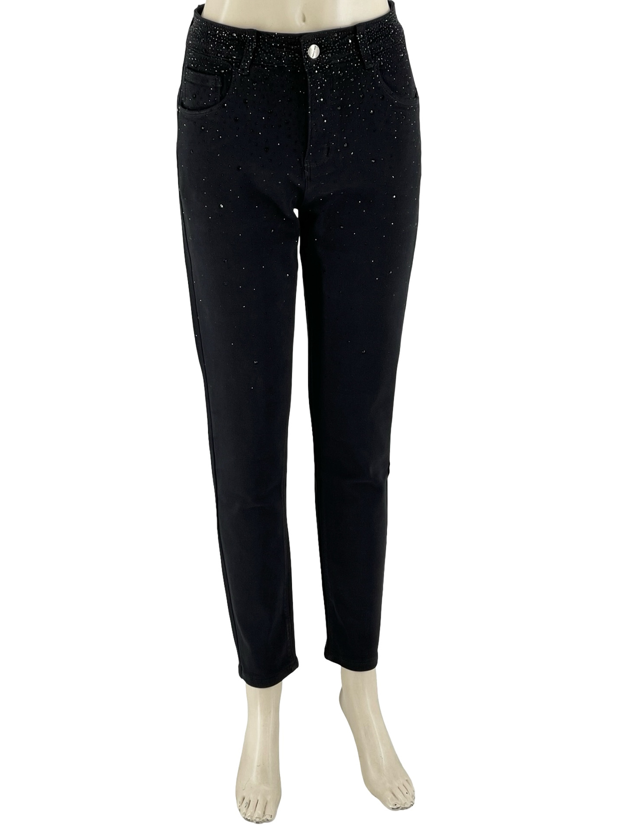 Παντελόνι γυναικείο καπαρντίνα, ελαστικό, πεντάτσεπο, με στρας μαύρα στο μισό εμπρός και πίσω μέρος.