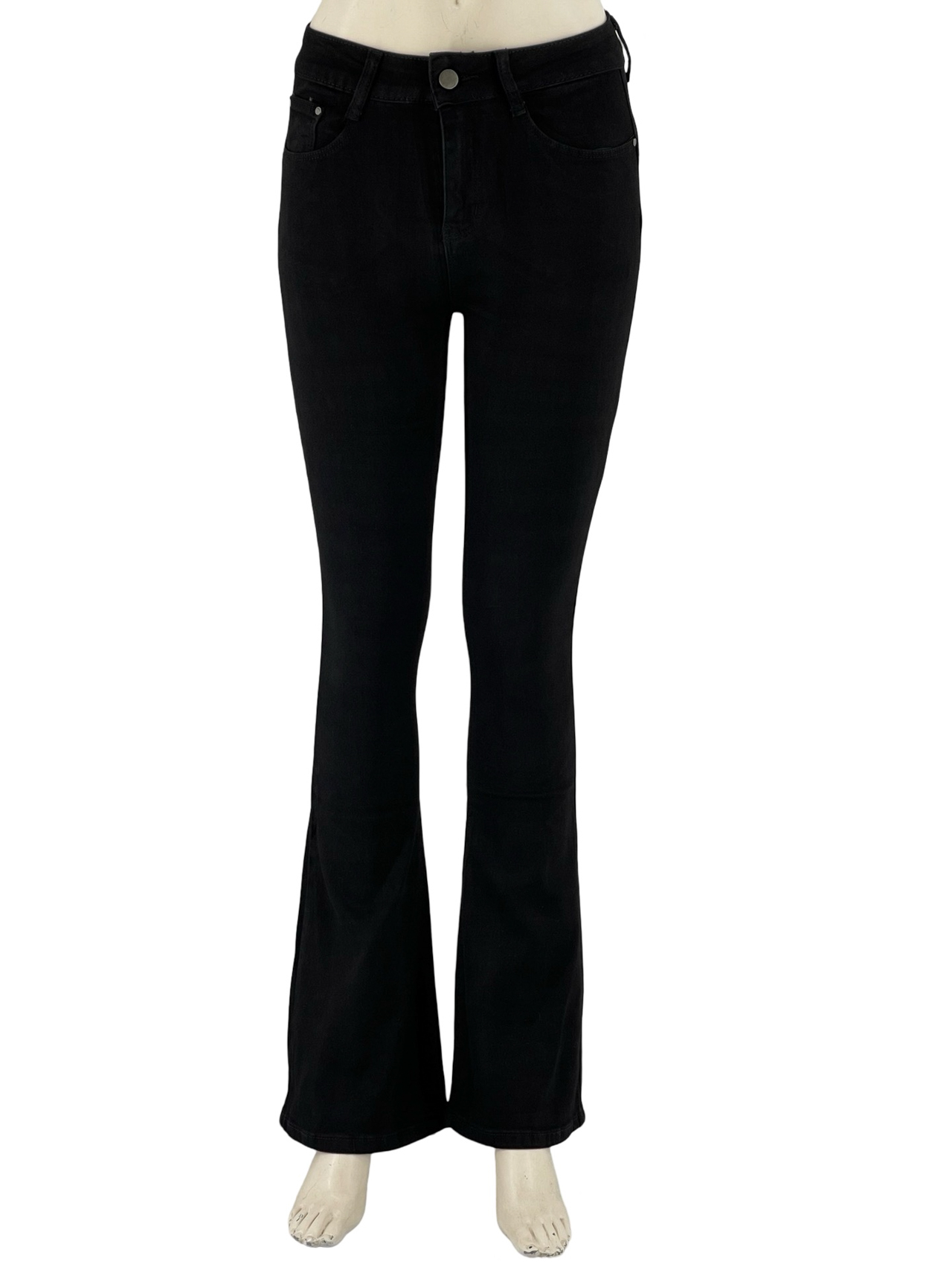 Παντελόνι γυναικείο ψηλόμεσο, ελαστικό, πεντάτσεπο, καμπάνα. Κλείσιμο με φερμουάρ και κουμπί. Κανονική γραμμή.
