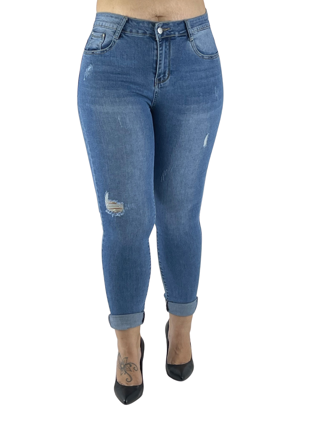 Παντελόνι γυναικείο τζιν ελαστικό, ανοιχτόχρωμο με φθορές και ανοίγματα. Κλείσιμο με κουμπί και φερμουάρ.