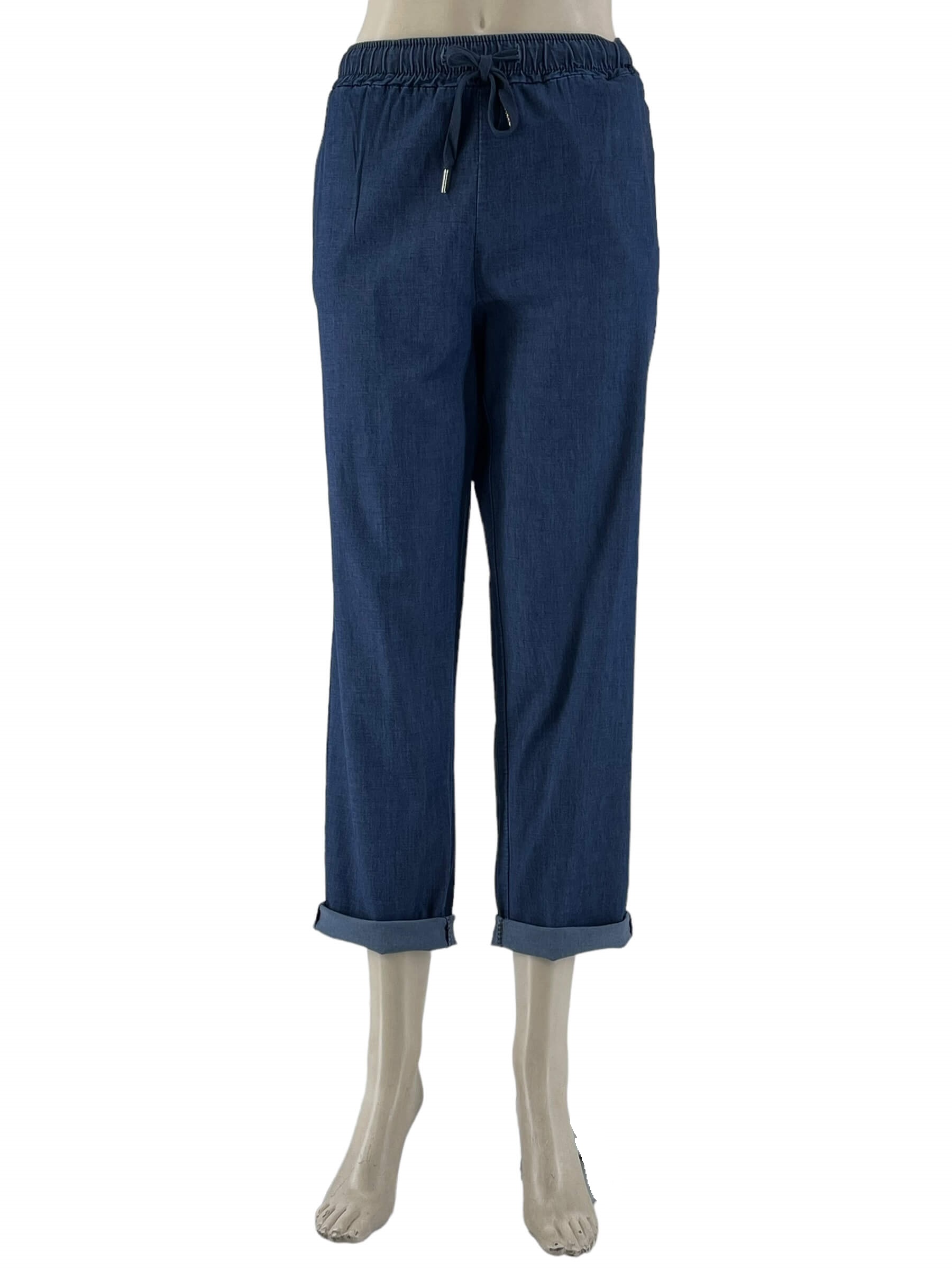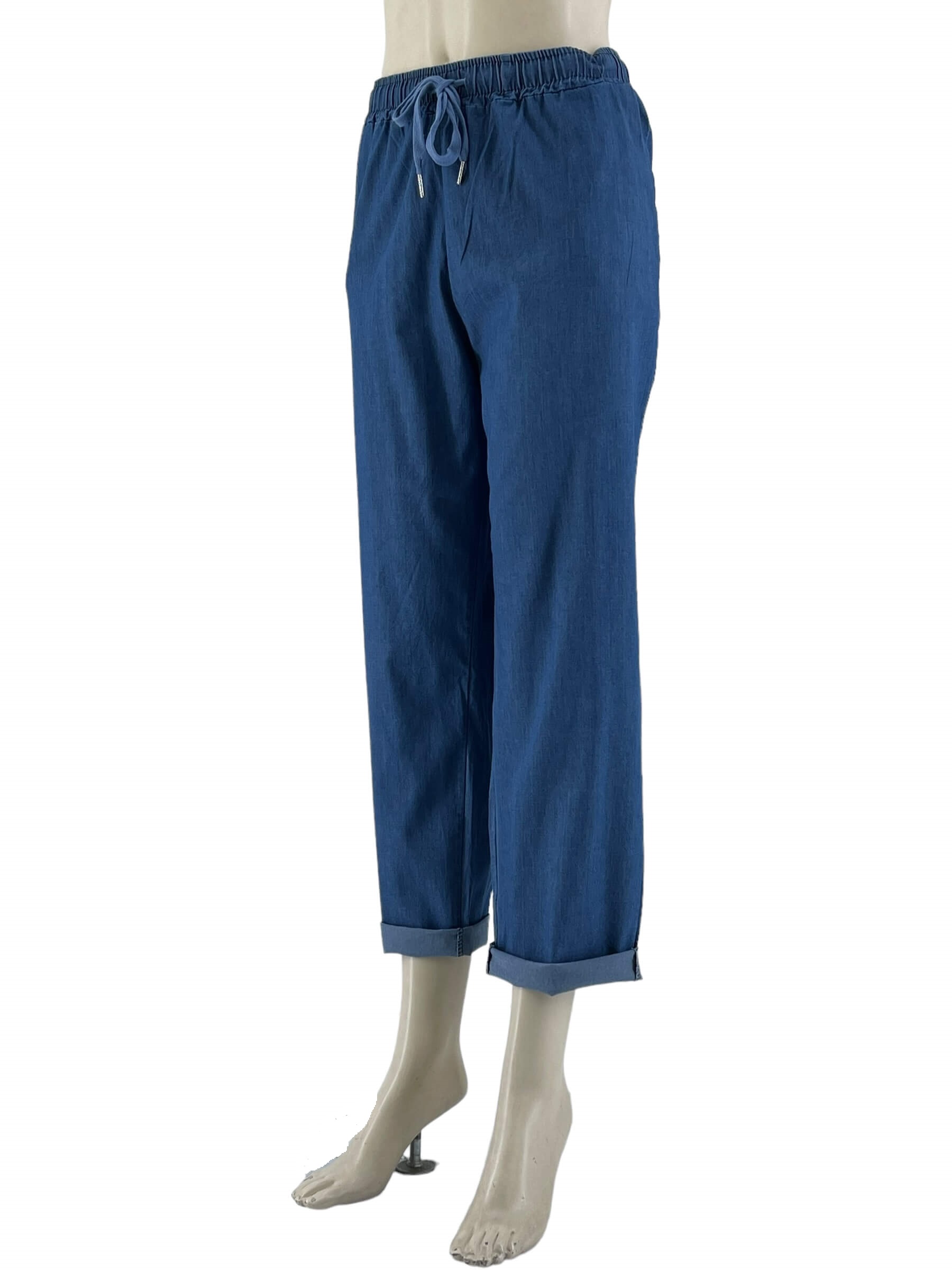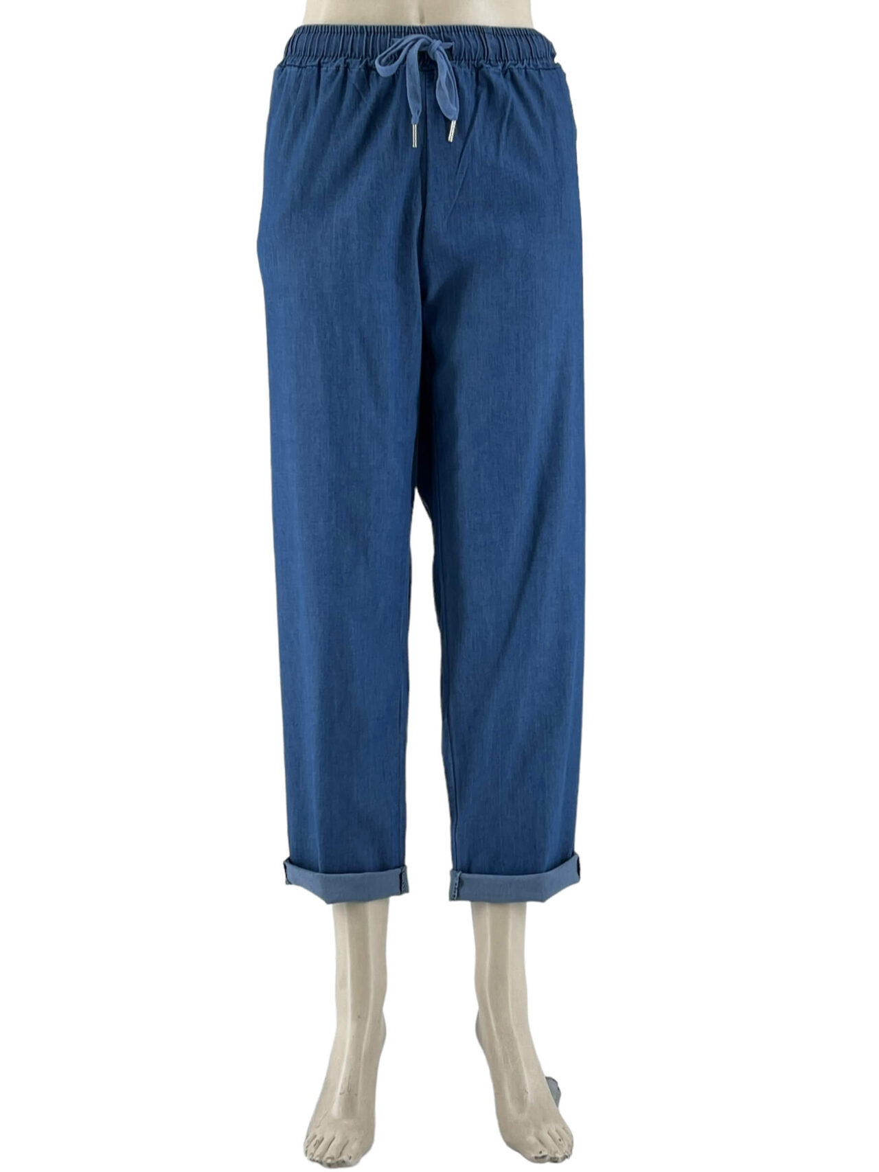 Παντελόνι τζιν ελαστικό με λάστιχο στην μέση και κορδόνι αυξομείωσης. Τσέπες κοφτές στα πλαϊνά. Ψιλό, δροσερό τζιν σε ίσια γραμμή. Μεγάλο μέγεθος.