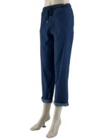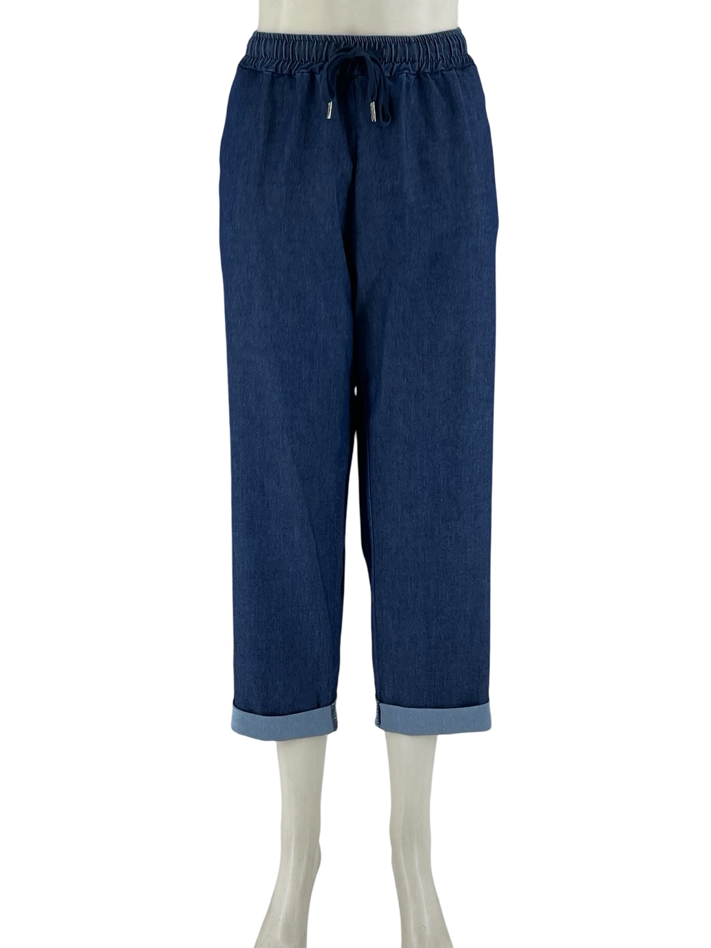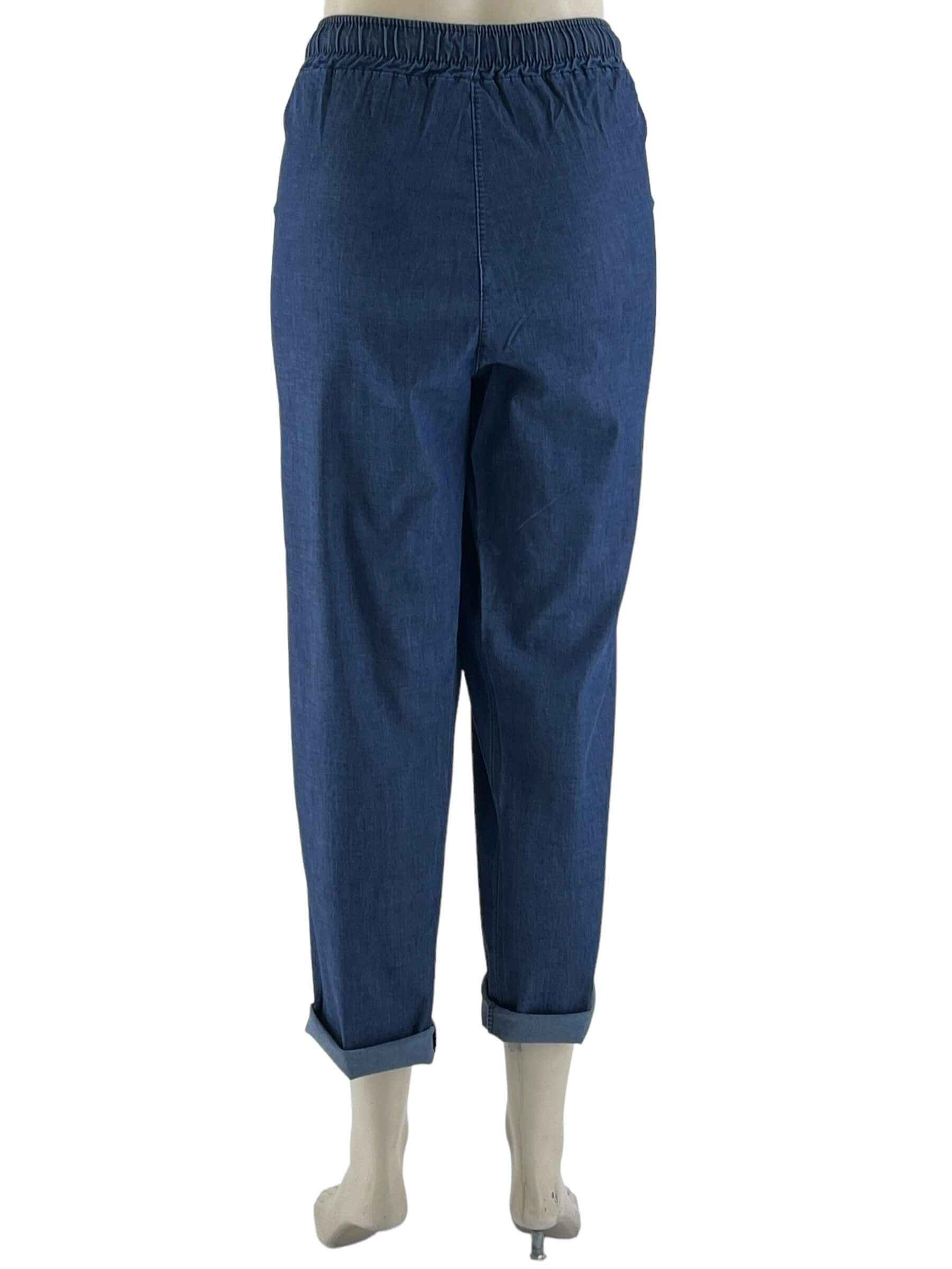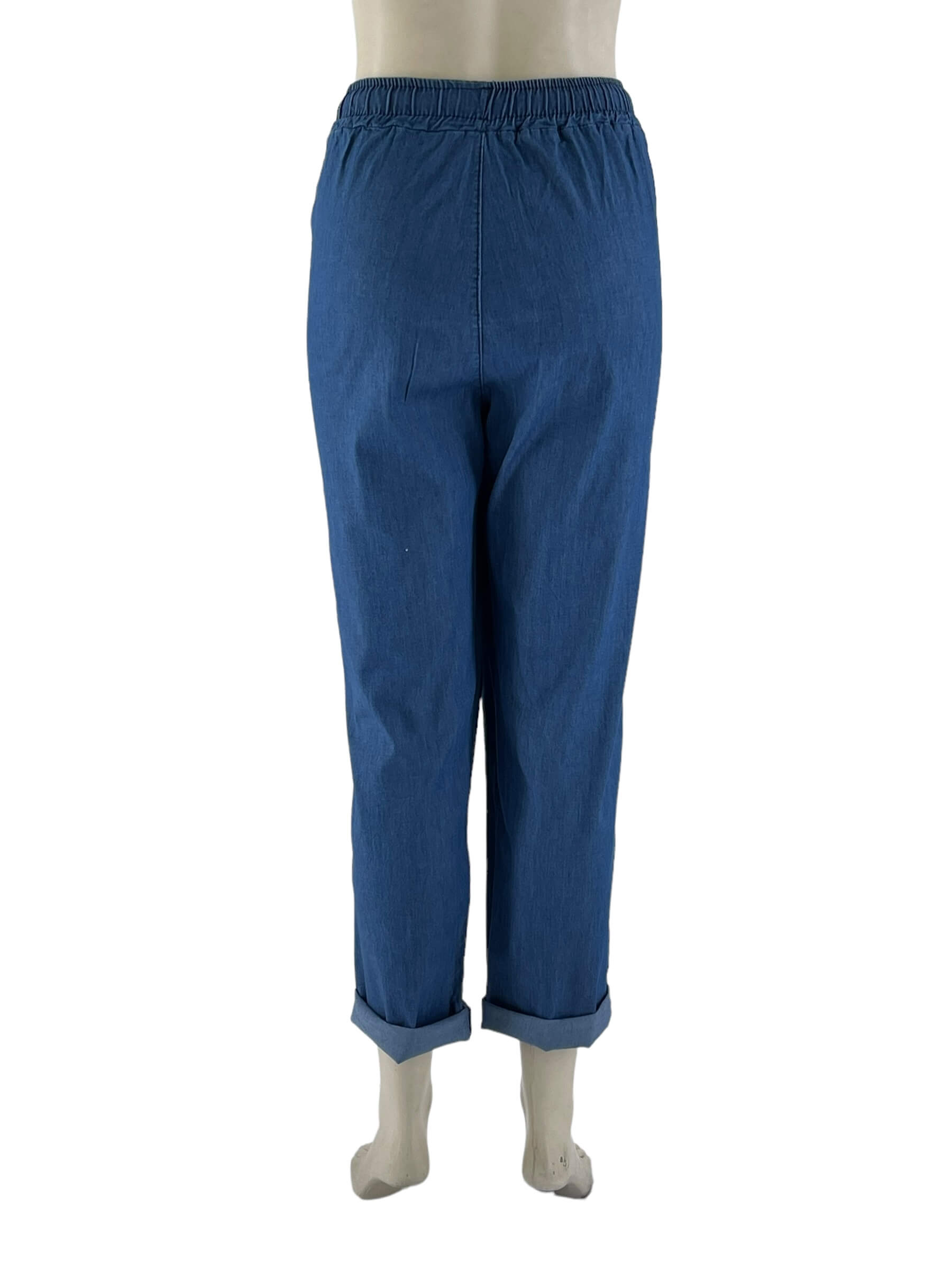 Παντελόνι τζιν ελαστικό με λάστιχο στην μέση και κορδόνι αυξομείωσης. Τσέπες κοφτές στα πλαϊνά. Ψιλό, δροσερό τζιν σε ίσια γραμμή. Μεγάλο μέγεθος.