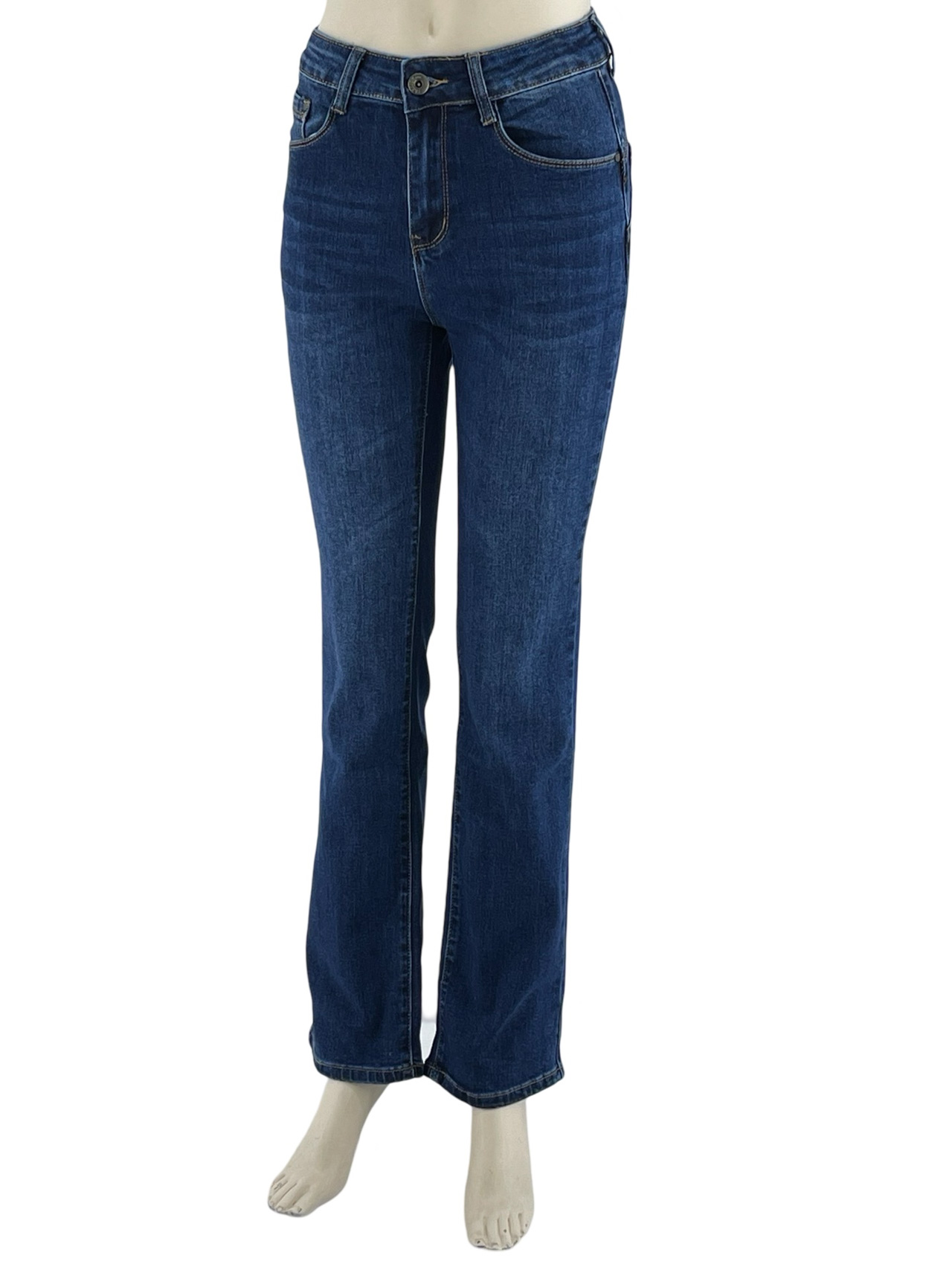 Παντελόνι γυναικείο τζιν ελαστικό, πεντάτσεπο push up. Ελαφρώς ξεβάμματα στο εμπρός μέρος, κλείσιμο με κουμπί και φερμουάρ εμπρός. Ίσια γραμμή.