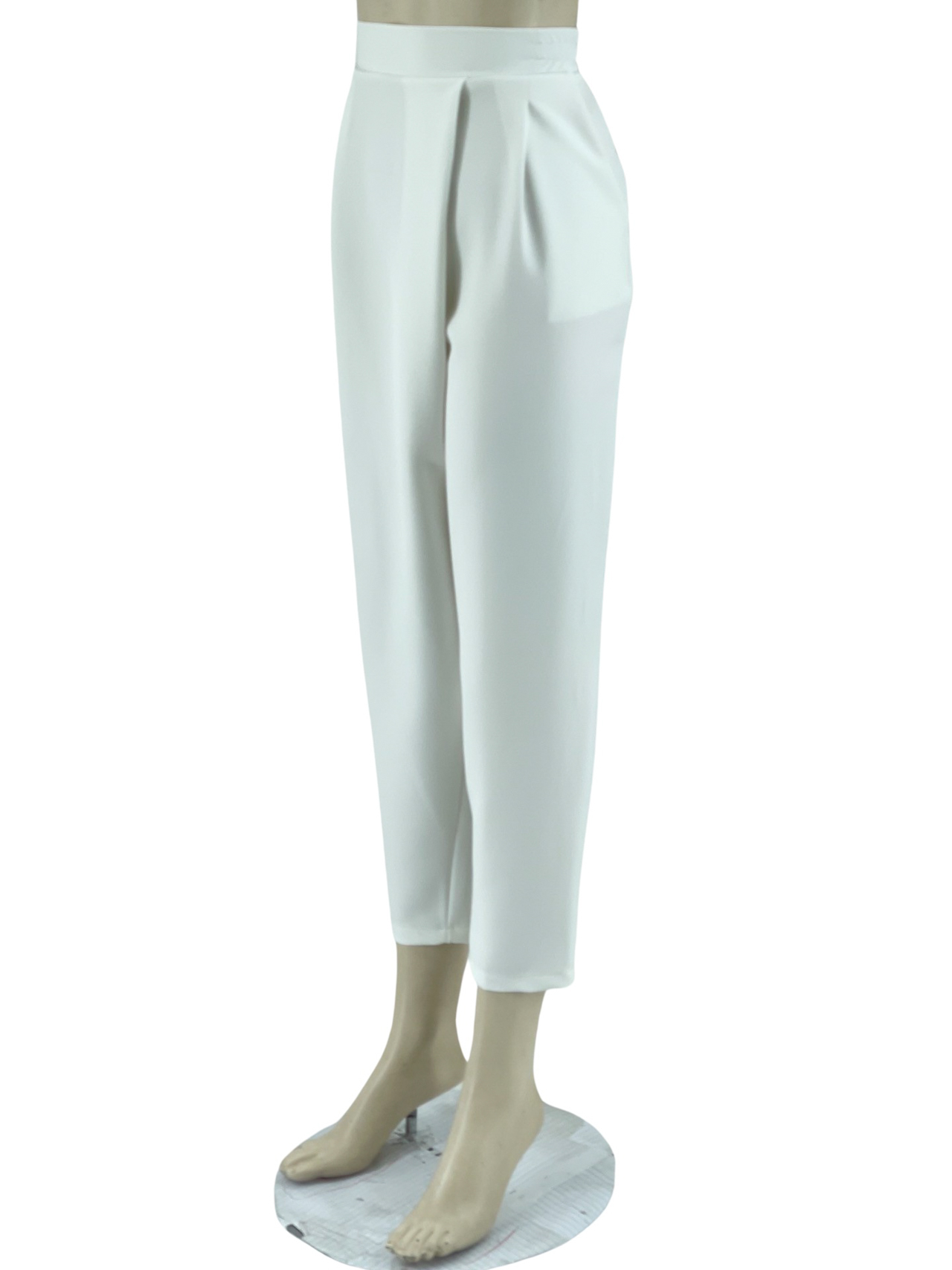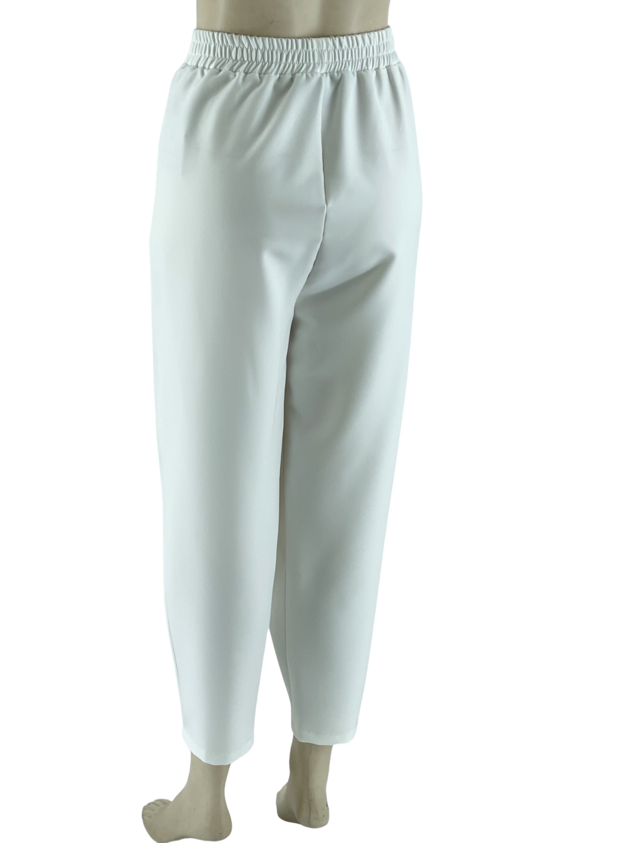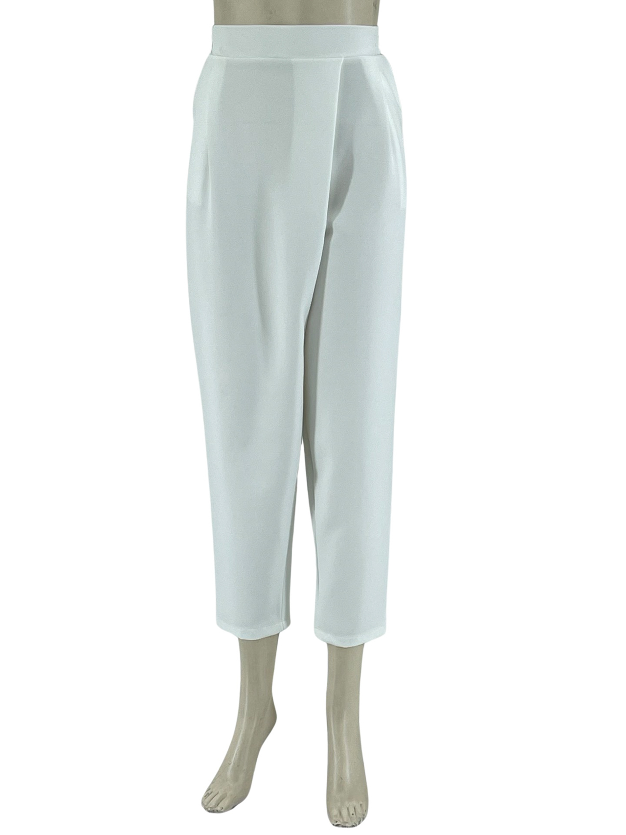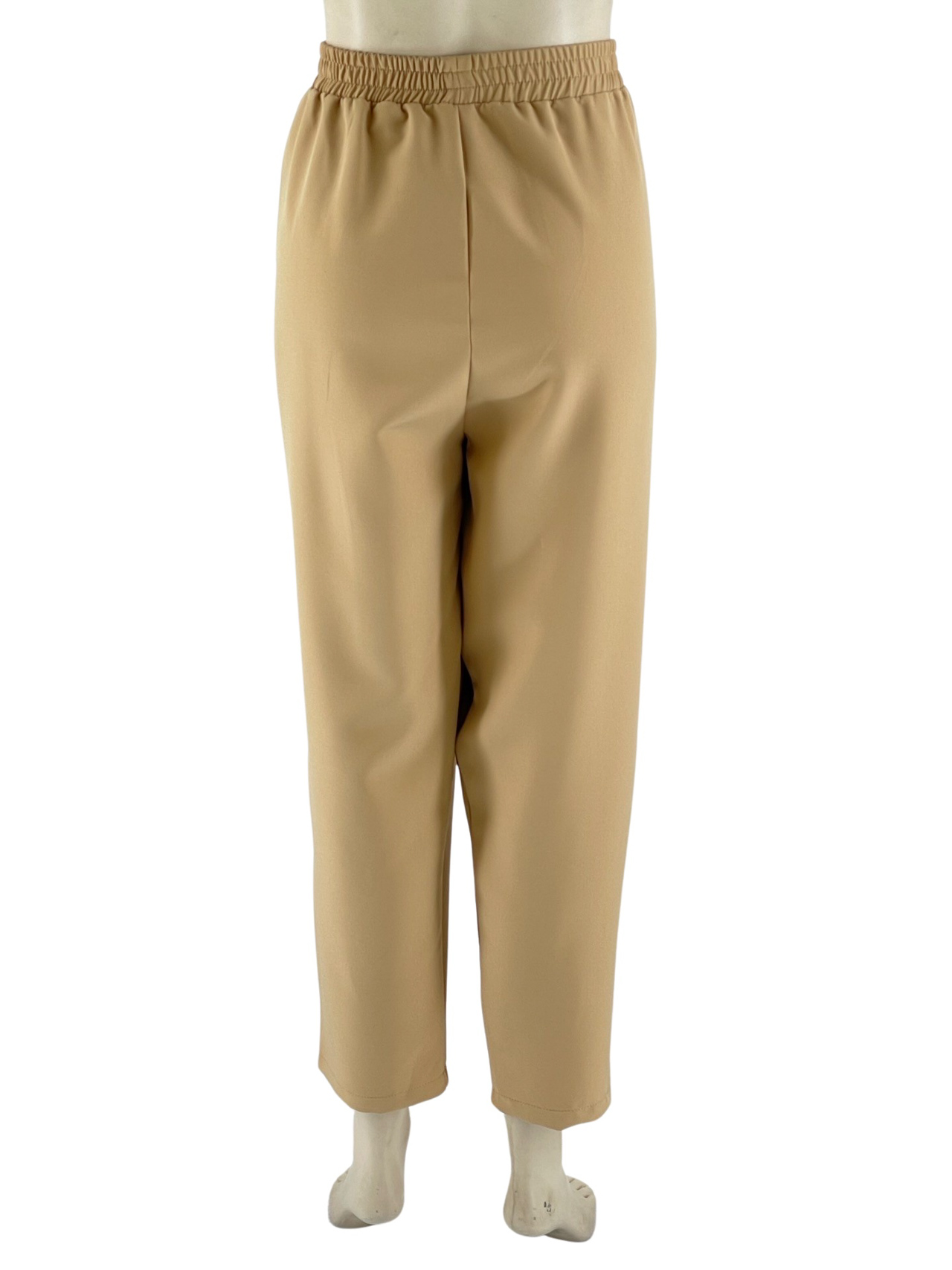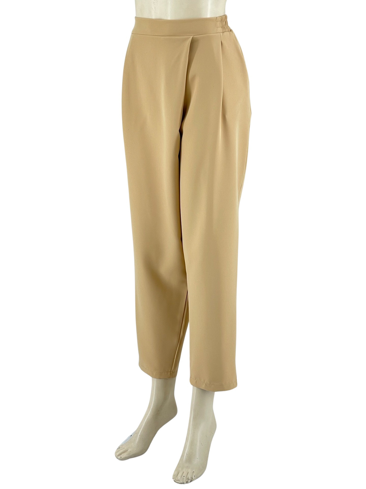 Παντελόνι γυναικείο υφασμάτινο, ελαστικό με πιέτες στο εμπρός μέρος και λάστιχο στο πίσω μέρος της μέσης. Κοφτές τσέπες στα πλαϊνά, στενεύει προς τα κάτω και είναι στα 7/8. Μεγάλο μέγεθος.
