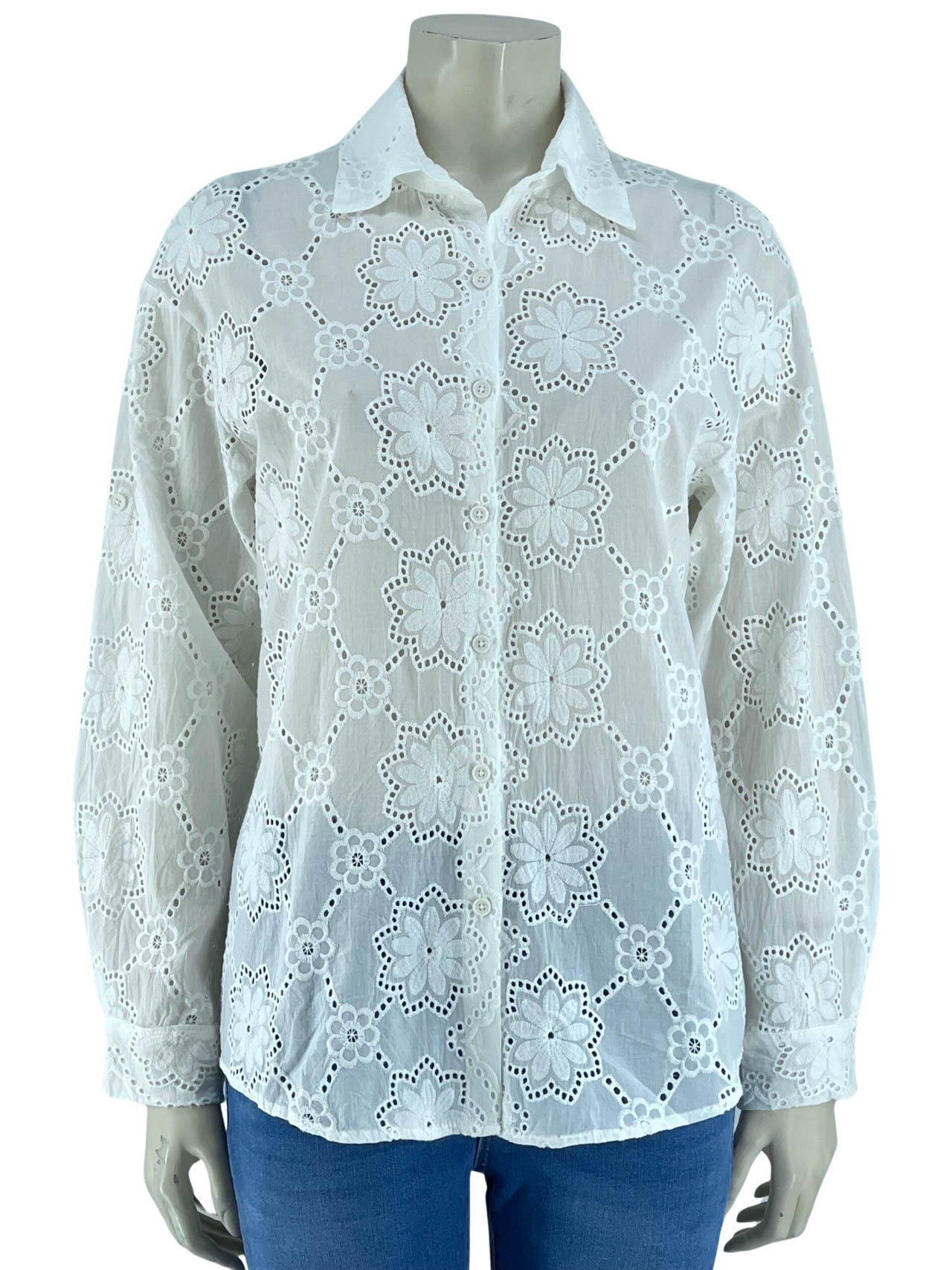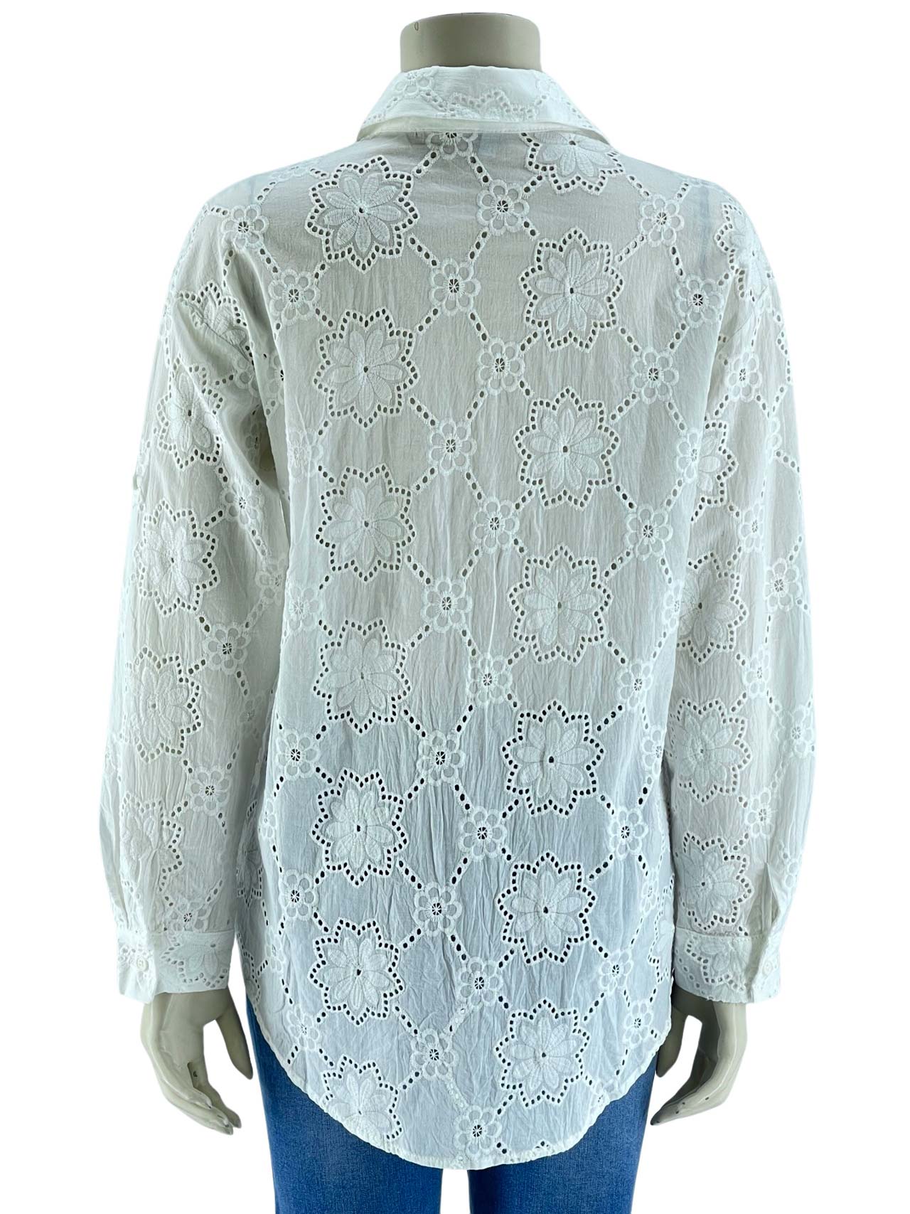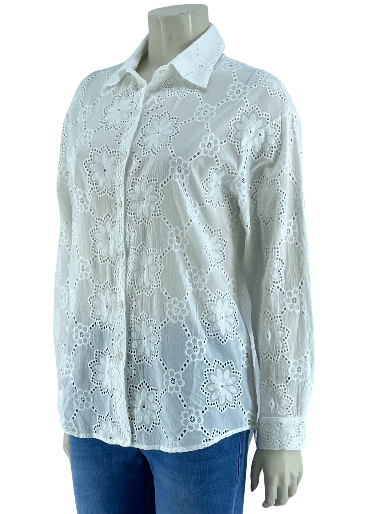 Πουκάμισο μπροντερί με πέτο γιακά, κλείσιμο με κουμπάκια στο εμπρός μέρος, μακρύ μανίκι με γύρισμα και κουμπί. Ασύμμετρο τελείωμα. Κανονική γραμμή.