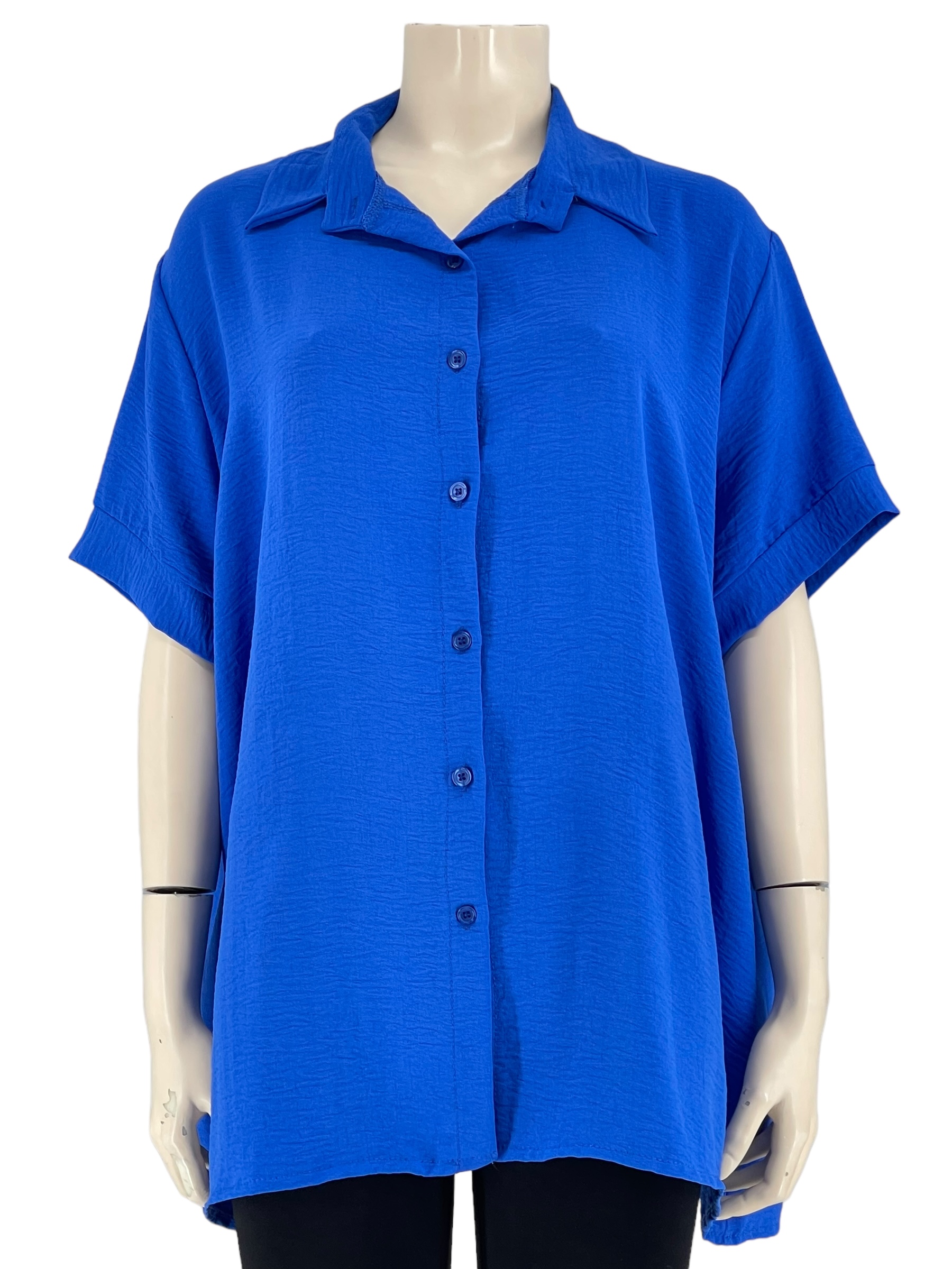 Πουκάμισο μονόχρωμο σε τσαλακωτό ύφασμα, ελαστικό, με πέτο γιακά. Κλείσιμο με κουμπάκια στο εμπρός μέρος. Ίσιο τελείωμα. Κοντό μανίκι. Καλύπτει από ΝοM έως Νο2XL.