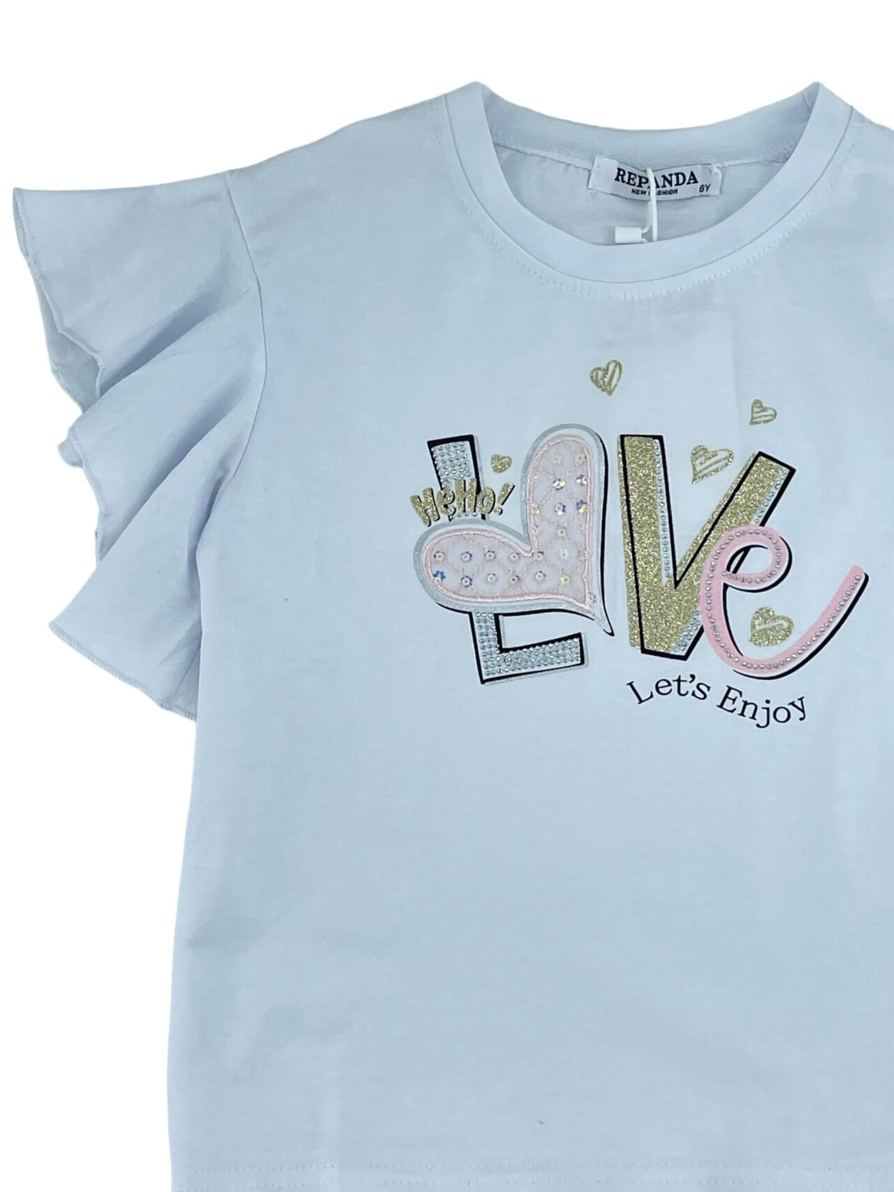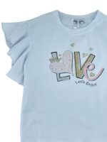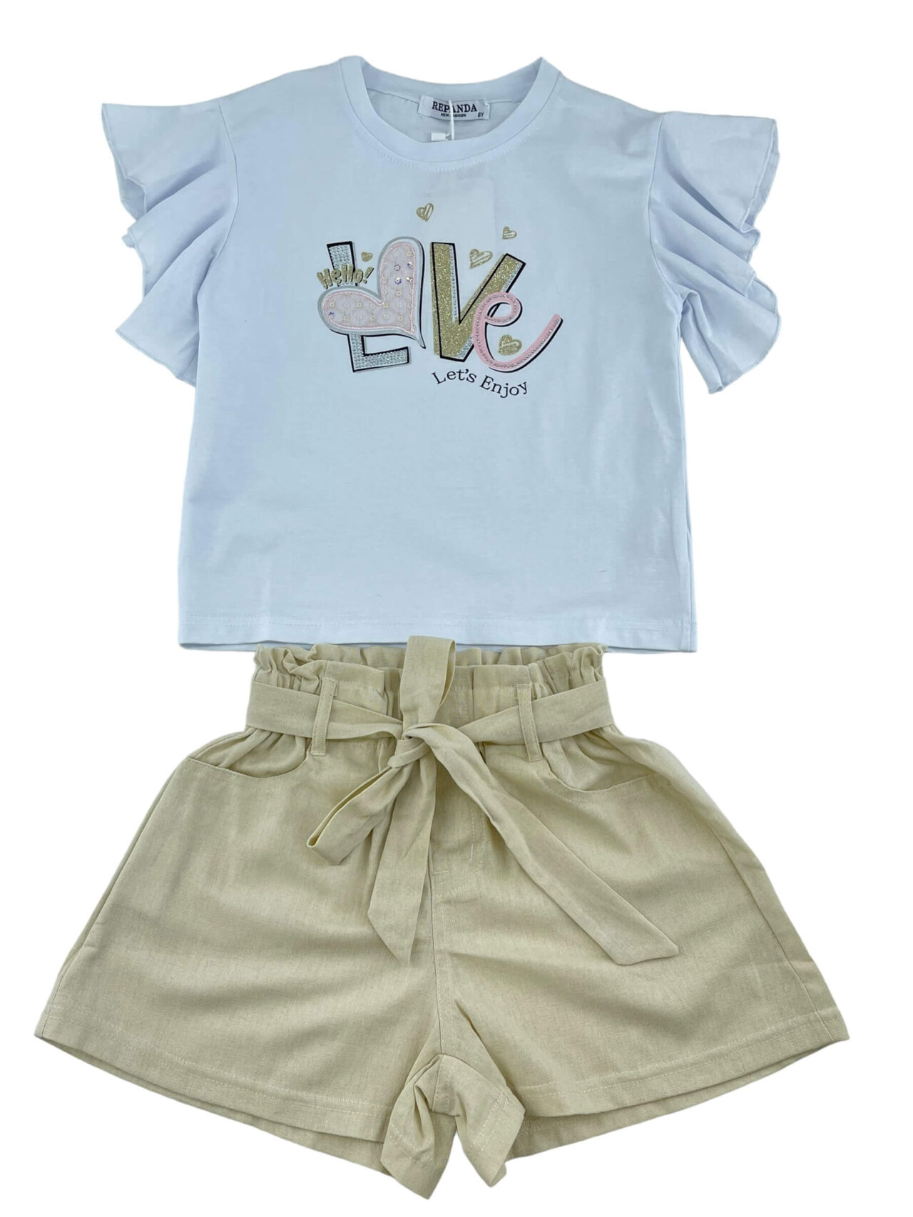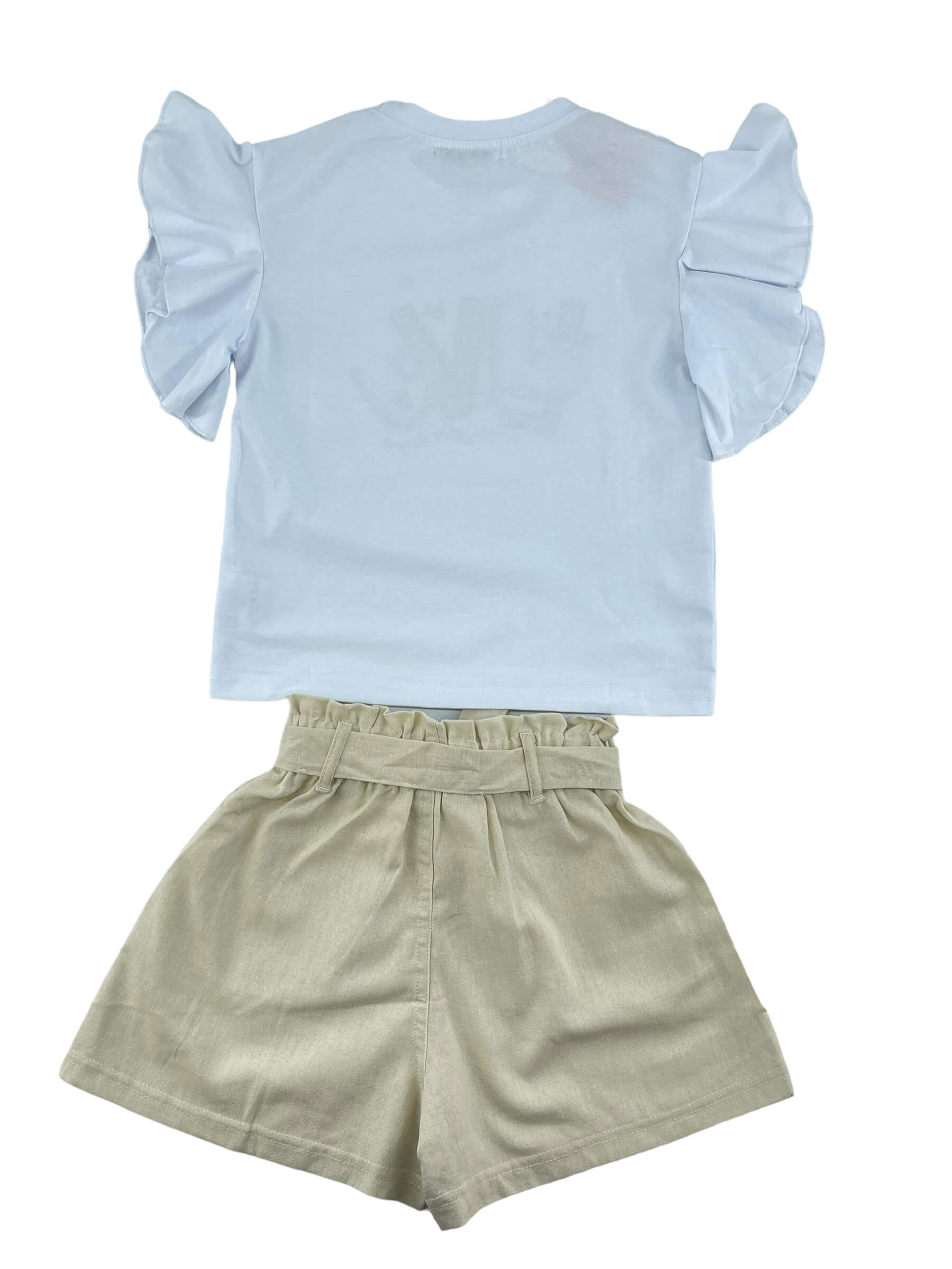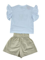 Σετ μπλουζάκι βαμβακερό,ελάστικο λαιμόκοψη με στάμπα εμπρός.Μανίκια με βολάν.Σορτσάκι λινό με λάστιχο στην μέση και ίδιο υφασμάτινο ζωνάκι.Τσέπες στο εμπρός μέρος.