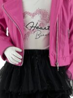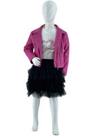Σετ κορίτσι μπουφάν δερματίνη αφοδράριστο με πέτο γιακά και λοξό κλείσιμο με φερμουάρ και στις τσέπες. Μπλουζάκι βαμβακολύτρα λαιμόκοψη με στάμπα στο εμπρός μέρος.Μακρύ μανίκι, φούστα τουτού με βολάν και παγιέτες.Λάστιχο στη μέση. Σύνθεση 65% cotton 30%polyester 5%elastan. Μπουφάν 55% polyester 45% polyrethane.