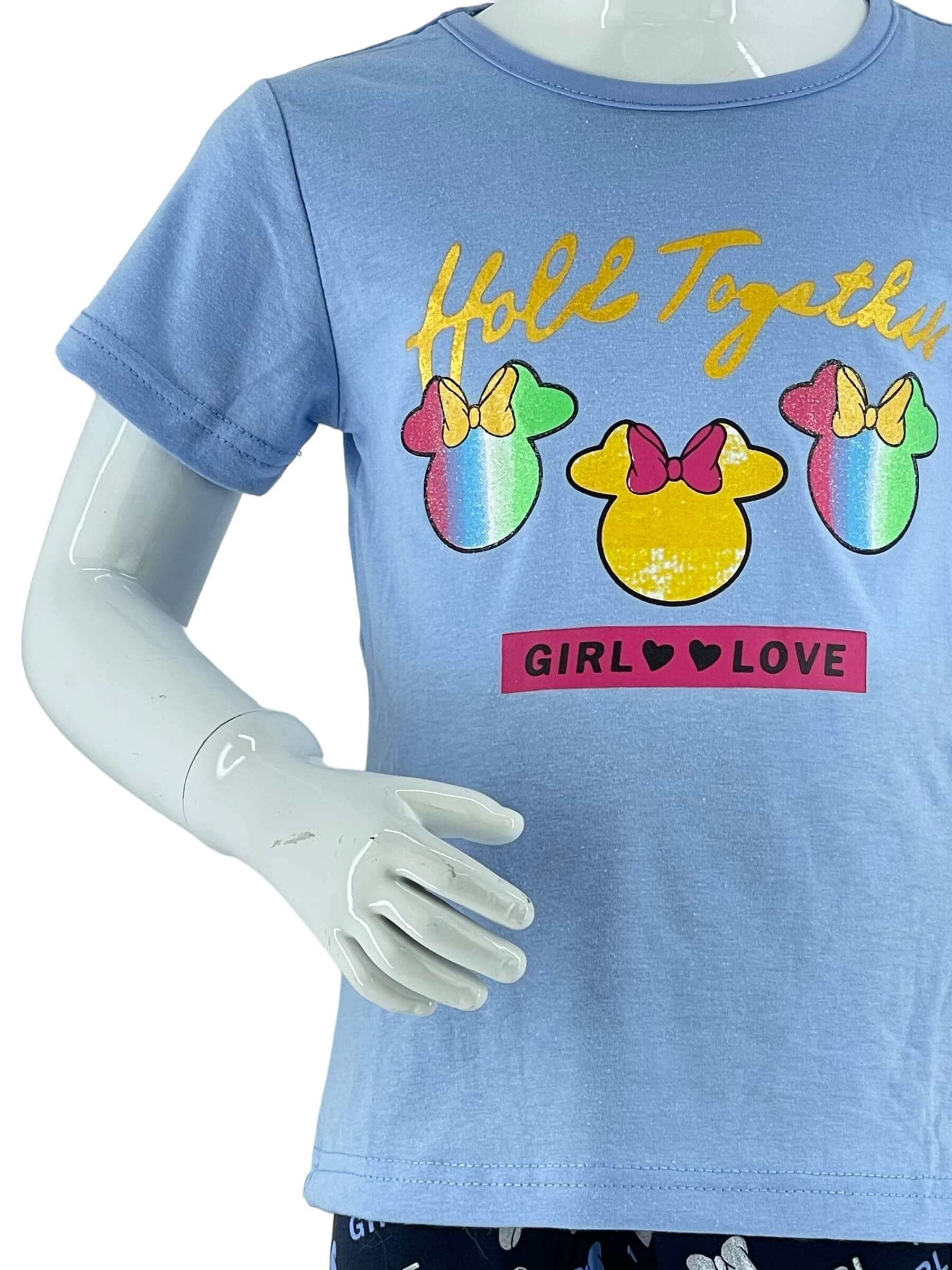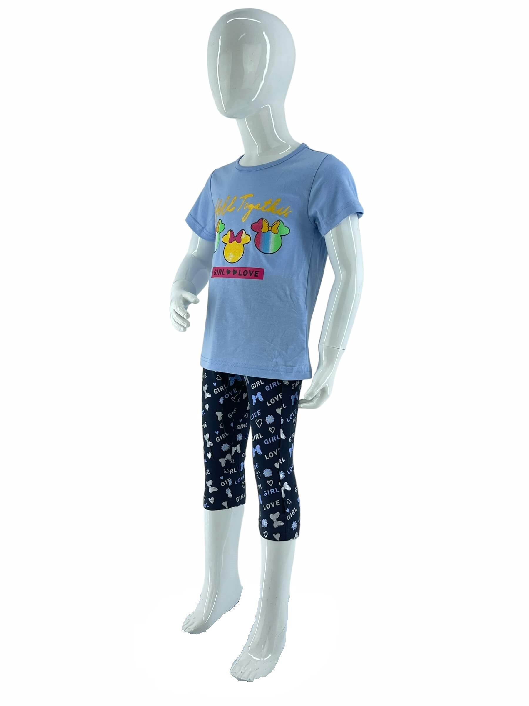 Σετ κορίτσι μπλούζα λαιμόκοψη με στάμπα στο εμπρός μέρος. Κοντό μανίκι. Κολάν κάπρι εμπριμέ με λάστιχο στην μέση.